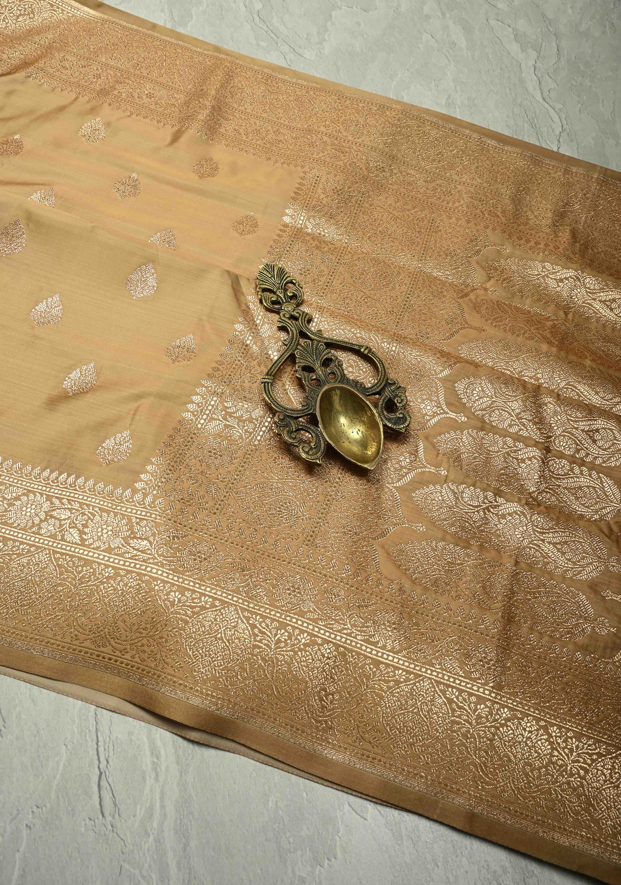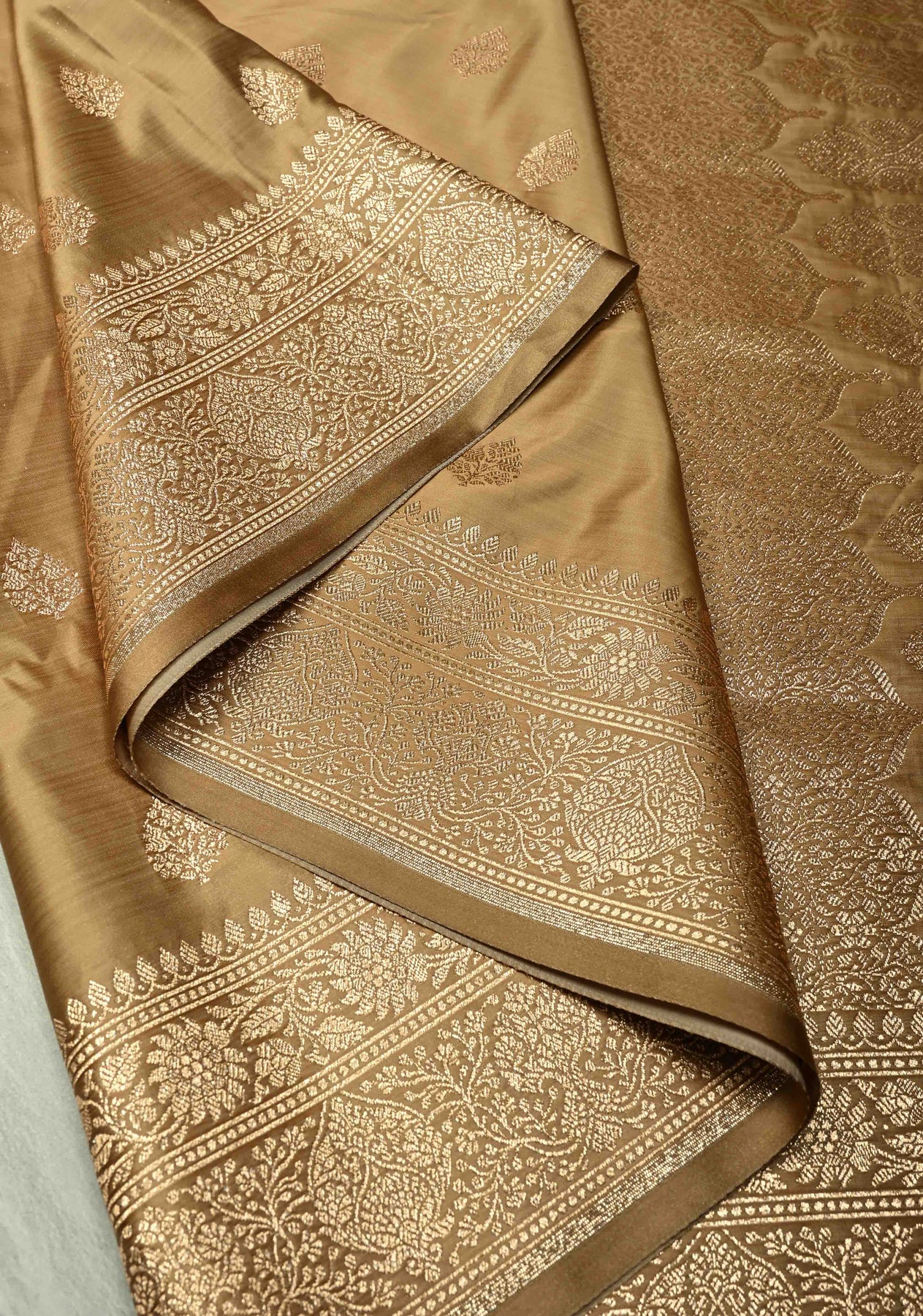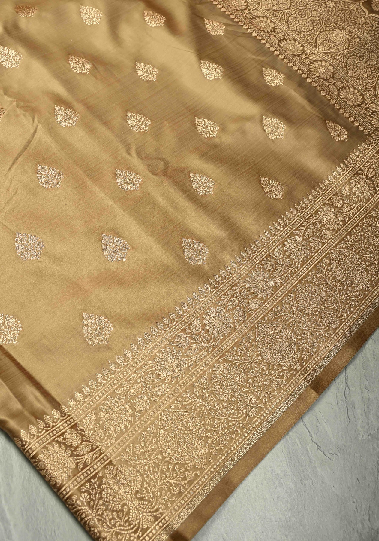 Gracefully blending tradition and, this Chiku Banarasi Semi Mashru Silk Saree is a masterpiece of intricate craftsmanship. Made from a premium semi-mashru silk fabric, the saree features delicate floral zari buttas scattered across its soft chiku base, adding subtle sparkle and elegance. The rich zari border frames the saree beautifully, enhancing its regal appeal and making it perfect for weddings, festive occasions, and special events. This saree effortlessly combines the classic charm of Banarasi weave with a lightweight, breathable texture ideal for comfortable, all-day wear.