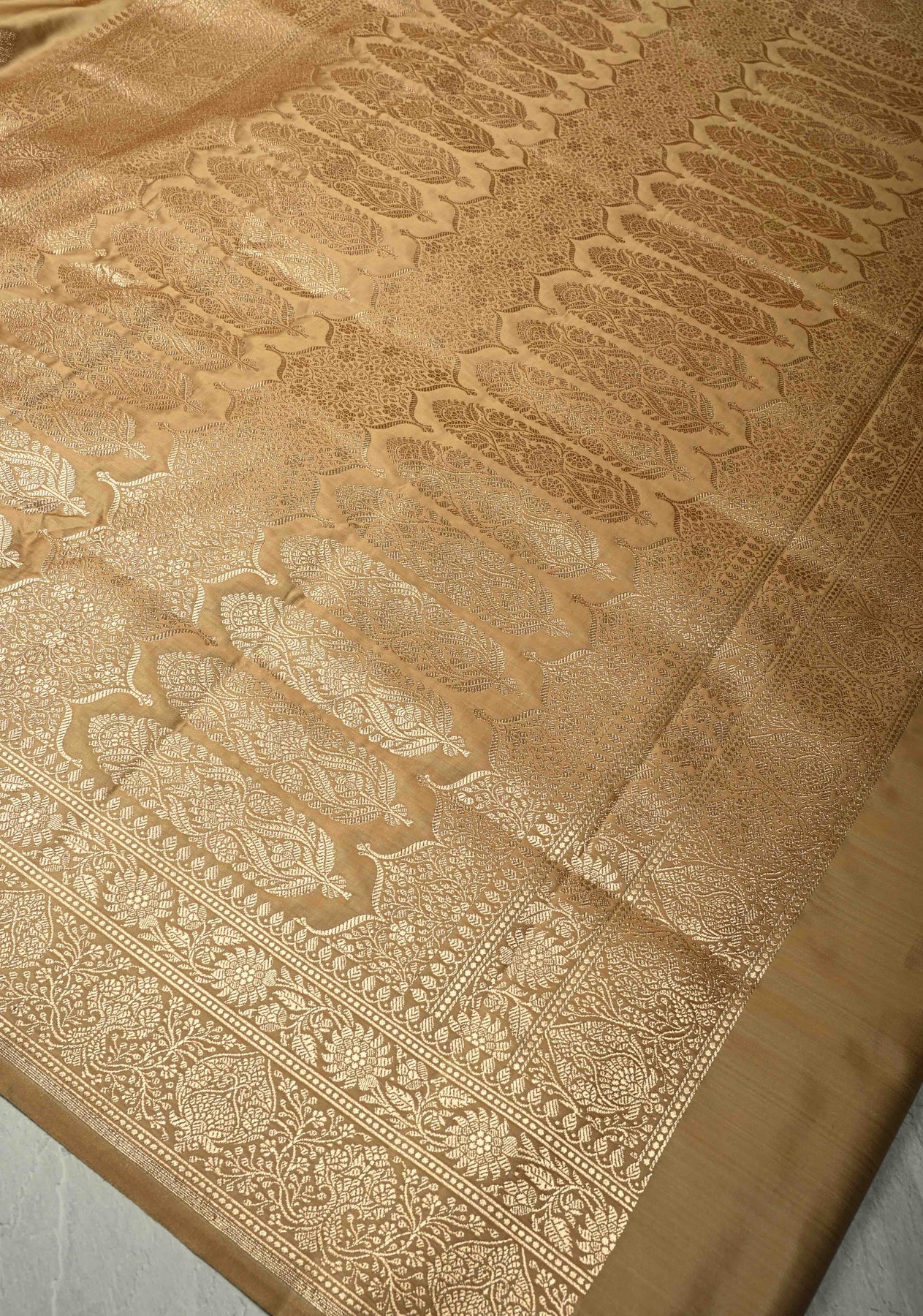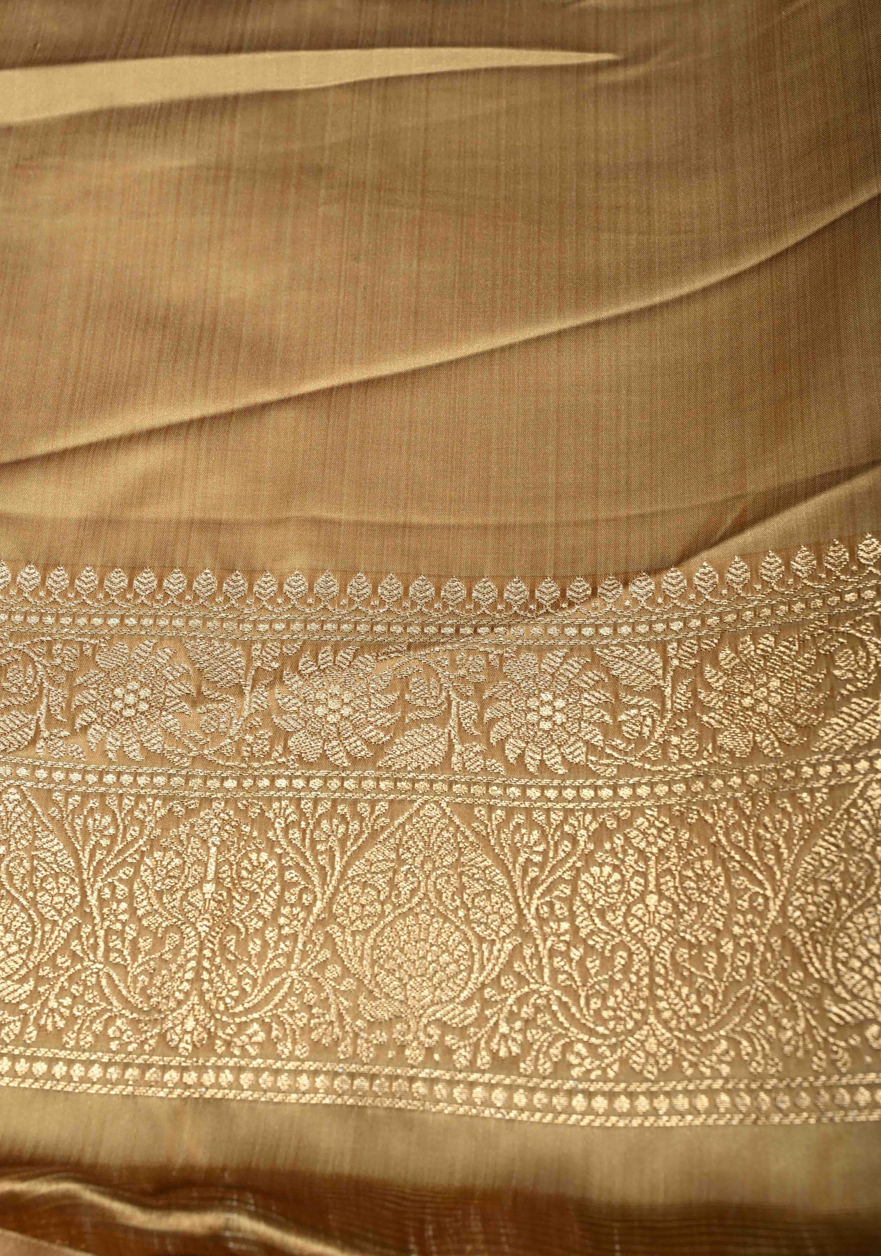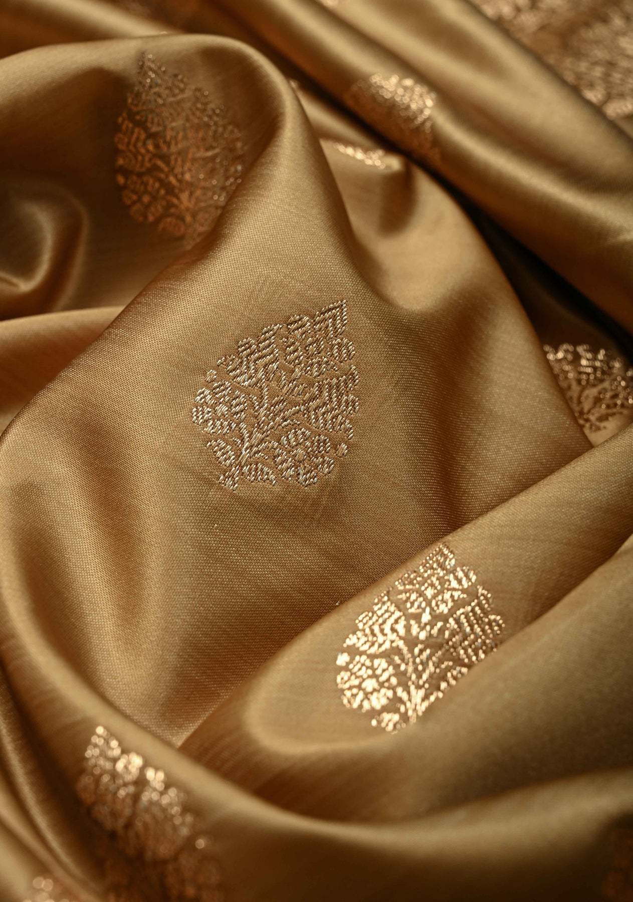 Gracefully blending tradition and, this Chiku Banarasi Semi Mashru Silk Saree is a masterpiece of intricate craftsmanship. Made from a premium semi-mashru silk fabric, the saree features delicate floral zari buttas scattered across its soft chiku base, adding subtle sparkle and elegance. The rich zari border frames the saree beautifully, enhancing its regal appeal and making it perfect for weddings, festive occasions, and special events. This saree effortlessly combines the classic charm of Banarasi weave with a lightweight, breathable texture ideal for comfortable, all-day wear.
