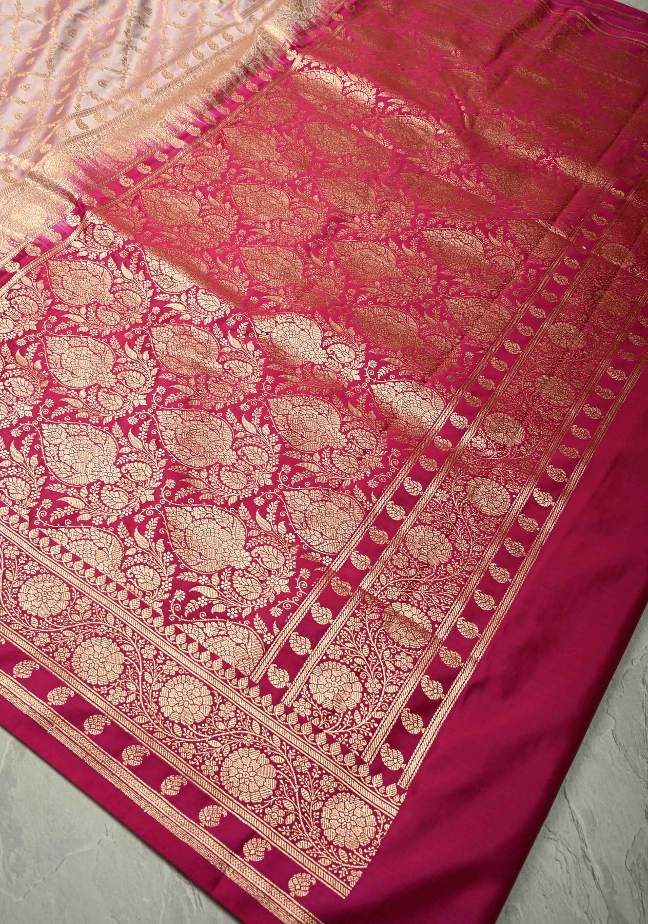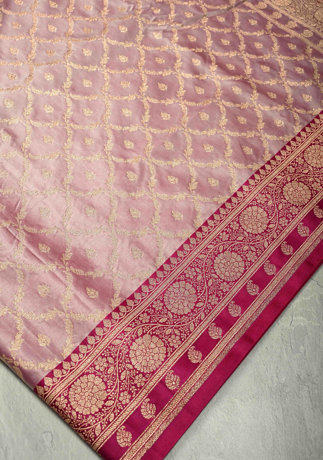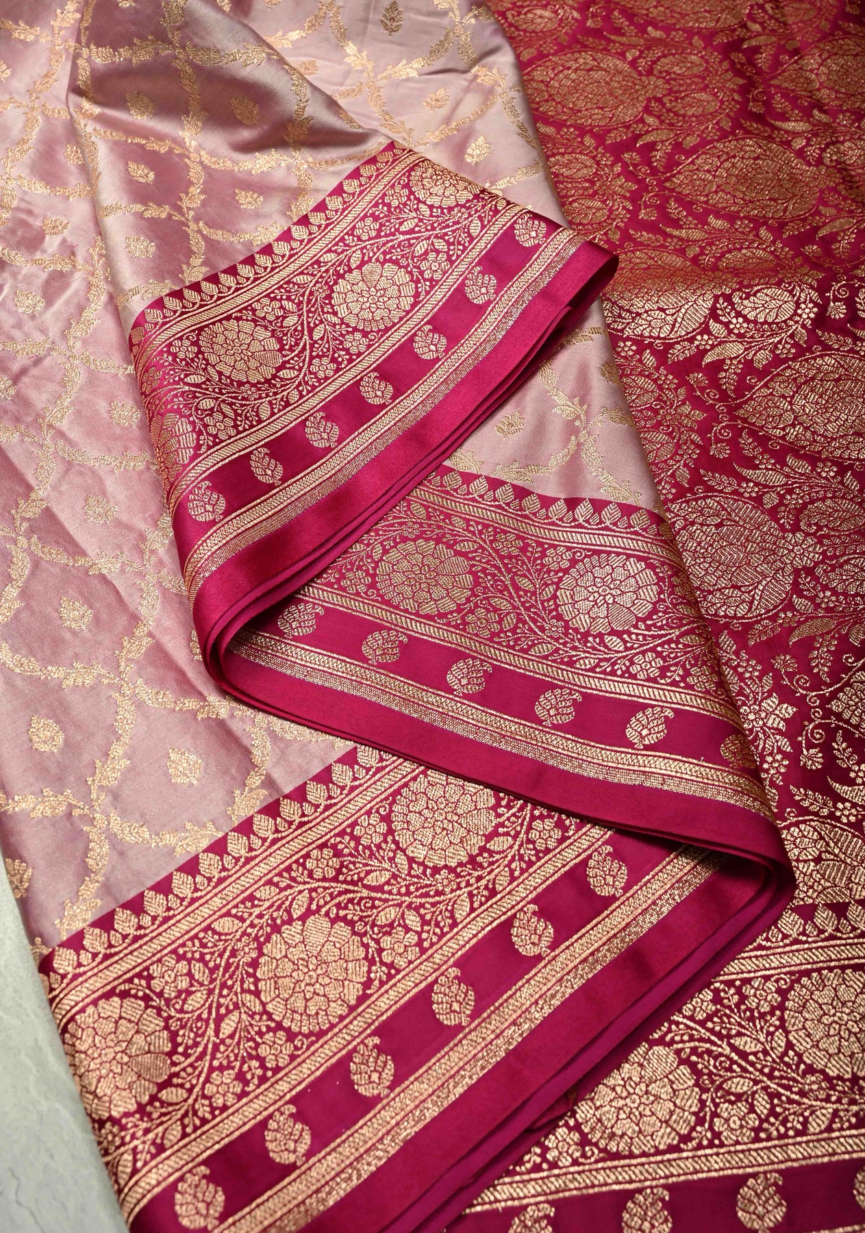 Delicate and graceful, this Lilac Banarasi Semi Mashru Silk Saree is a perfect blend of tradition and elegance. Crafted from semi mashru silk, it features intricate handwoven jaal designs that add subtle texture and charm. The soft lilac base beautifully complements the vibrant pink zari border, creating a stunning contrast that’s perfect for festive occasions and weddings. Lightweight yet luxurious, this saree offers a comfortable drape with a radiant sheen, embodying timeless Banarasi craftsmanship with a fresh, modern touch.