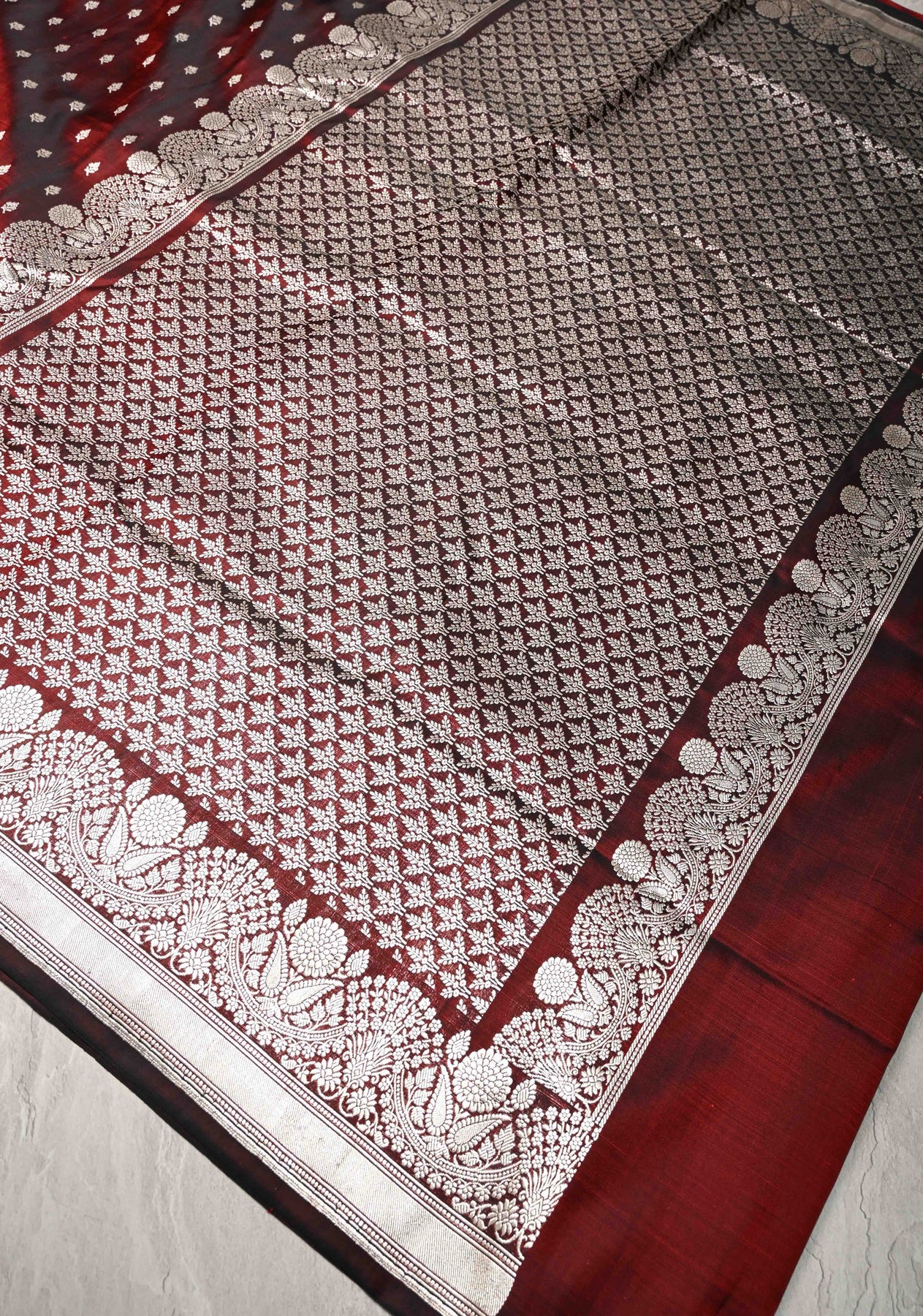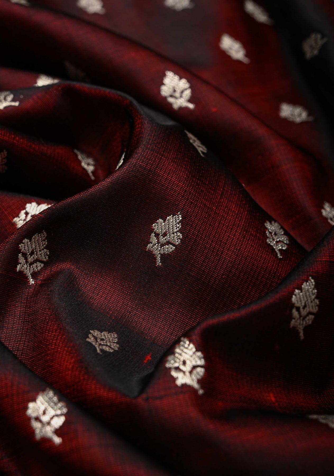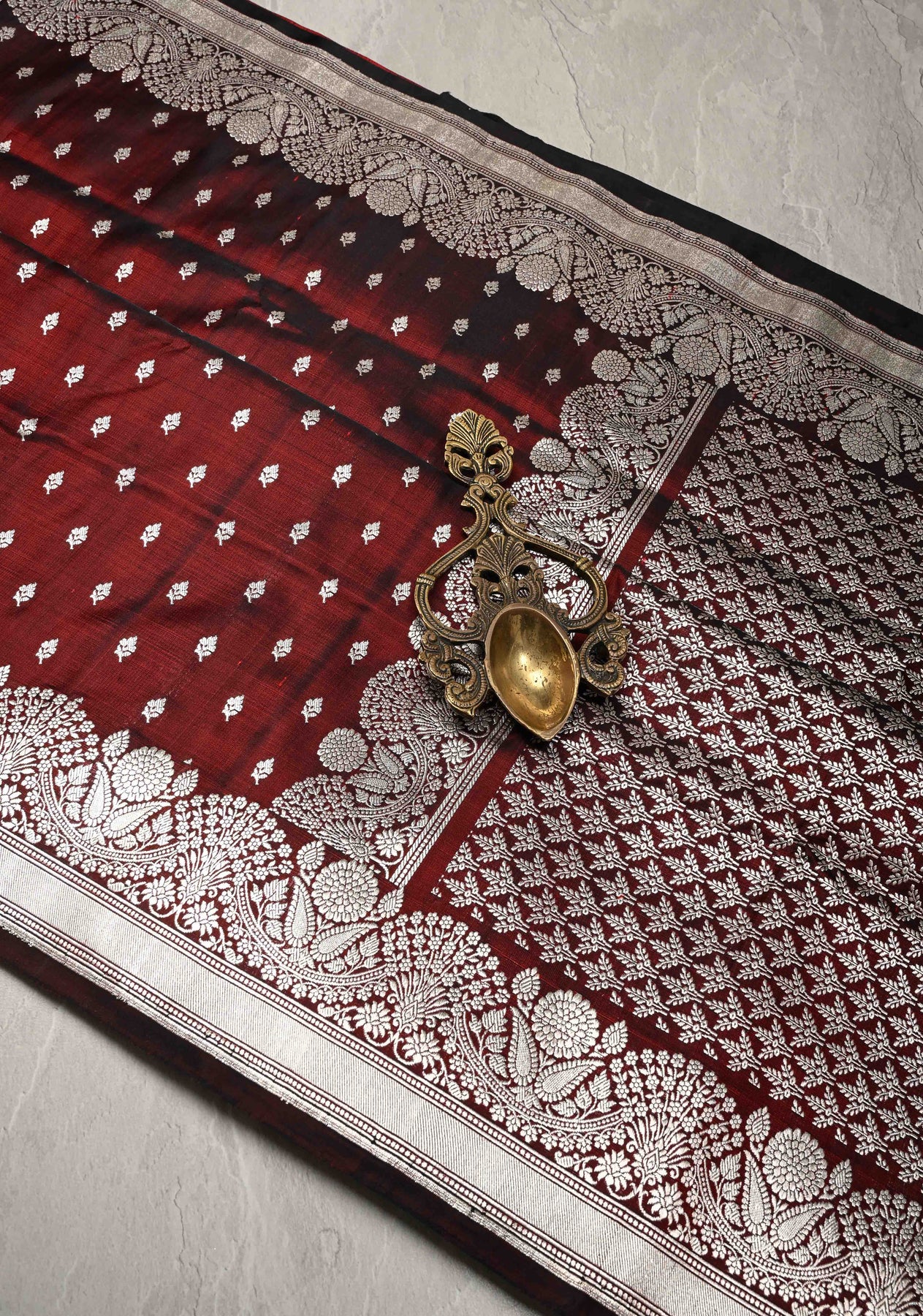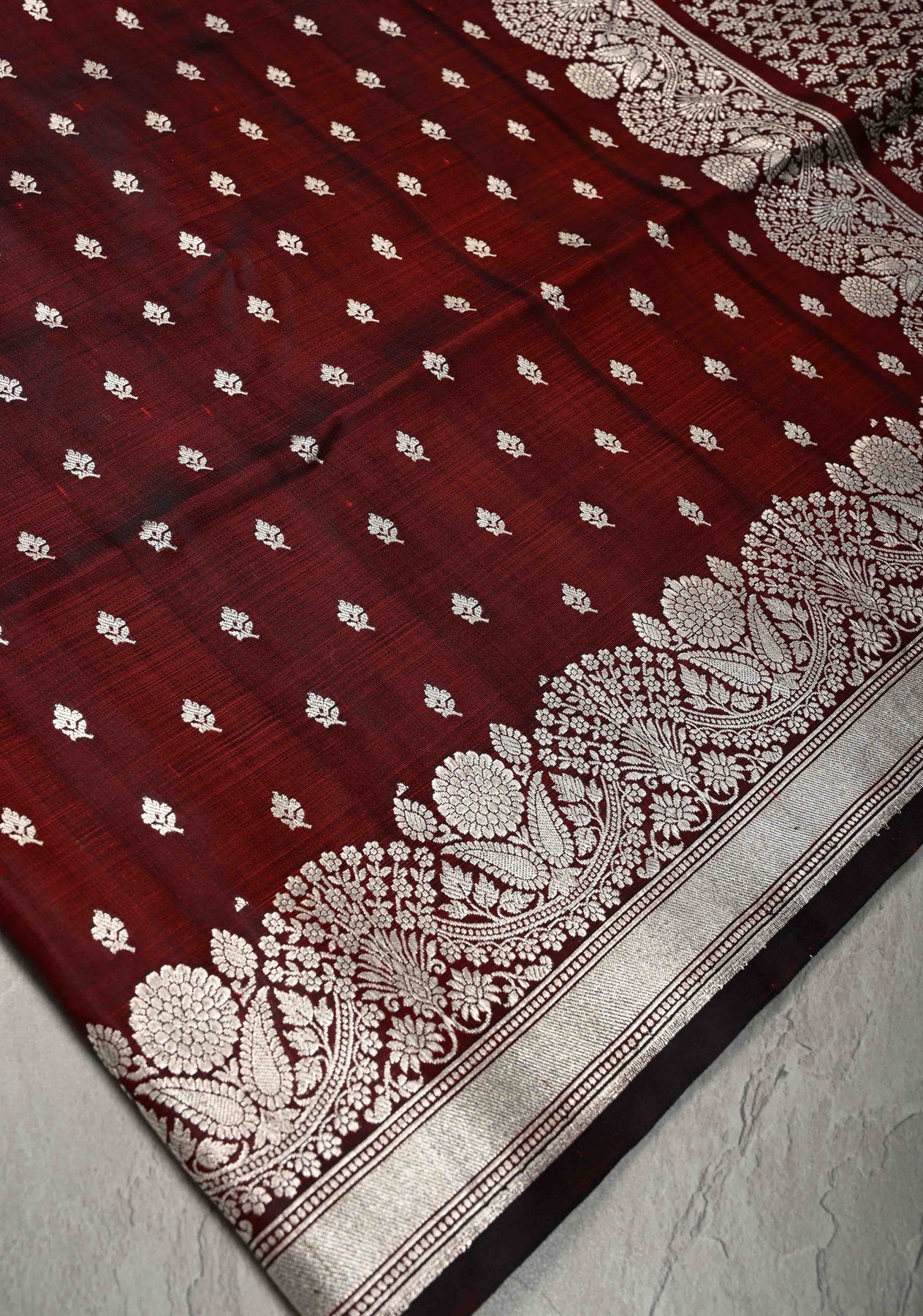Adorned with delicate floral zari buttas scattered across the body, it adds just the right touch of shimmer and tradition. The highlight is the intricately woven silver zari border, which lends a refined contrast to the deep maroon base, enhancing its regal appeal without overwhelming the design.