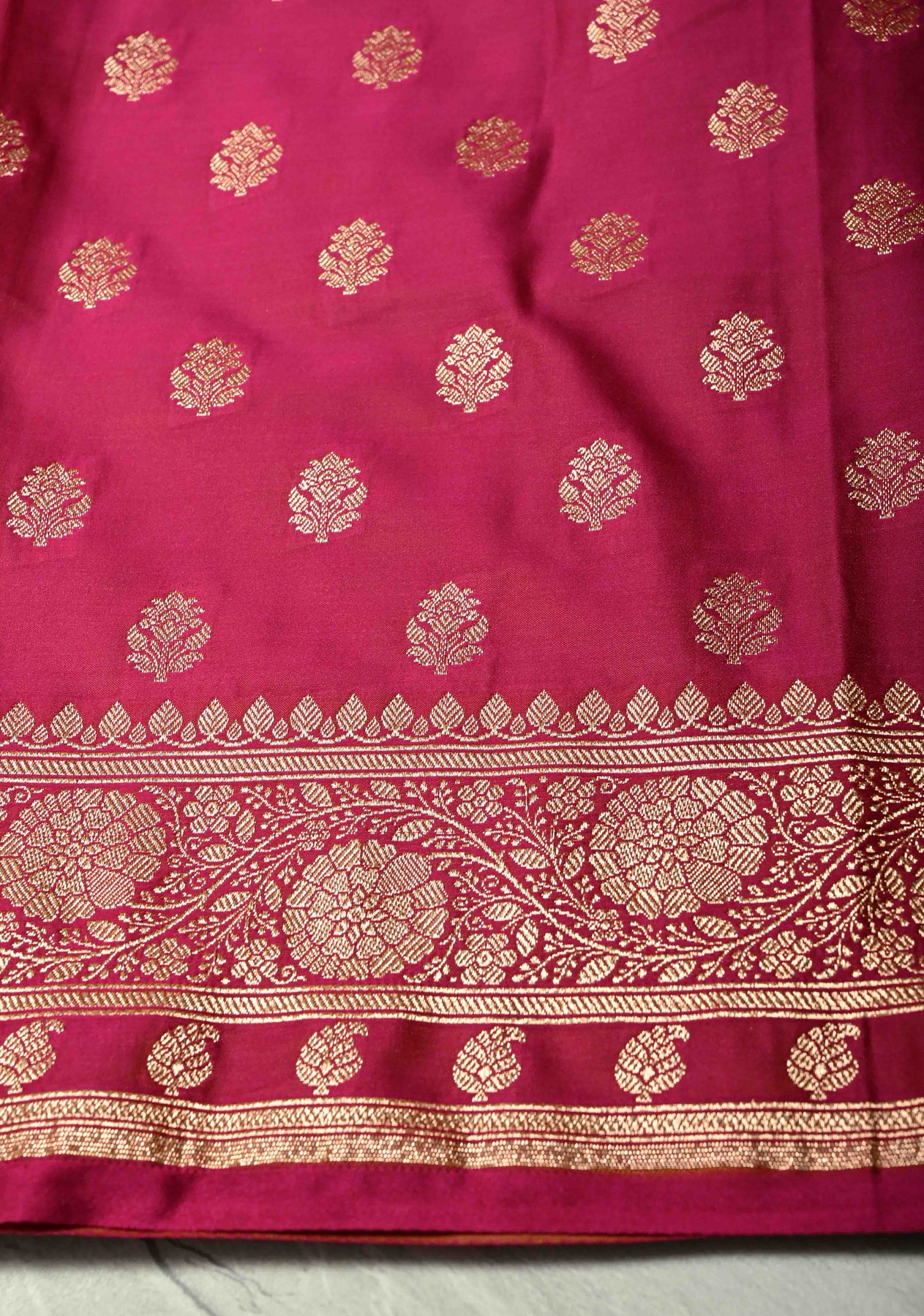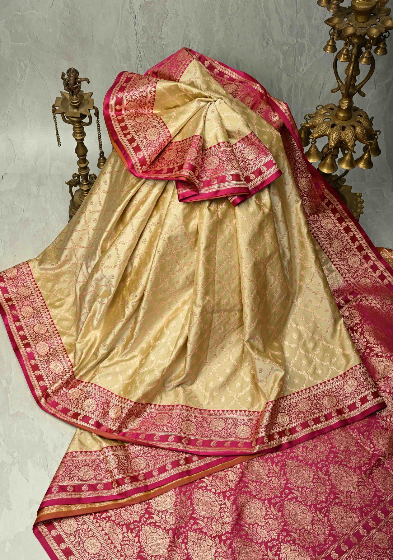 Elegance meets tradition in this Off White Banarasi Semi Mashru Silk Saree, featuring exquisite handwoven jaal designs that add intricate depth and texture. Crafted from a semi mashru silk blend, the saree offers a delicate sheen and comfortable drape. The soft off-white base is beautifully contrasted by a vibrant pink zari border, lending a fresh and festive appeal. Perfect for weddings, religious ceremonies, or special occasions, this saree seamlessly blends classic Banarasi artistry with a contemporary twist.