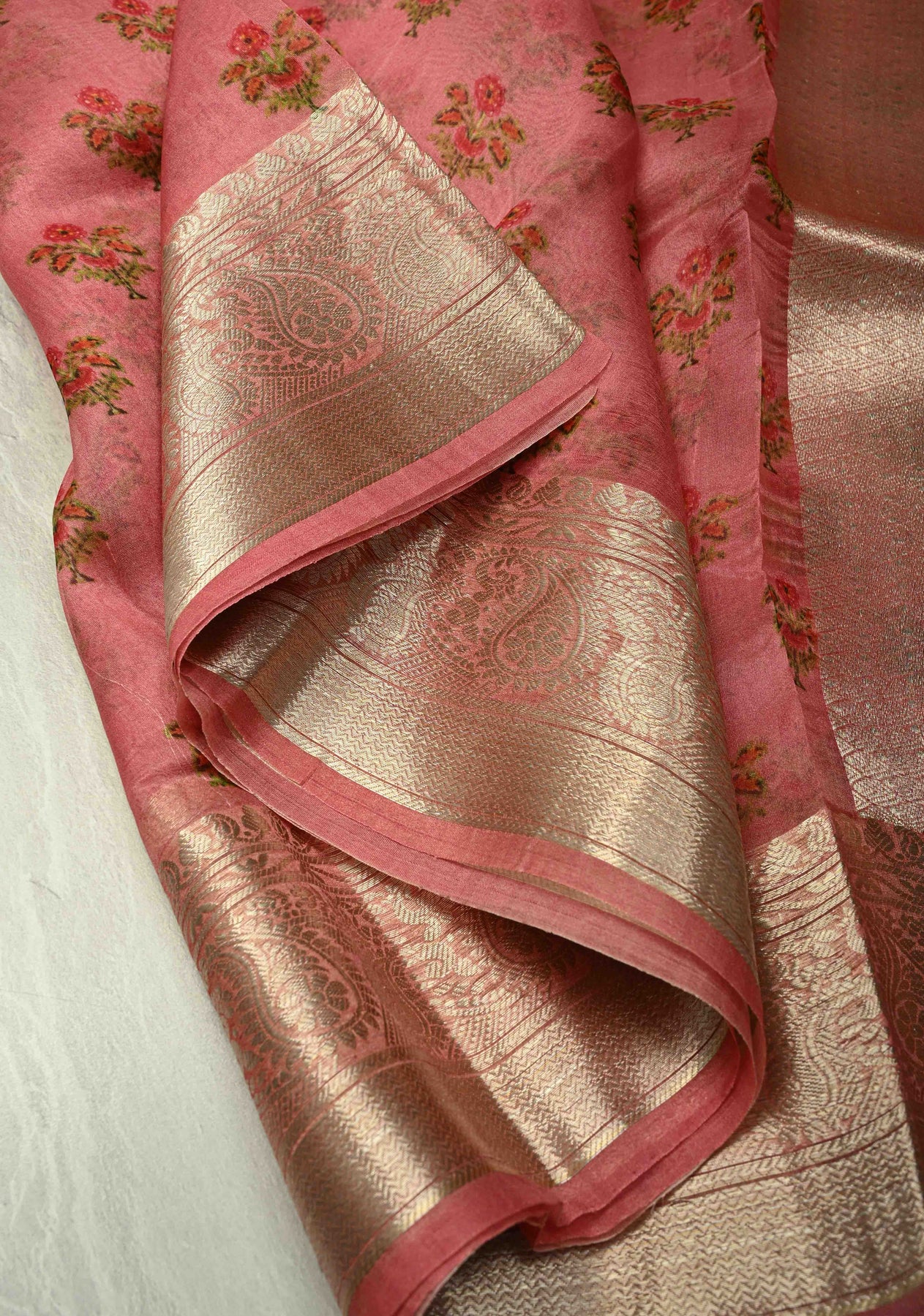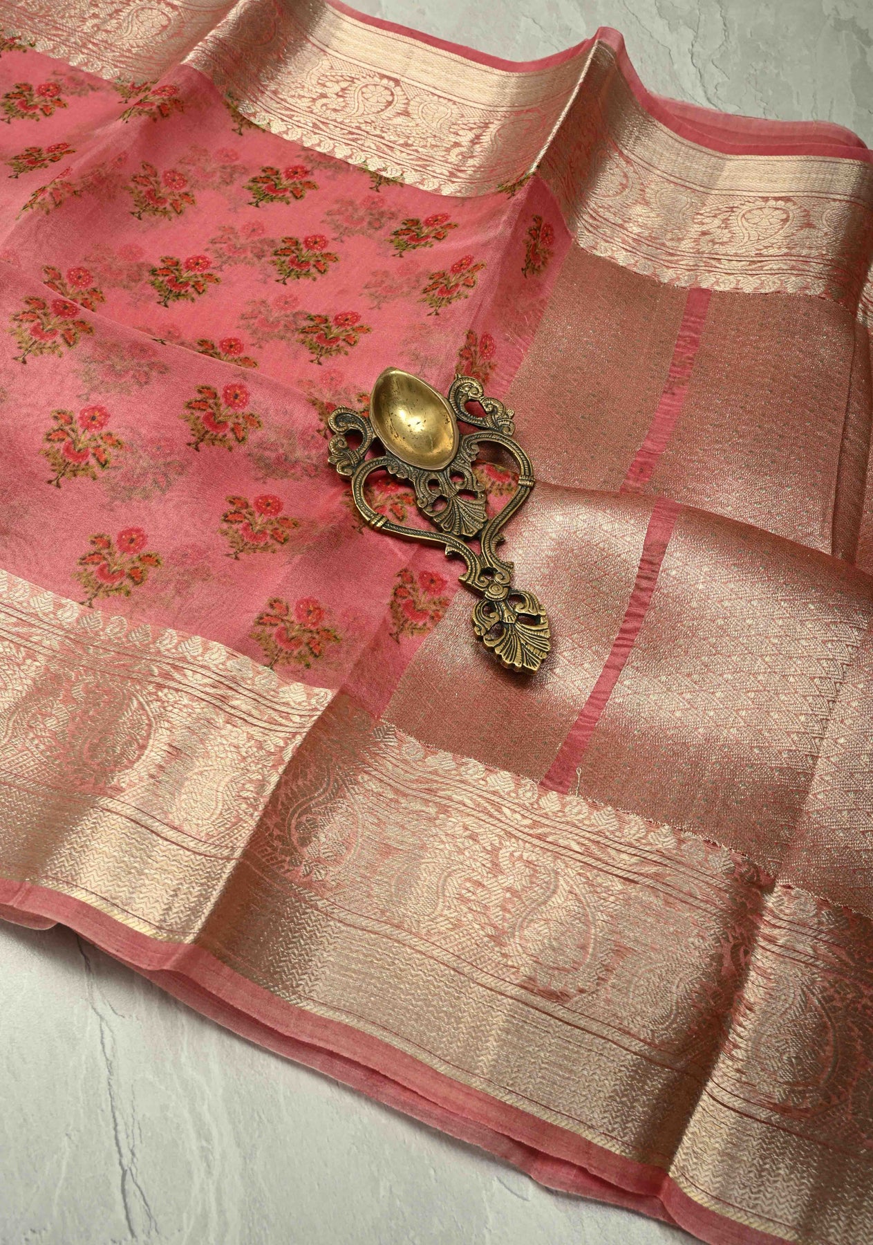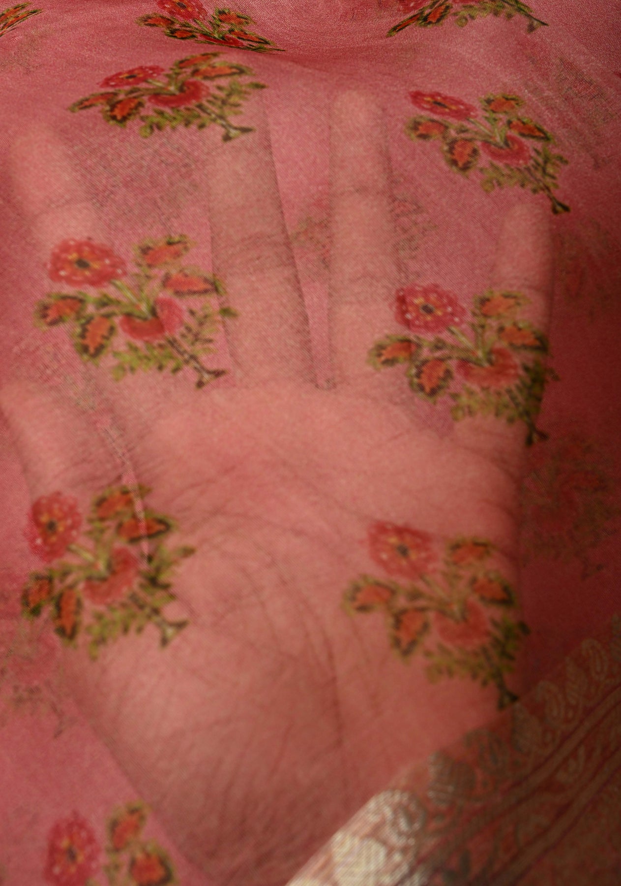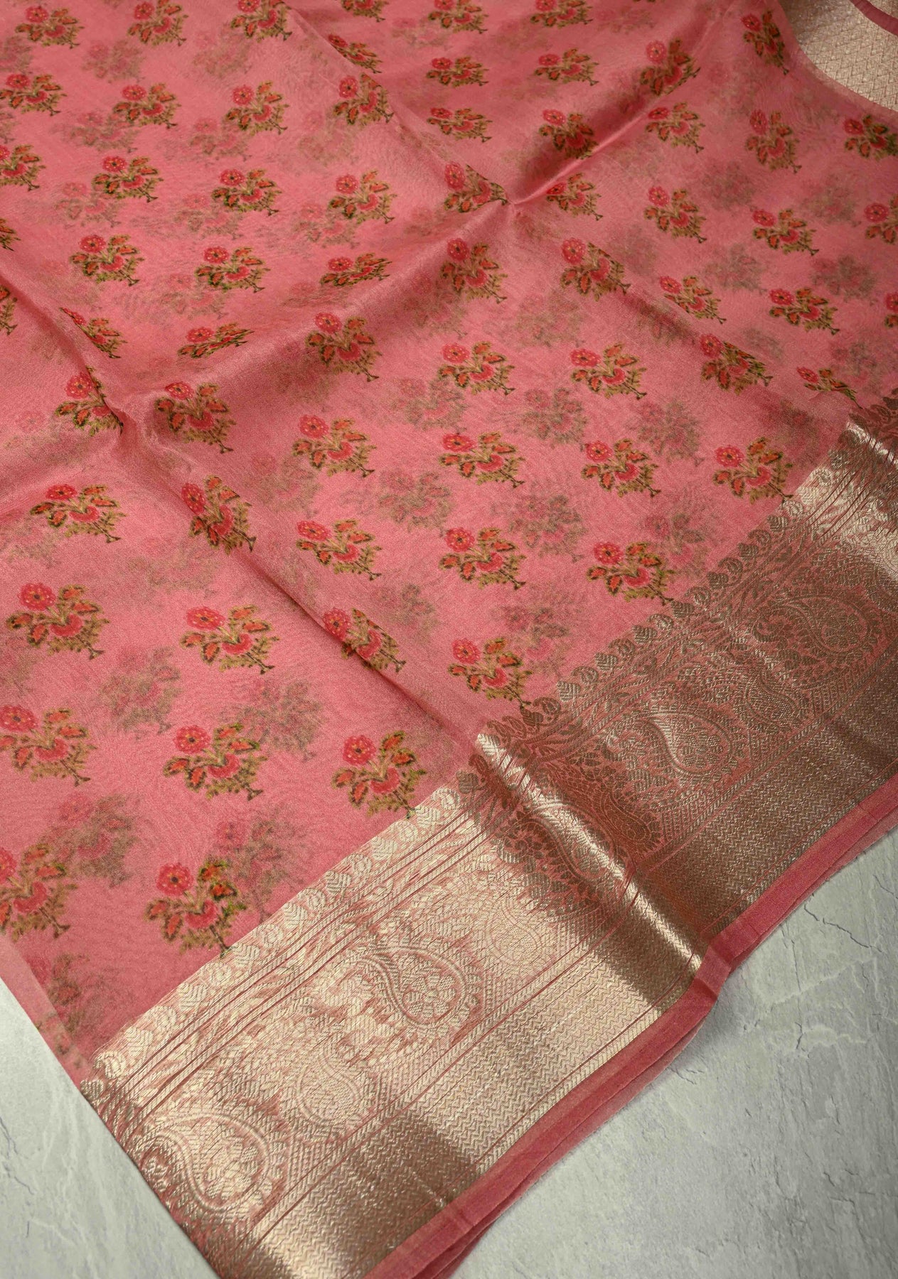 This Watermelon PinkKora Silk Saree is a vibrant blend of contemporary design and traditional silk craftsmanship. Crafted from tpure Organza kora silk, it features a delicate digital floral print that adds lively detailing to the rich watermelon pink base. Accented with a subtle zari border, the saree exudes elegance and sophistication, making it perfect for weddings, festive occasions, and special celebrations. Its lightweight drape and luxurious texture ensure both comfort and style.