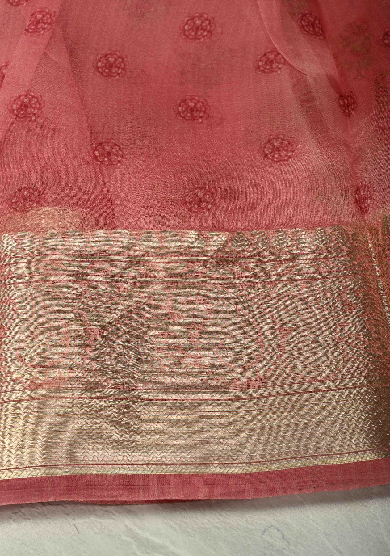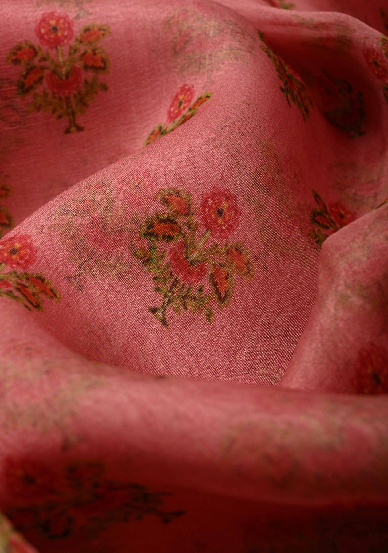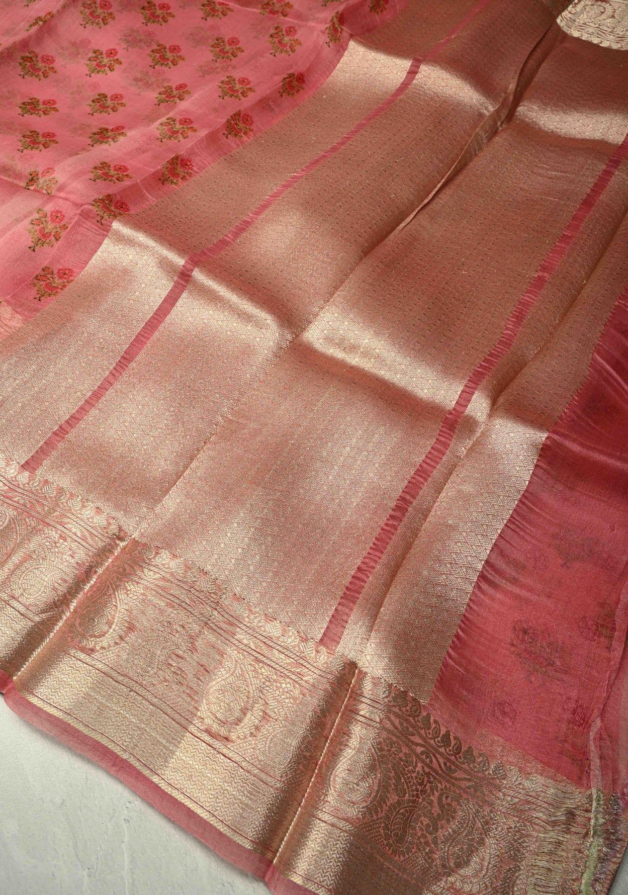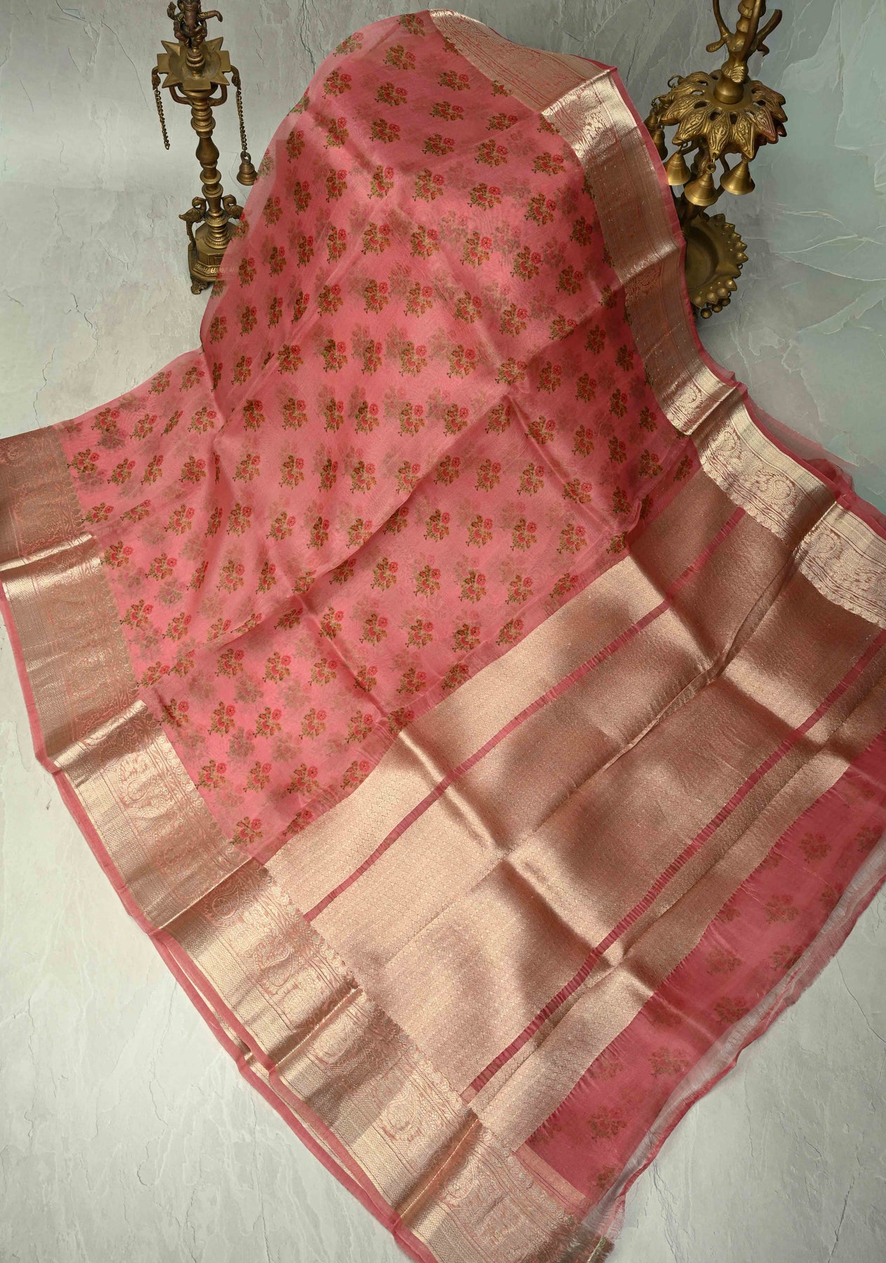 This Watermelon PinkKora Silk Saree is a vibrant blend of contemporary design and traditional silk craftsmanship. Crafted from tpure Organza kora silk, it features a delicate digital floral print that adds lively detailing to the rich watermelon pink base. Accented with a subtle zari border, the saree exudes elegance and sophistication, making it perfect for weddings, festive occasions, and special celebrations. Its lightweight drape and luxurious texture ensure both comfort and style.