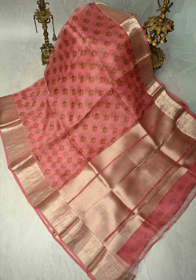 Dusty Carnation pink Banarasi Tussar Georgette Saree with Kaduwa weave Meenakari Buttas and Zari Border | SILK MARK CERTIFIED