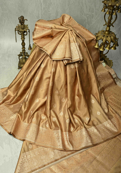 Chiku Banarasi Semi Mashru Silk Saree with Floral Zari Buttas and Bright Gold Zari detailing