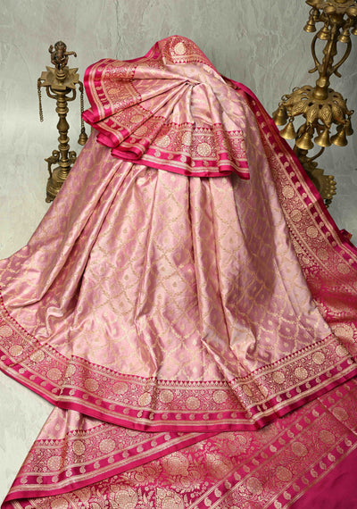 Shades of Pink Color Authentic Shikaargah Peacock Parrot Jaal Pure Silk Georgette Banarasi Saree | SILK MARK CERTIFIED