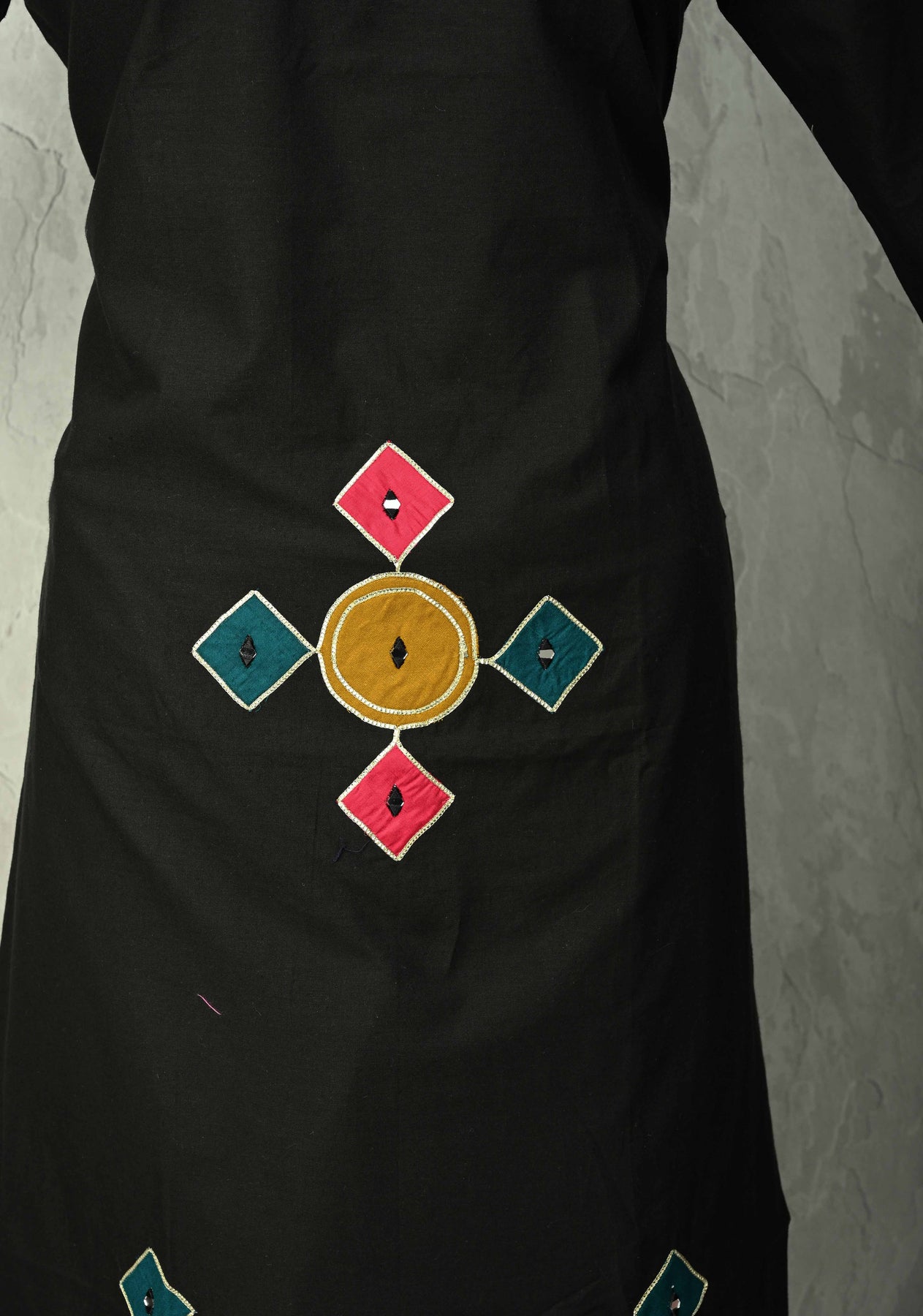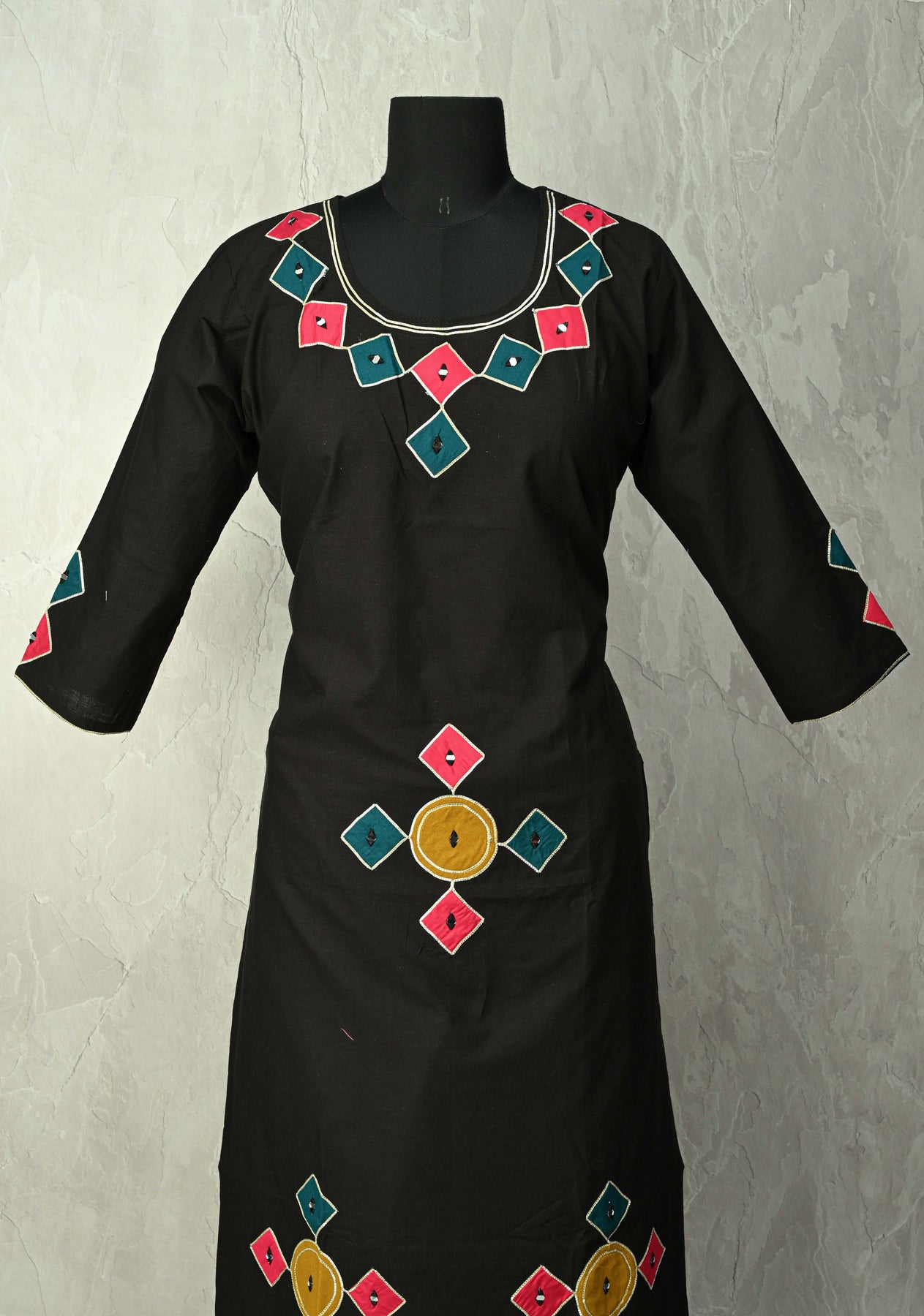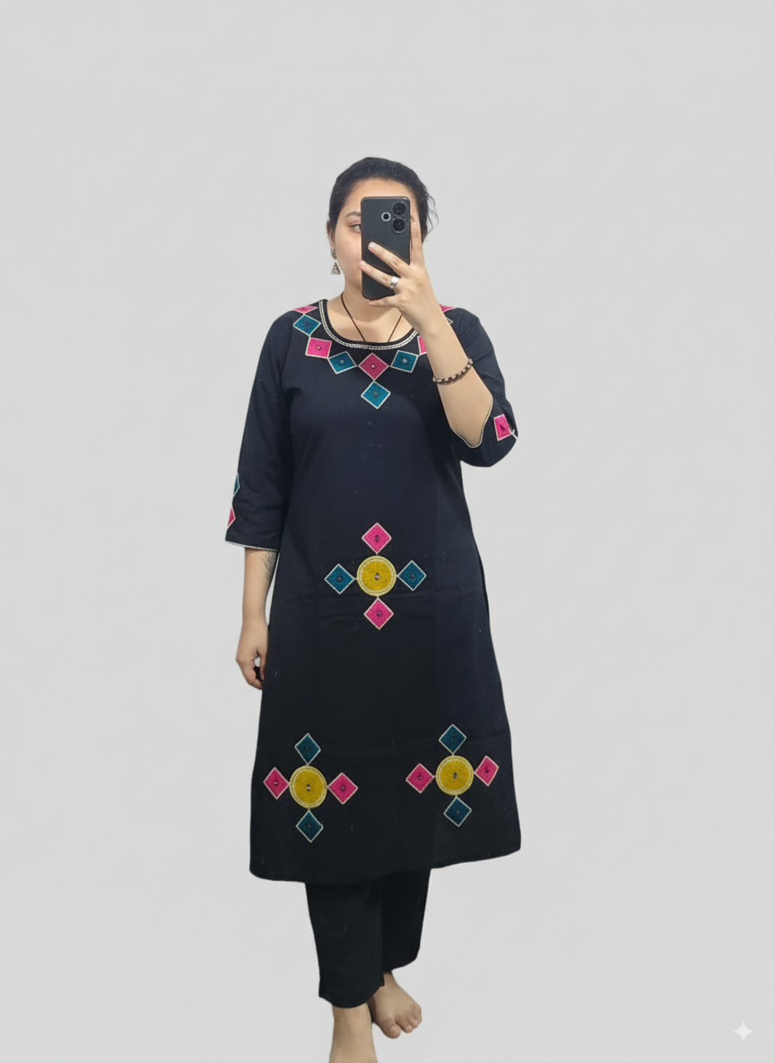 The geometric patch motifs add a unique handcrafted feel, while the relaxed A-line silhouette ensures an easy, flattering fit. Perfect for casual outings, festive gatherings, or office wear, this outfit is a versatile addition to your ethnic wardrobe.