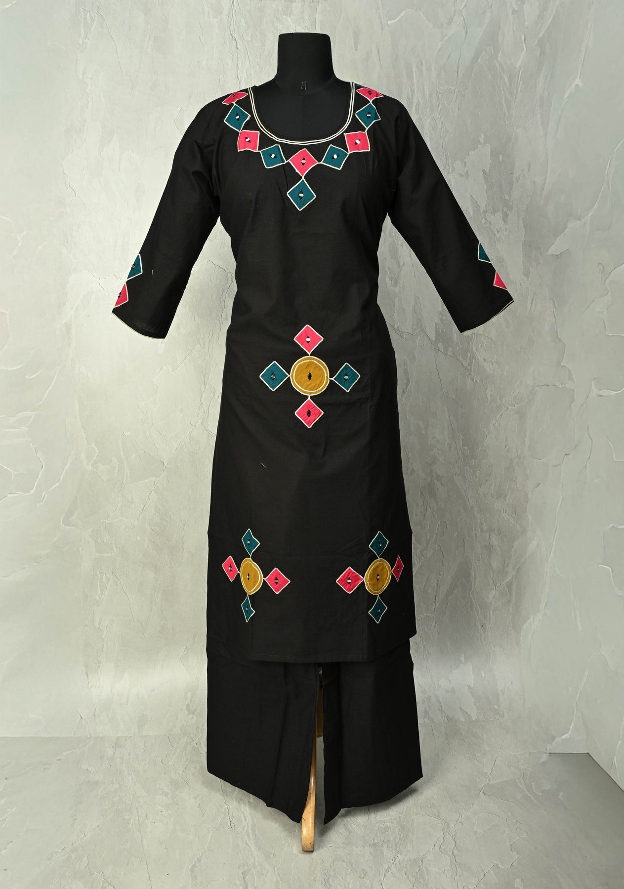 Add a touch of playful elegance to your everyday ethnic look with this A-Line Kurti & Pant Set .Crafted in soft, breathable cotton fabric, this set features vibrant checks patchwork detailing on a rich black base, blending comfort with contemporary charm.