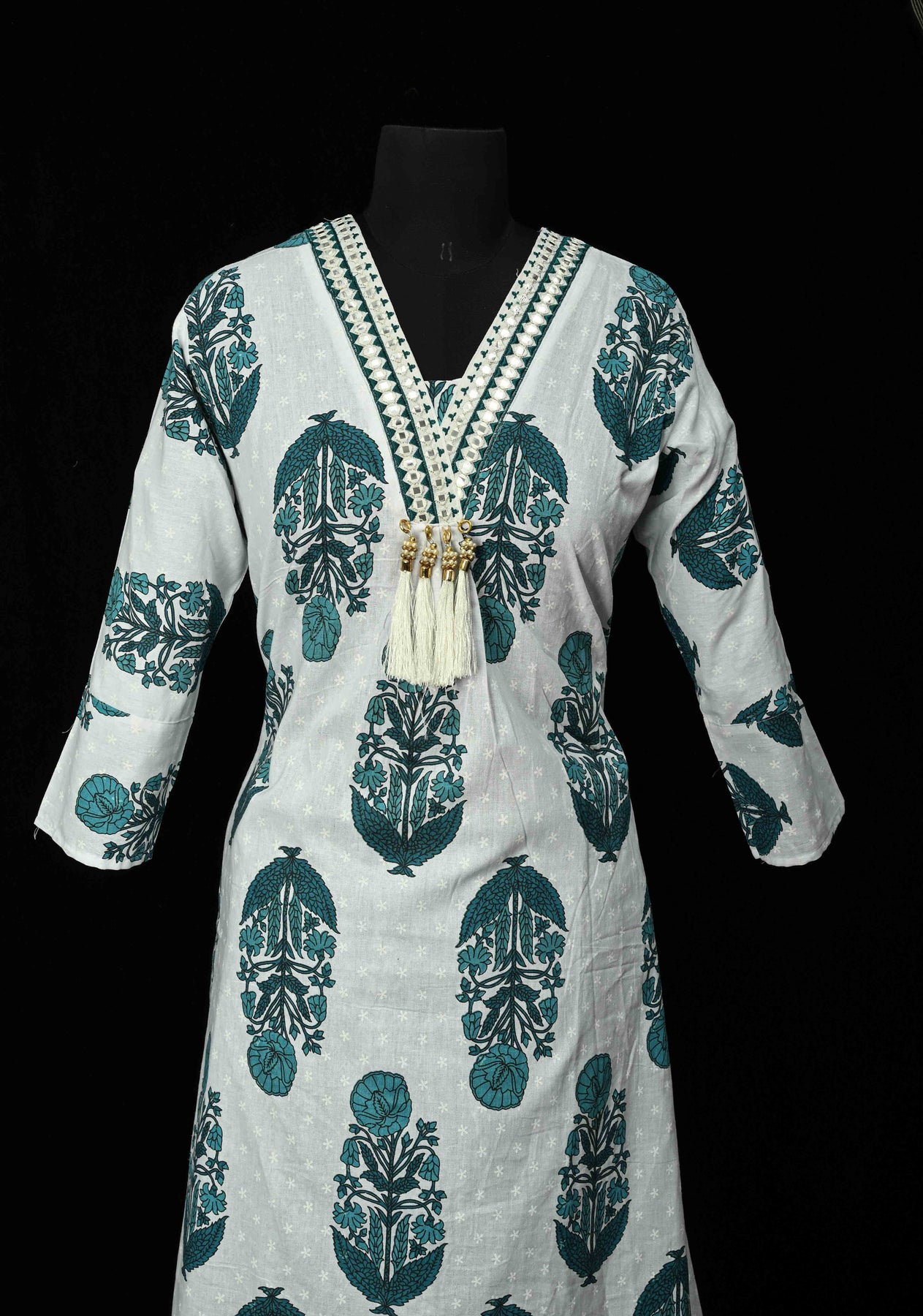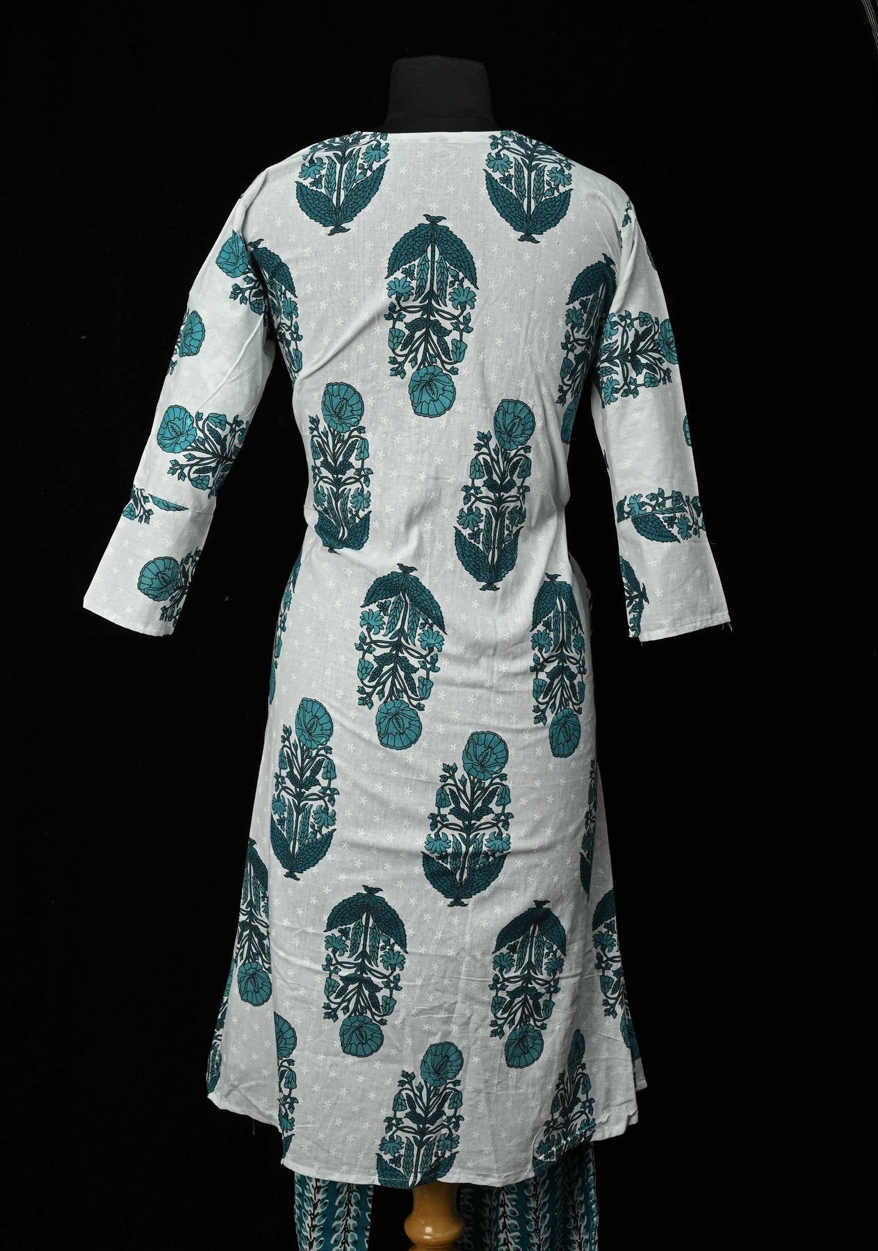 Blue A-Line Printed Cotton Kurti & Pant Set