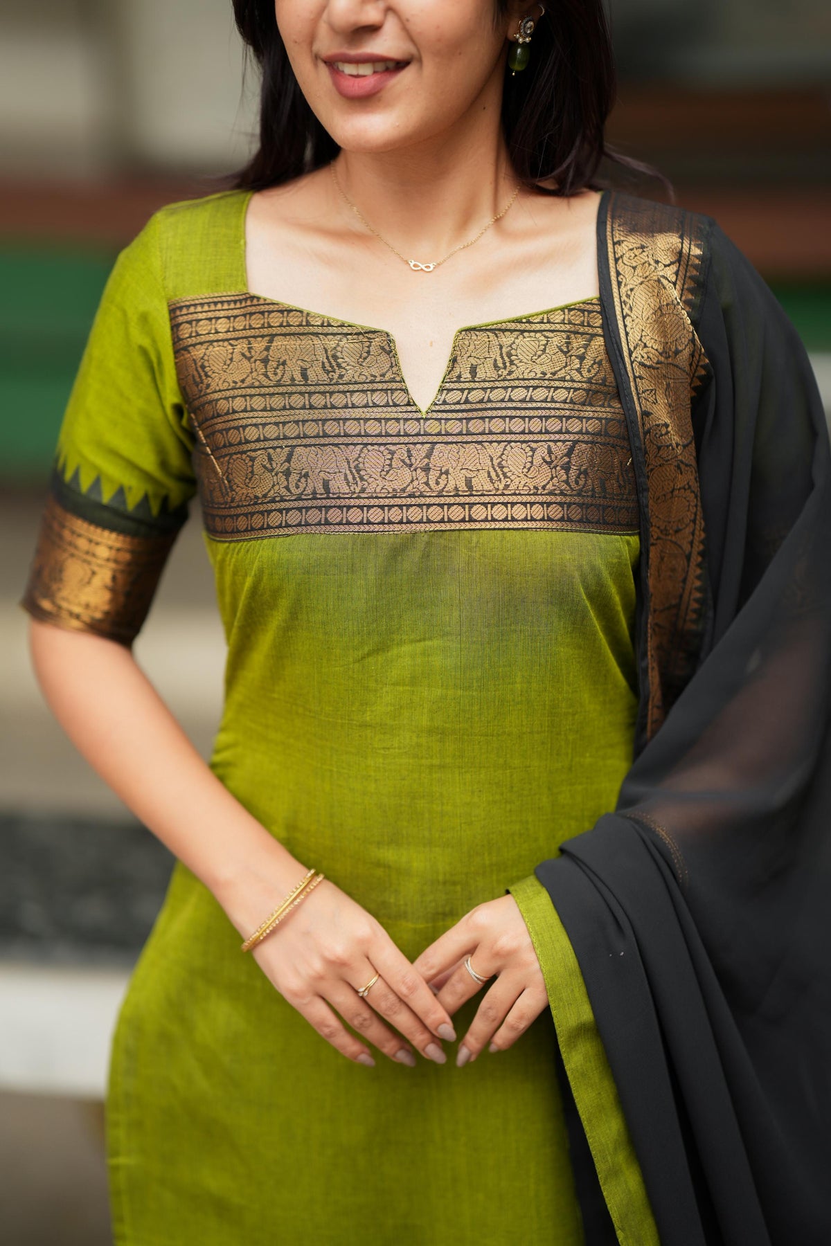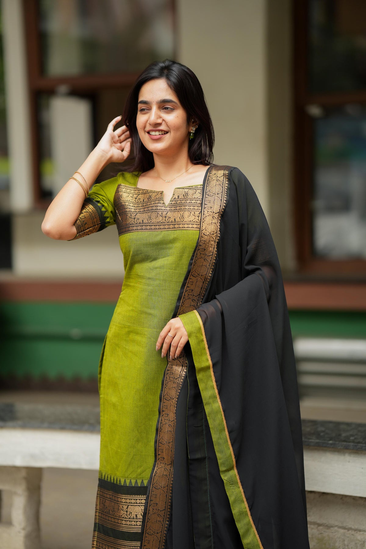 The Prisha Olive Green Kurti Set is designed for mornings that begin with pooja and evenings that end in celebration. The solid olive handloom base brings a bright, refined colour pop, while the classic black crushed georgette dupatta adds depth and drama. Finished with broad gold zari borders with ornate motifs across the hem, yoke, sleeves, and dupatta, this set delivers a Banarasi-inspired grandeur that looks premium in photos and feels effortless on the skin.