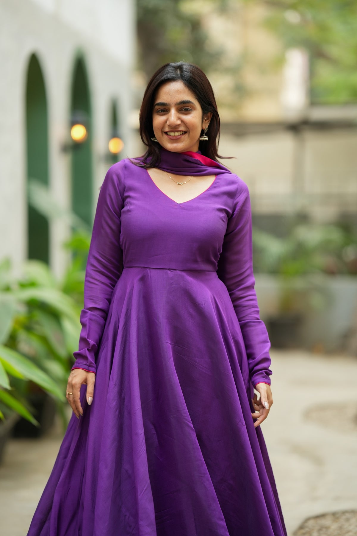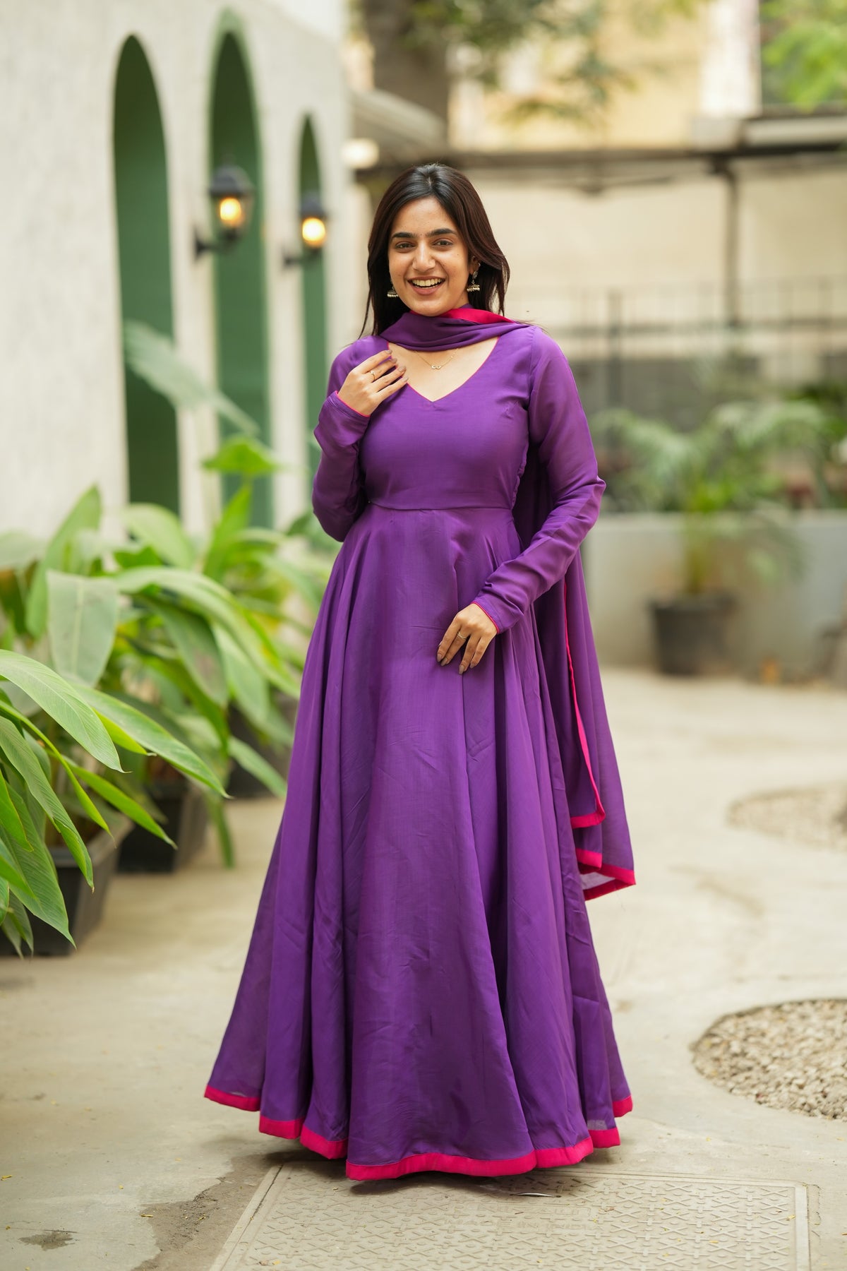 💜 ✨Designed for moments that deserve a little drama, the Raha Violet Anarkali Dress is the kind of silhouette that instantly steals the frame. Crafted in breathable mul cotton with a fitted bodice and a full circular flare, this floor-length Anarkali moves like poetry—making every step, spin, and candid shot look effortlessly elevated. A clean violet base is finished with a contrast pink hem and a matching dupatta border, giving you a festive-ready look that feels modest, graceful, and irresistibly reel-worthy for poojas, Navaratri, and celebration evenings.