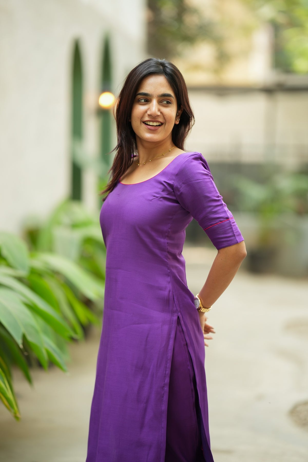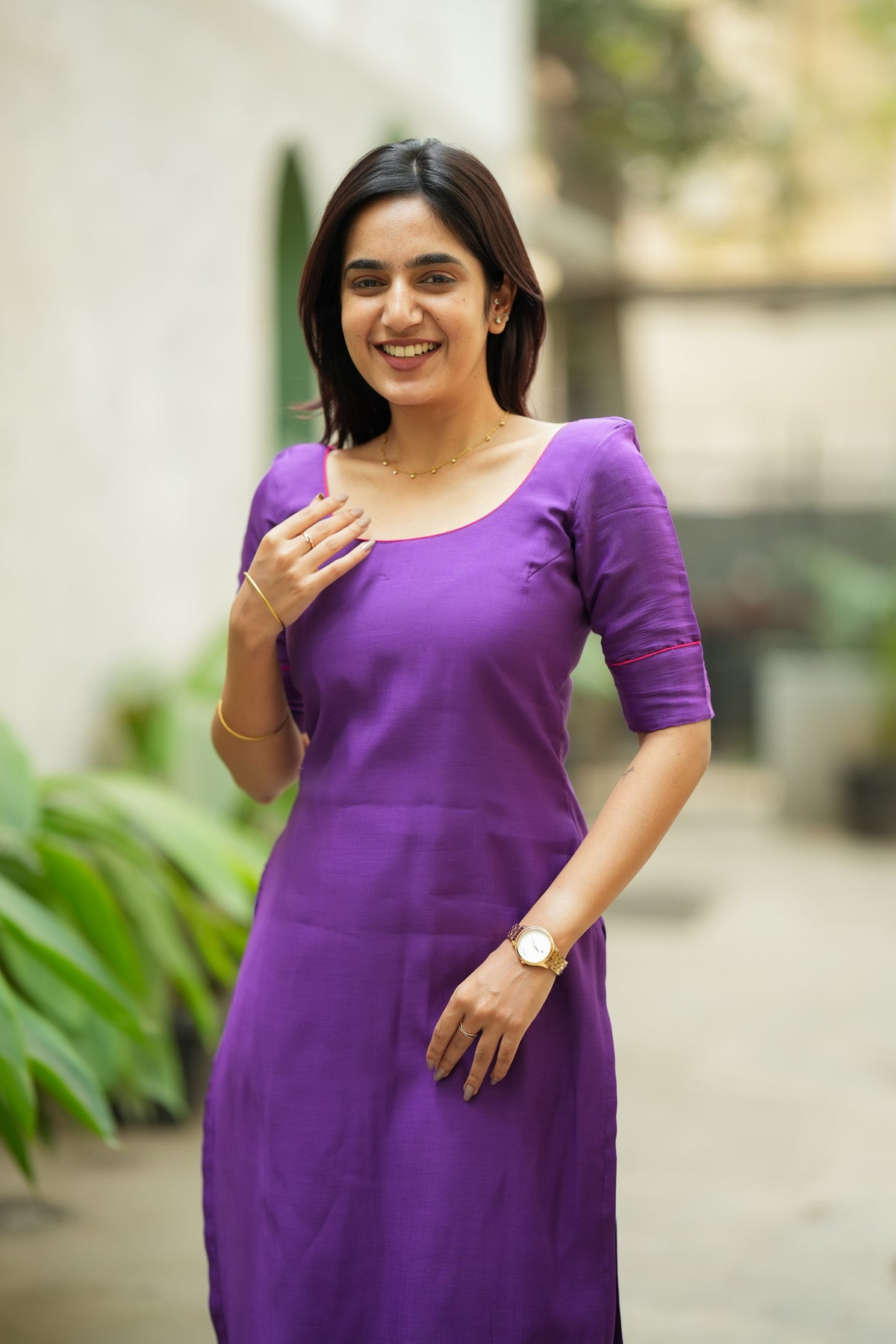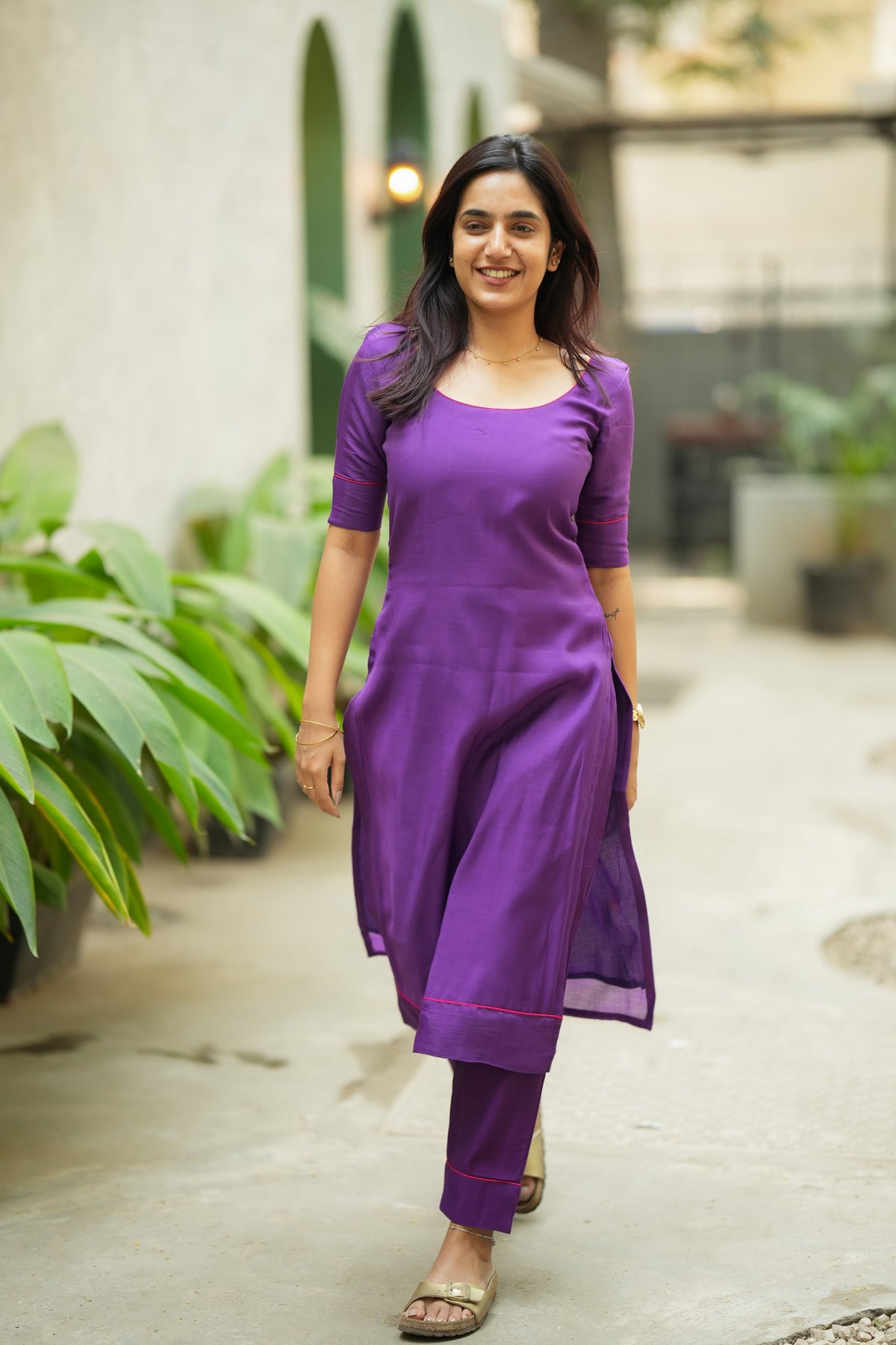 💜 Minimal, polished, and quietly powerful, the Raha Violet Kurti Set is made for the woman who loves clean silhouettes with a hint of detail. Crafted in breathable mul cotton, this solid violet set is elevated with contrast pink piping along the hems, giving it a refined, put-together finish without trying too hard. The straight-fit kurti with side slits pairs with slim ankle-length pants to create a sharp everyday look that works beautifully for office days, errands, and casual outings.