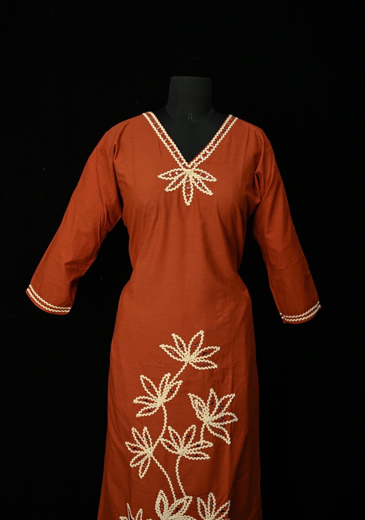 Add an earthy touch to your ethnic collection with this Rust Cotton Kurti Set .The kurti showcases striking applique embroidery at the neckline and daman, paired with clean straight pants for everyday elegance. Crafted from breathable cotton and adorned with delicate handwork, this set brings comfort and contemporary style to any outing or celebration.