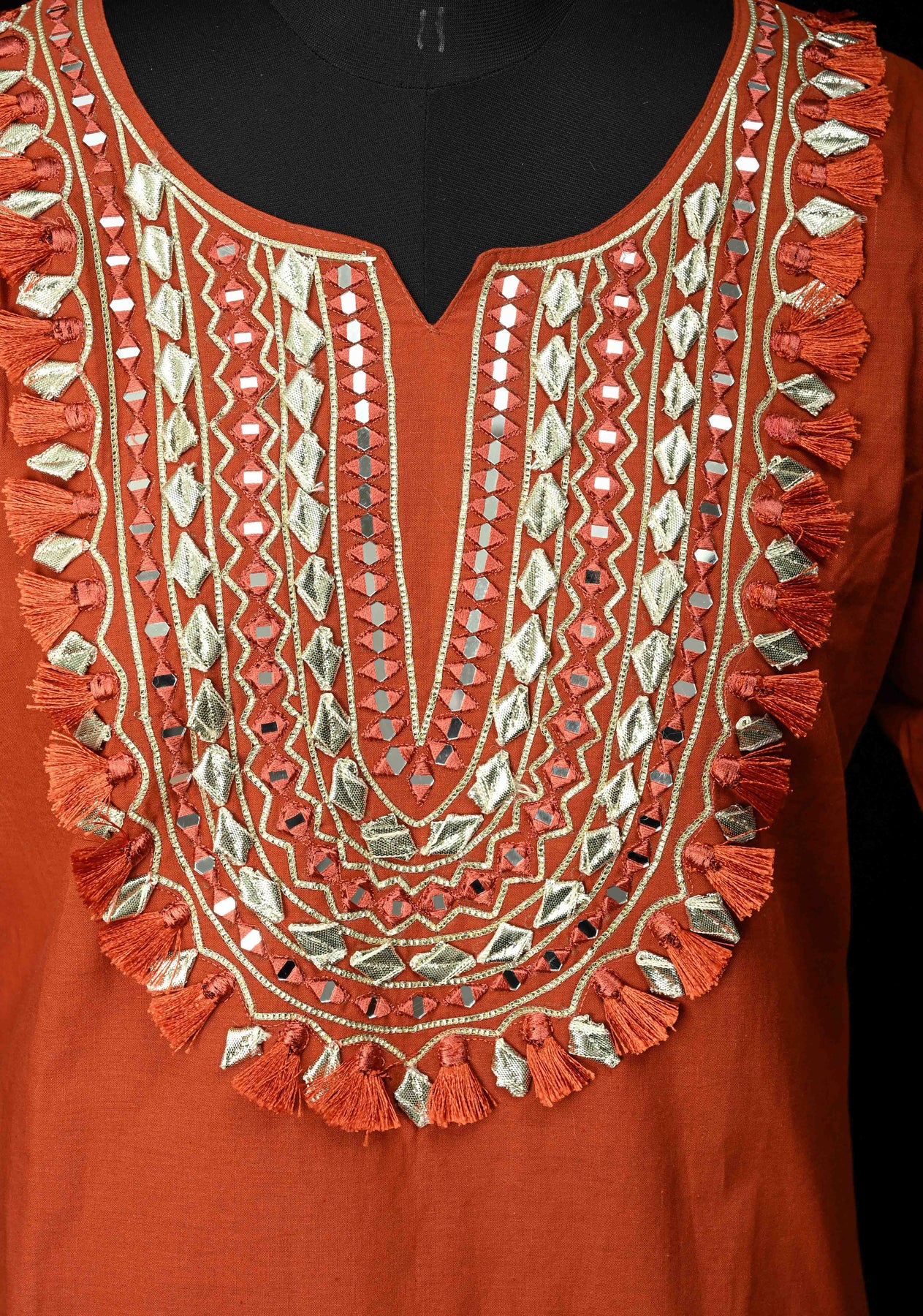 Infuse graceful elegance into your wardrobe with the Rust Cotton Fumka Neck Kurti Set, crafted in soft, breathable cotton. This A-line kurti features a beautifully detailed fumka neck with mirror embroidery and geometric patterns, paired with coordinating slim pants for a refined finish. Perfect for festive gatherings and elevated everyday wear, it brings easy sophistication and Indian craftsmanship to any occasion.