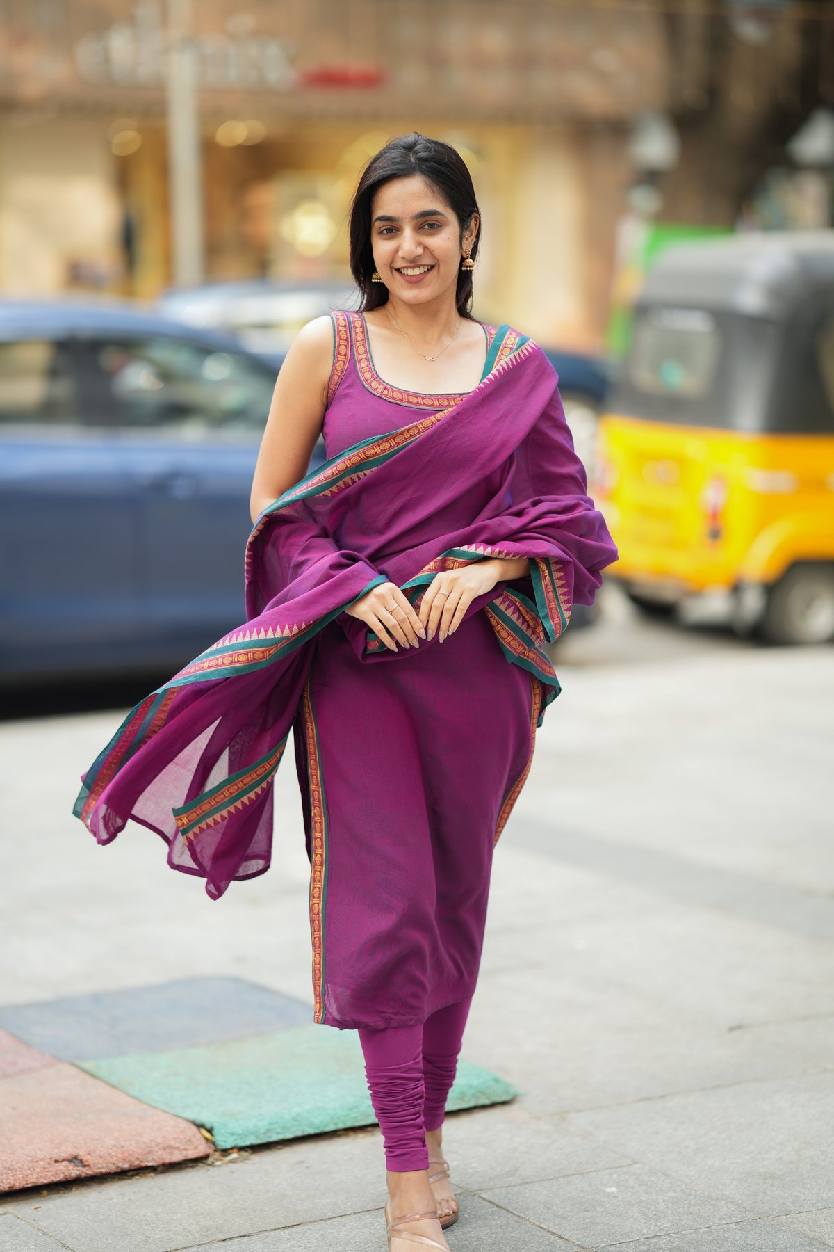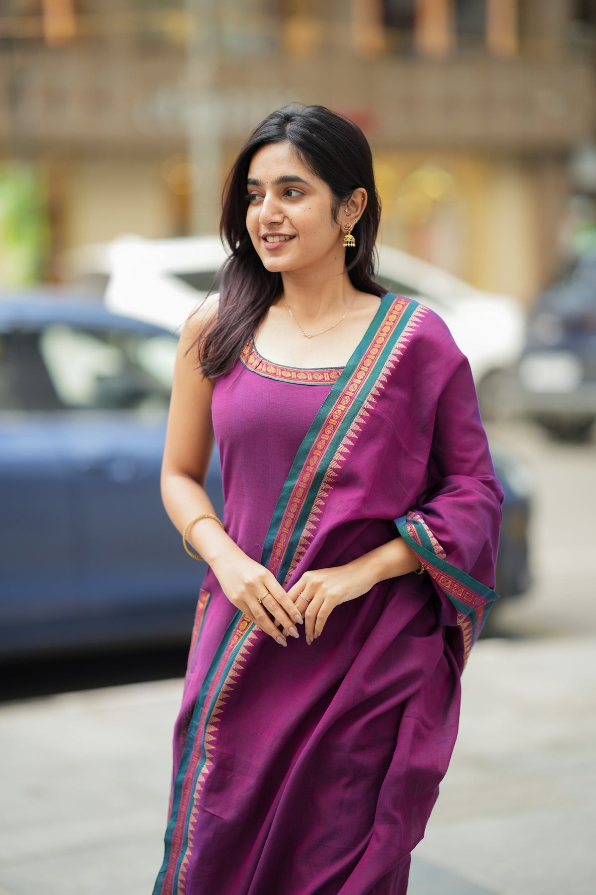 When you want to look effortlessly put-together, this is the set you reach for. A rich magenta Narayanpet cotton kurti with a clean straight silhouette, finished with refined temple-border accents that instantly elevate the look. Minimal, classy, and never loud—perfect for office ethnic days, and just as beautiful for after-hours family functions with a quick jewellery switch.