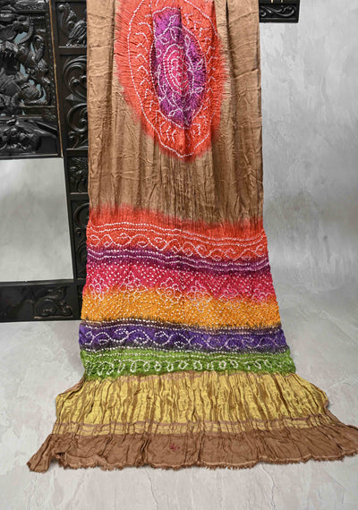 Brown Hand Shibori Dye and Bandhej Design on Modal Silk Saree with Satharangi Pallu