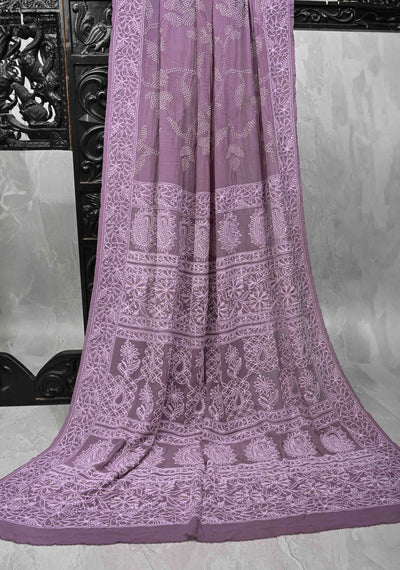 Authentic Dusty Lavender Hand Chikankari on Georgette Saree with Floral Jaal and Mukiesh Work