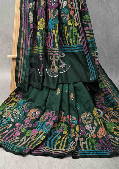 Bottle Green Art Silk Saree with Kantha Hand Embroidery Design