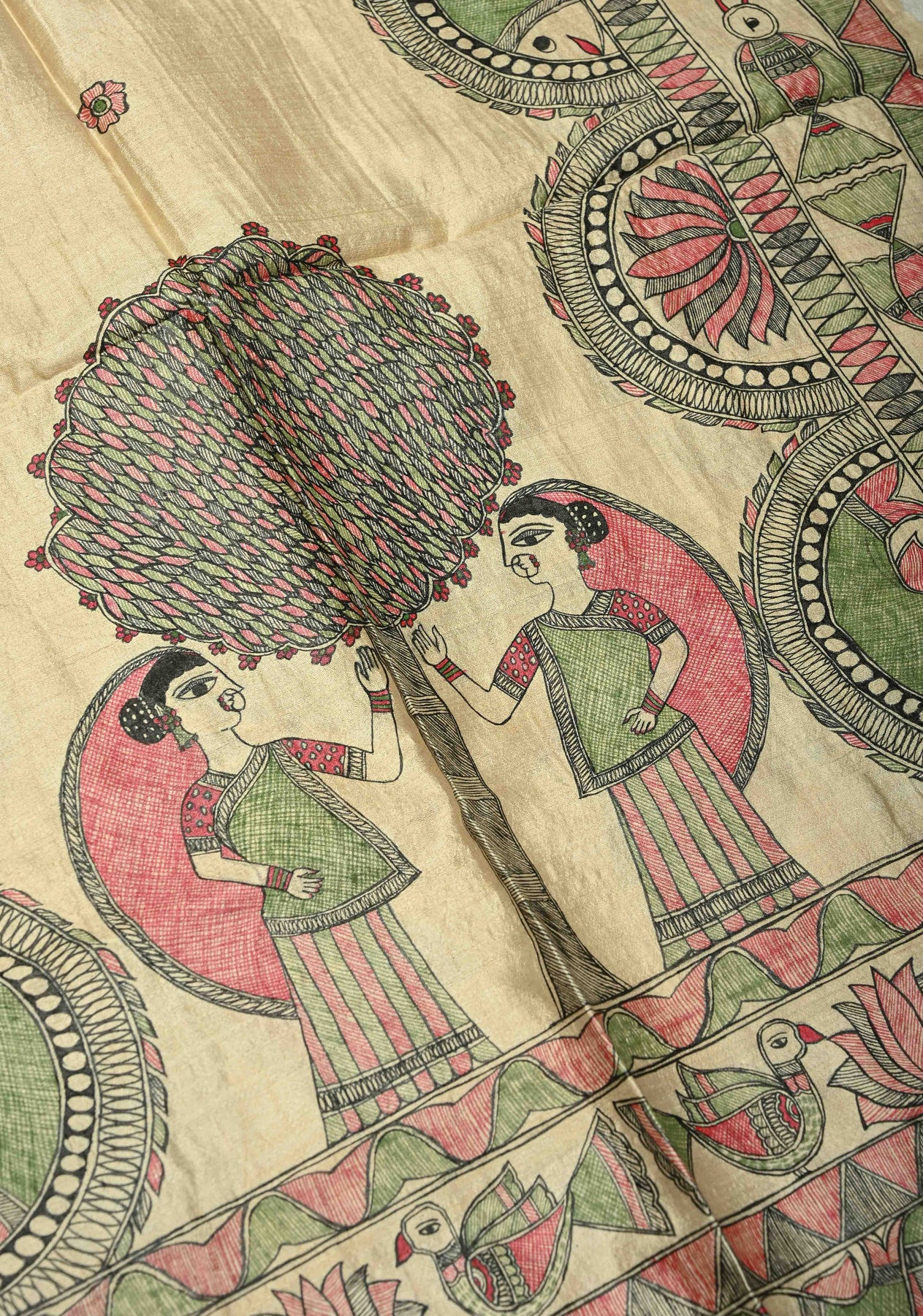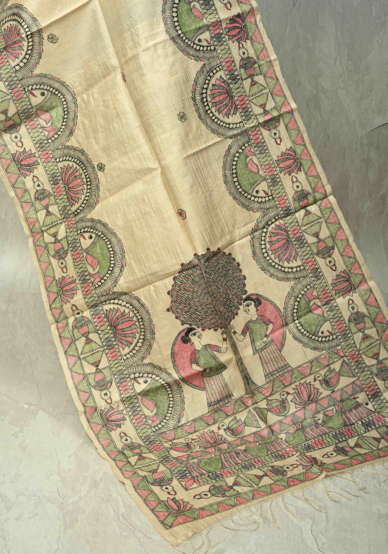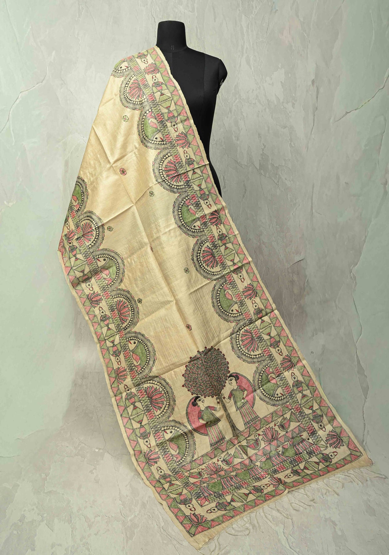 A beige Tussar silk hand-painted Madhubani dupatta is a graceful fusion of subtle elegance and traditional artistry. Crafted from richly textured Tussar silk, the beige hue offers a refined and versatile canvas that complements any ethnic ensemble. The highlight of this dupatta lies in its intricate Madhubani artwork, meticulously hand-painted by skilled artisans using age-old techniques. Each motif, inspired by nature, folklore, and cultural heritage, adds depth, character, and vibrant detailing to the piece. Lightweight yet luxurious, this dupatta drapes effortlessly and serves as a timeless accessory perfect for festive occasions, cultural events, or elevating everyday traditional wear.