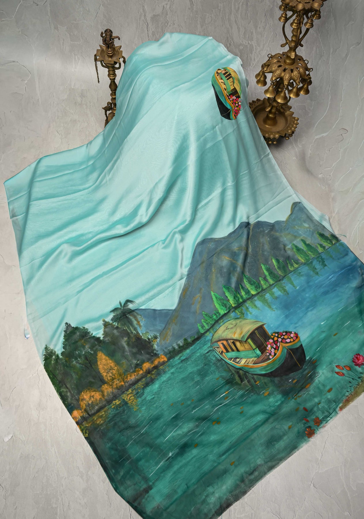 The highlight of this saree is the hand-painted pallu, featuring a beautifully detailed houseboat gliding across a calm lake. Painted by skilled artisans, the scene captures soothing blues, gentle reflections, and picturesque tranquility—transforming the pallu into a wearable canvas of nature and artistry.