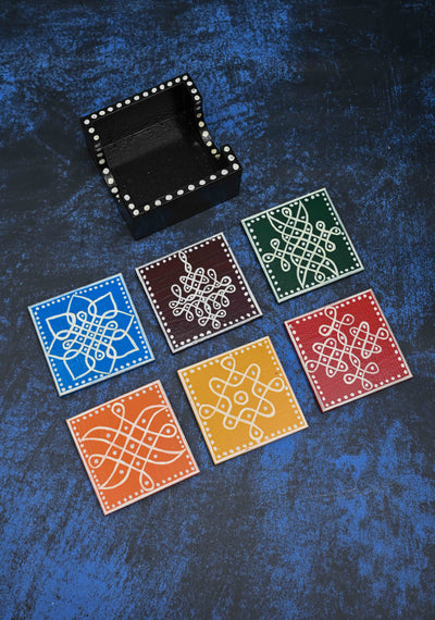 Wooden Kolam Coasters 6 Peice with holder