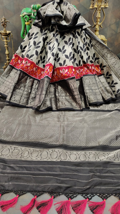 Gray-Red Pure Ikkat Kanjivaram Fusion Silk Saree with Floral Motif and with Antique Silver Zari Border | SILK MARK CERTIFIED