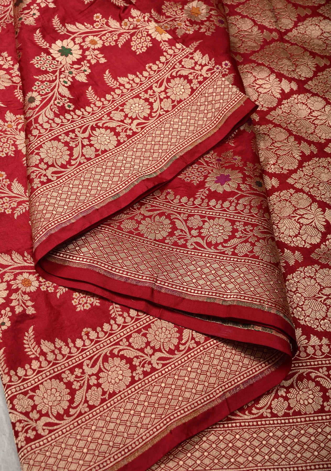 Turn heads in this striking Red Banarasi Meenakari Katan Silk Saree, a timeless weave that exudes regal charm and traditional artistry. Crafted from luxurious Katan silk, the saree features a bold chevron pattern woven with precision, adding a modern twist to its classic roots.
