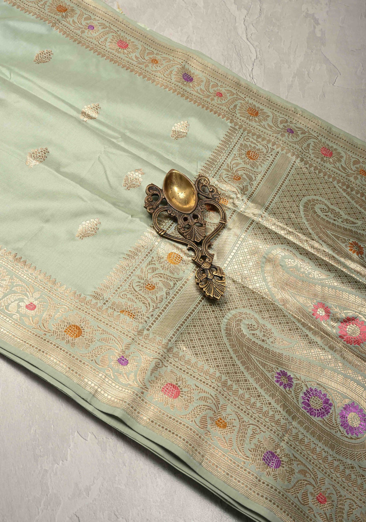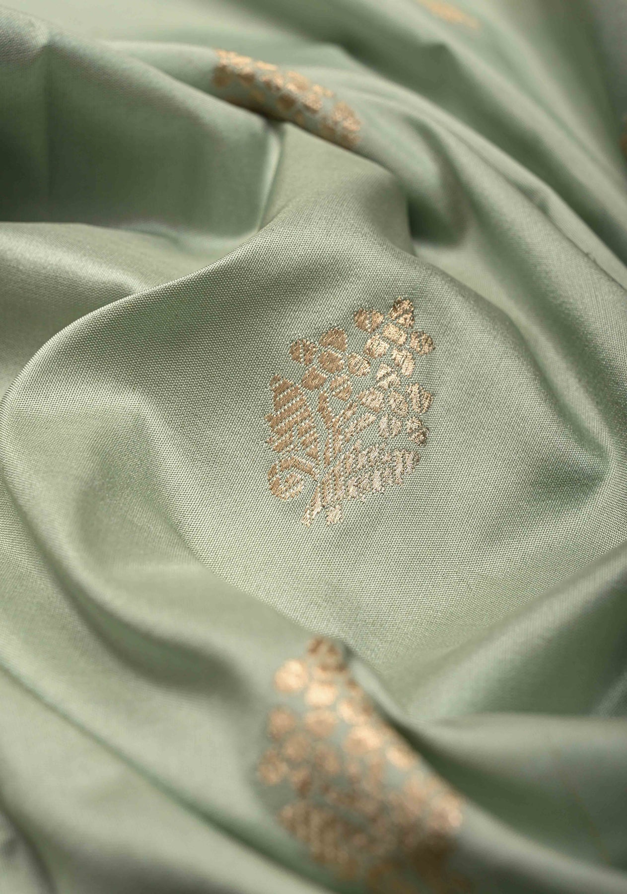 Embrace subtle elegance with this Sage Green Pure Banarasi Katan Silk Saree, a masterpiece that blends timeless tradition with graceful charm. Woven from Katan silk, this saree features delicate floral zari buttas scattered across its serene sage green fabric, creating a soft yet captivating pattern.