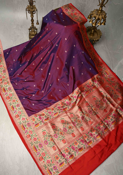 Purple -pink Dual Tone Pure Banarasi Katan Silk Saree with Floral Zari buttas and Contrast Paithani Border-Pallu | SILK MARK CERTIFIED