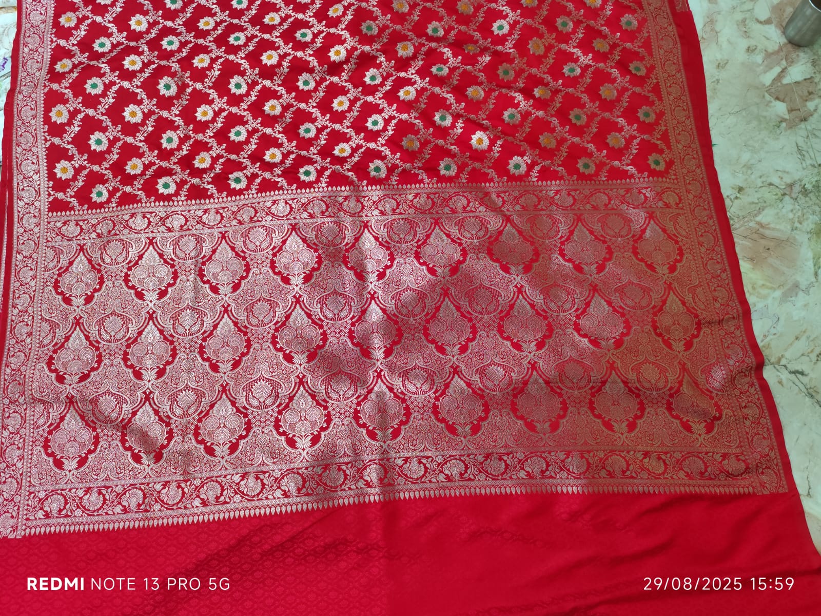 Red Banarasi Semi Mashru Silk Saree with Floral Meenakari Jaal and Zari Border