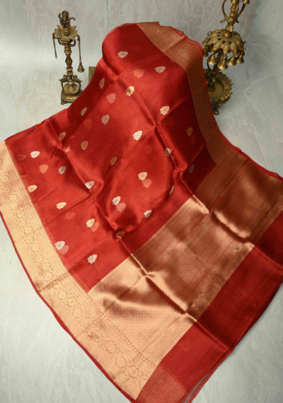 Dark Red Pure Banarasi Organza Tissue Silk Saree with Gold Siver Buttas and Zari Border | SILK MARK CERTIFIED