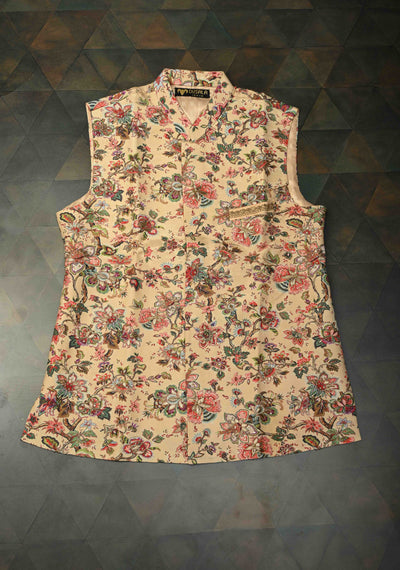 Peach Floral Digital Print on Bandhgala Silk Full Waistcoat for Men with Thread and Sequins Hand Embroidery | Made To Order