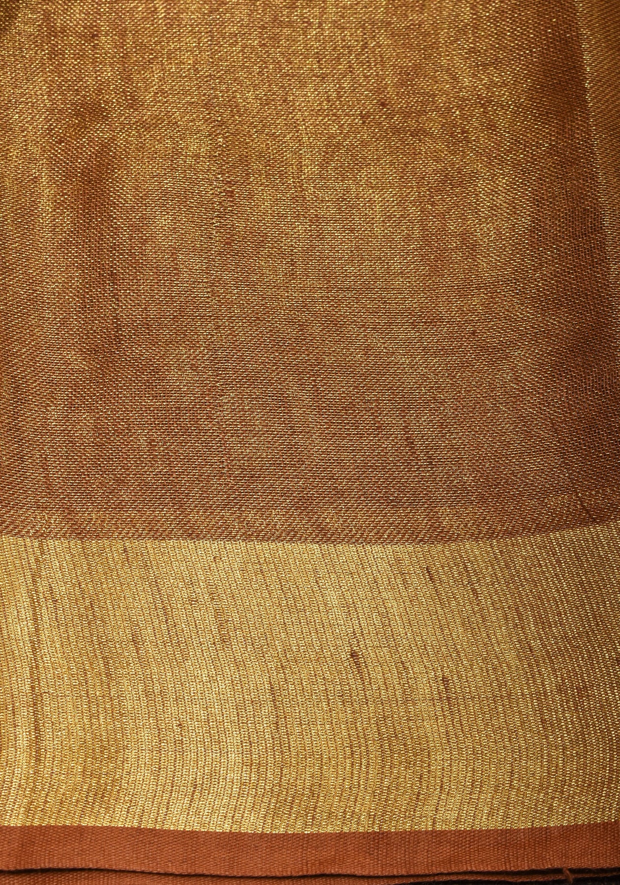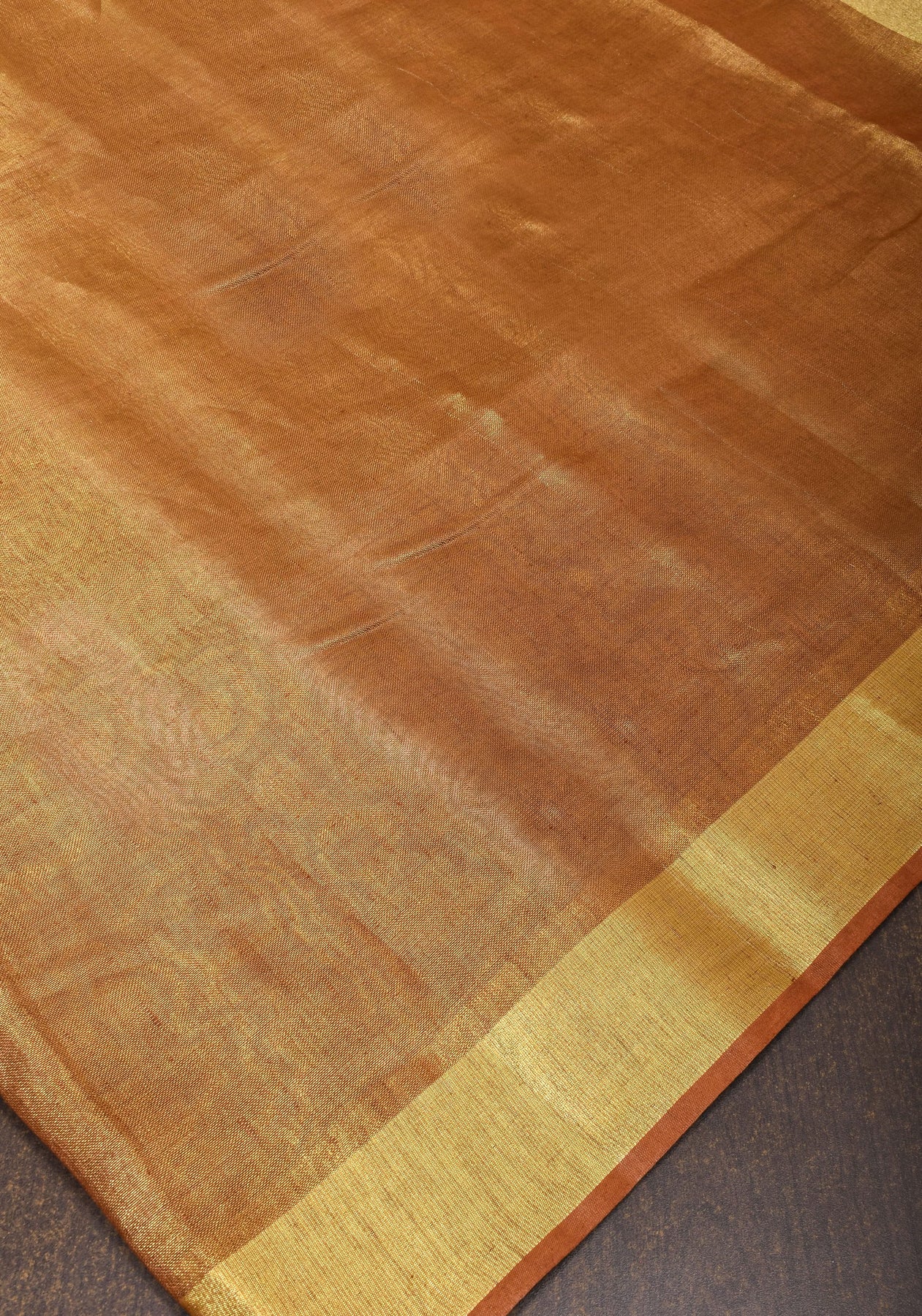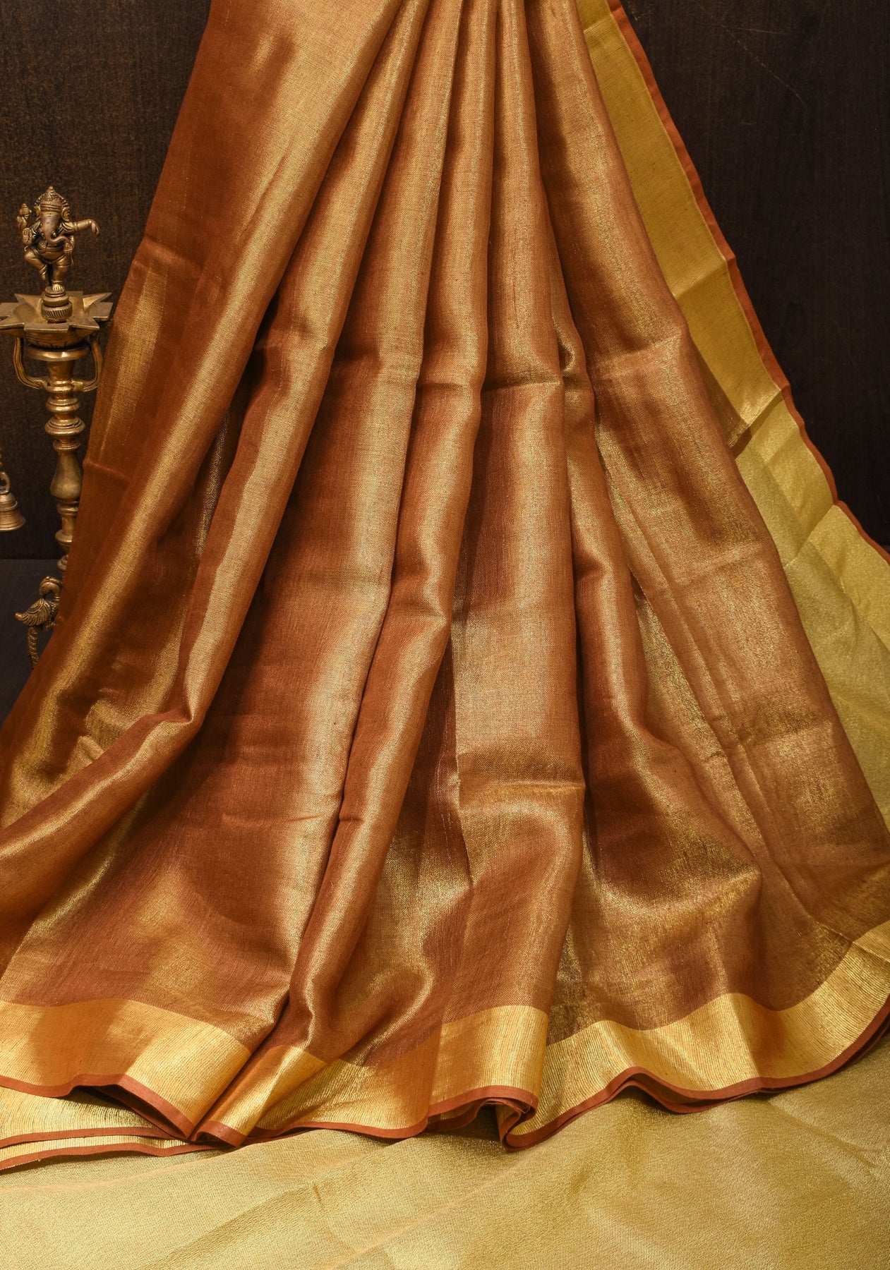 Caramel and Gold Tissue Linen Saree with Zari Border and long tassels
