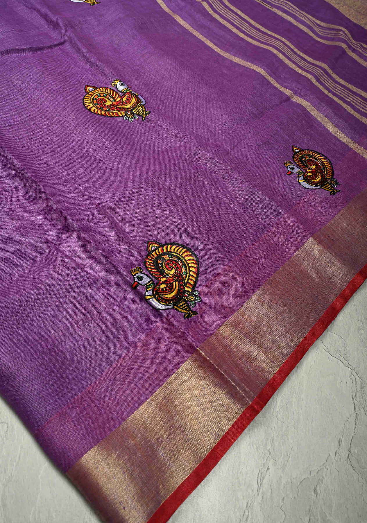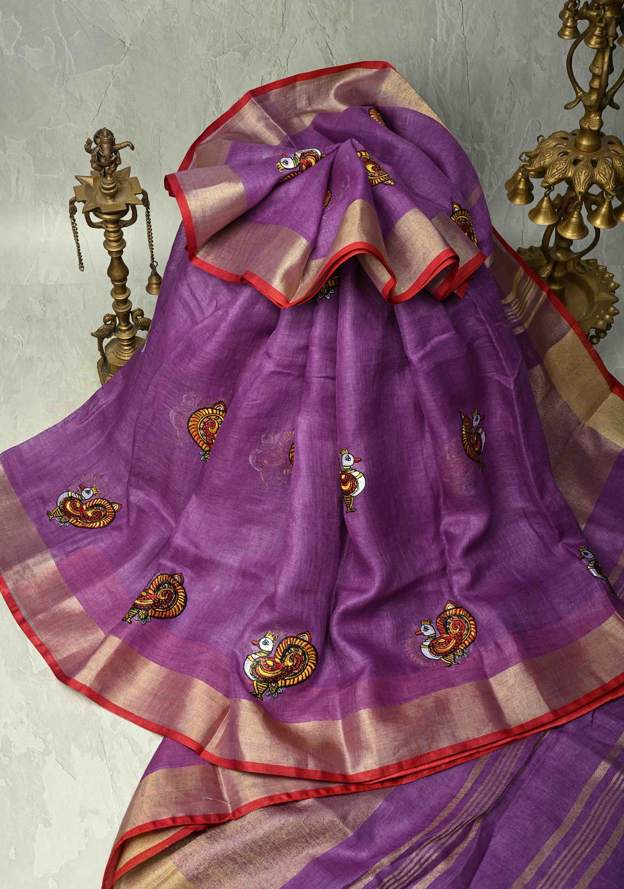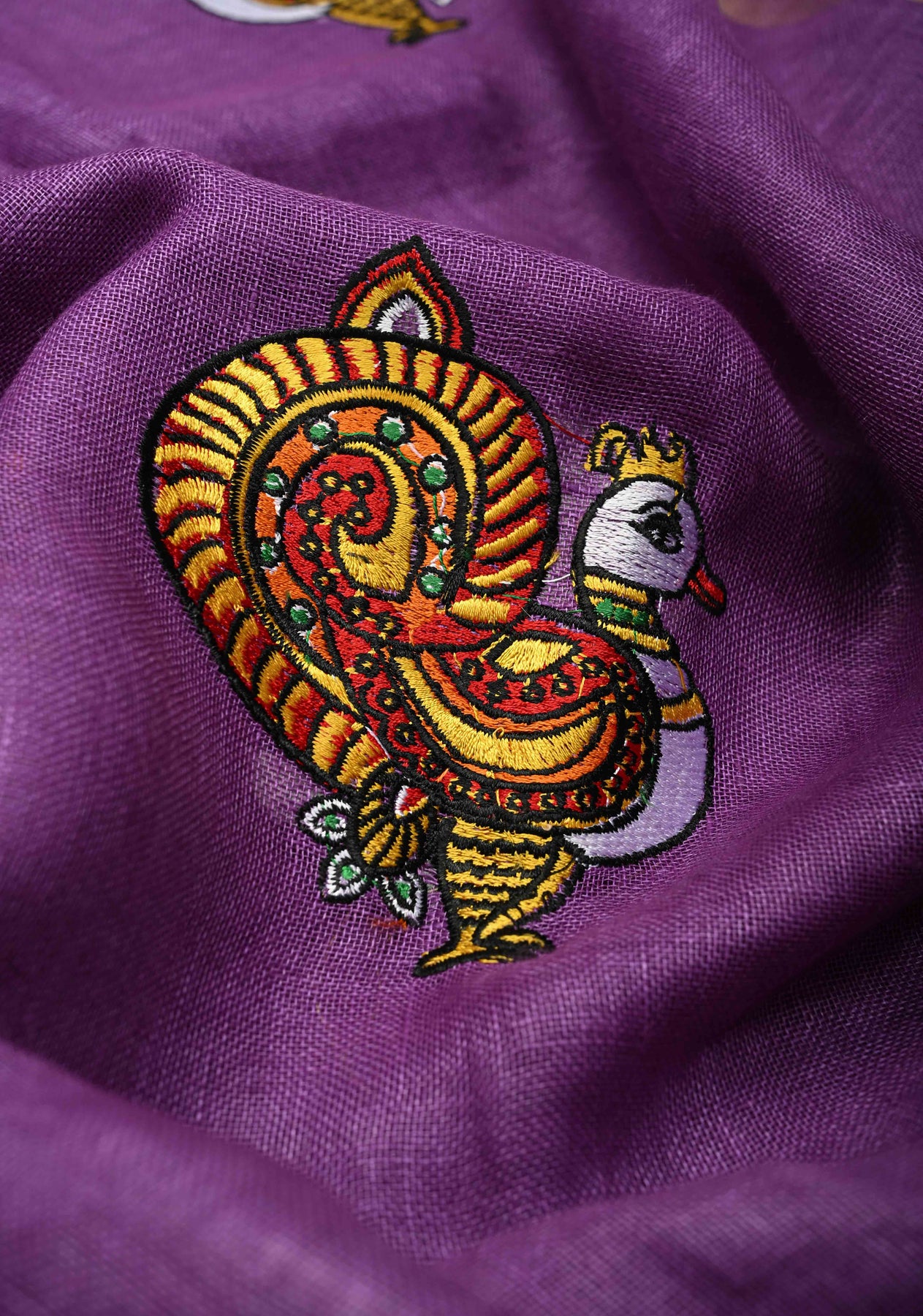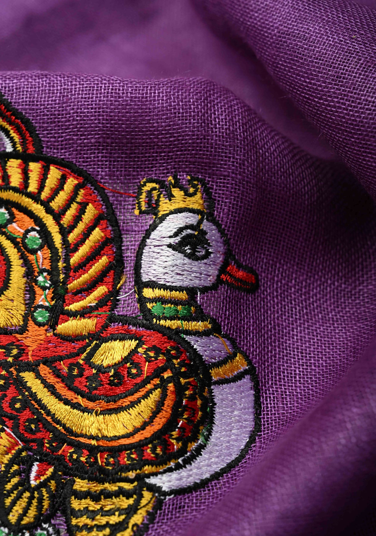 The Annapakshi - The Divine Swan Embroidered Motifs on Linen Saree in Purple is a stunning blend of tradition and artistry. The purple hue adds a regal touch, while the intricate Annapakshi (divine swan) embroidered motifs along the fabric bring a sense of ethereal beauty. The fine linen material ensures comfort and breathability, making it perfect for both casual and festive occasions. The delicate embroidery, inspired by mythical swans, adds a layer of sophistication and cultural depth, making this saree a unique choice for special events. Whether you're attending a wedding or a traditional celebration, this saree's blend of elegance, tradition, and comfort is sure to make a statement.