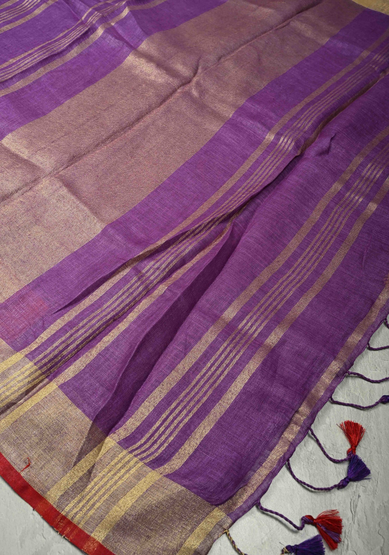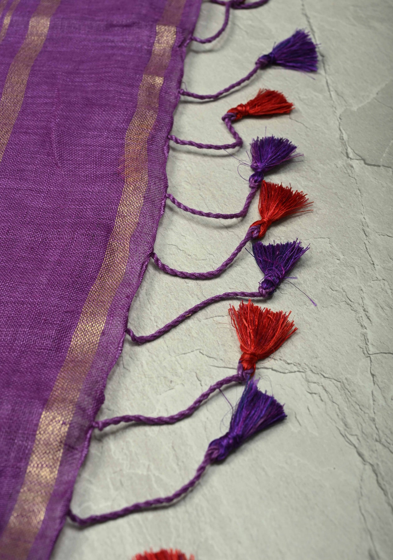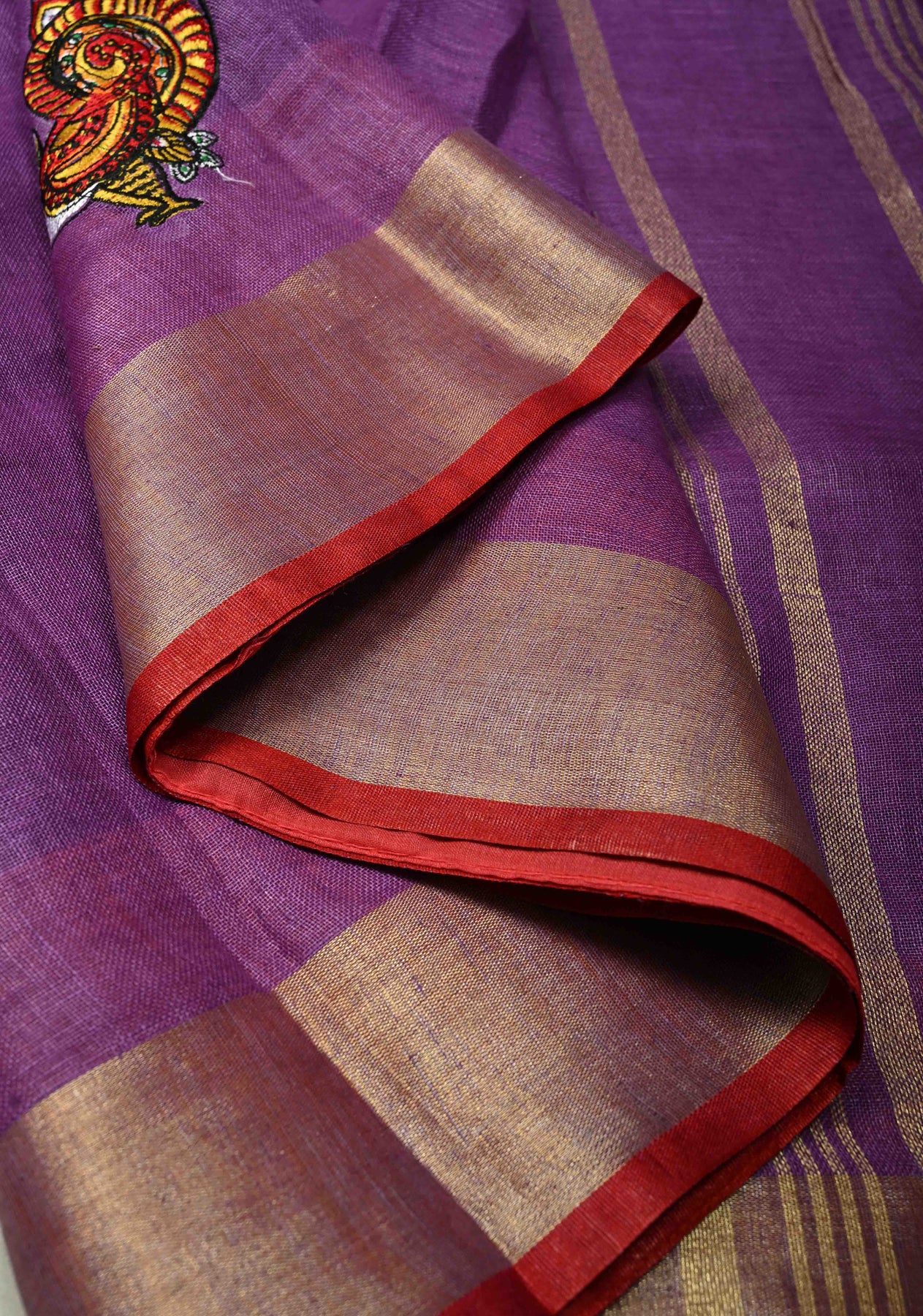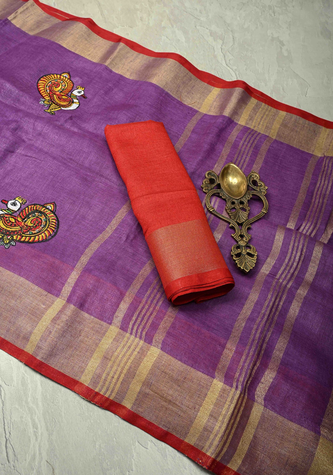 The Annapakshi - The Divine Swan Embroidered Motifs on Linen Saree in Purple is a stunning blend of tradition and artistry. The purple hue adds a regal touch, while the intricate Annapakshi (divine swan) embroidered motifs along the fabric bring a sense of ethereal beauty. The fine linen material ensures comfort and breathability, making it perfect for both casual and festive occasions. The delicate embroidery, inspired by mythical swans, adds a layer of sophistication and cultural depth, making this saree a unique choice for special events. Whether you're attending a wedding or a traditional celebration, this saree's blend of elegance, tradition, and comfort is sure to make a statement.