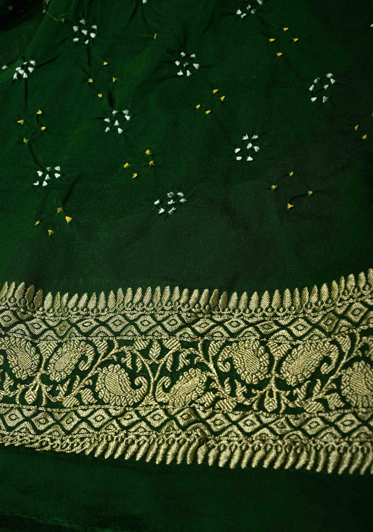 This Authentic Rainbow Hand Bandhej Banarasi Jaal Silk Georgette Saree is a vibrant celebration of traditional artistry and elegance. The saree showcases exquisite handcrafted bandhej patterns in a spectrum of radiant hues, beautifully enhanced with an intricate Banarasi zari jaal that adds a touch of opulence. The contrasting green pallu with rich zari border completes the look with regal charm. Crafted in luxurious silk georgette, it drapes effortlessly, making it an ideal choice for festive occasions, weddings, and cultural celebrations.