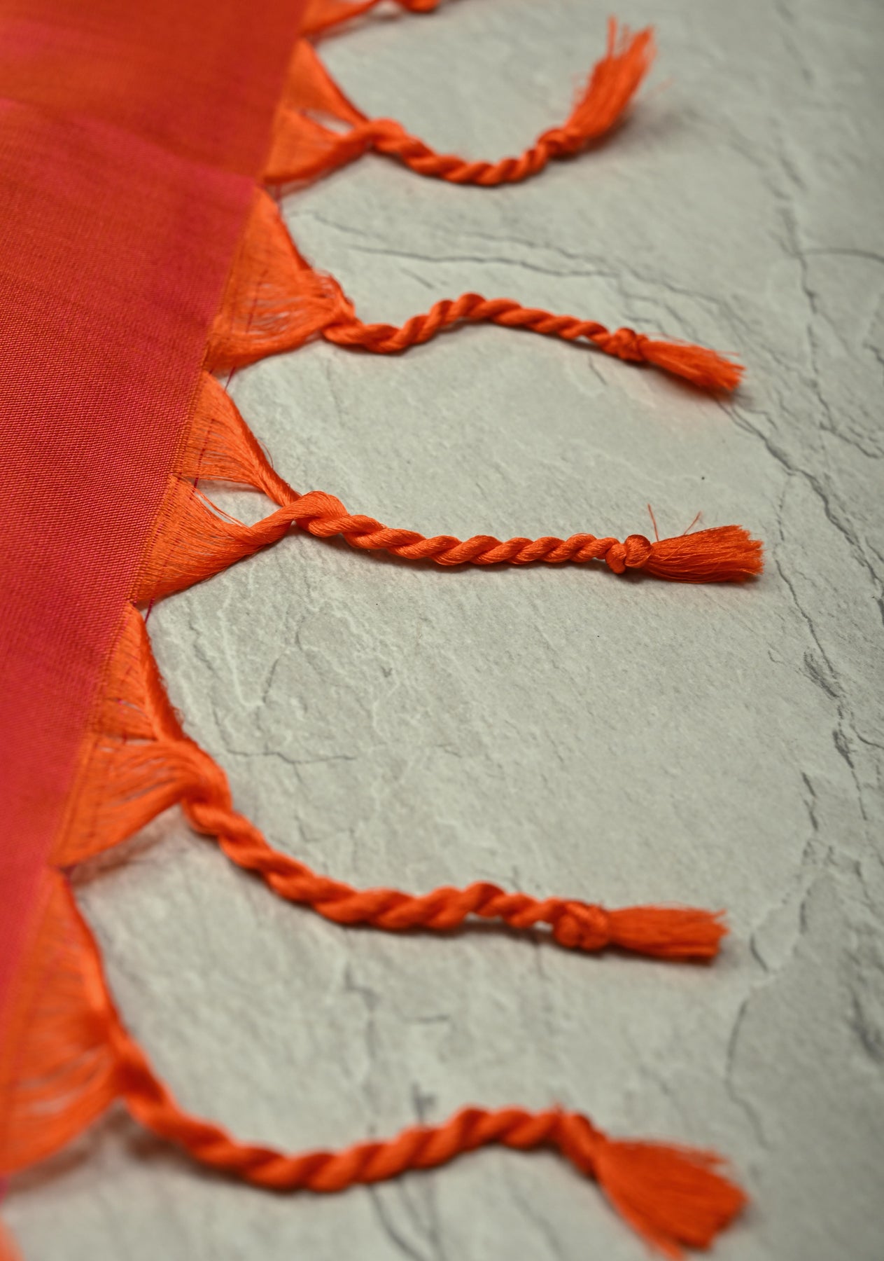 This saree is ready to wear with fall and pico done. Handmade silk tassels as seen in the pic adorn the pallu and add more grace to it. An unstitched blouse fabric is included.