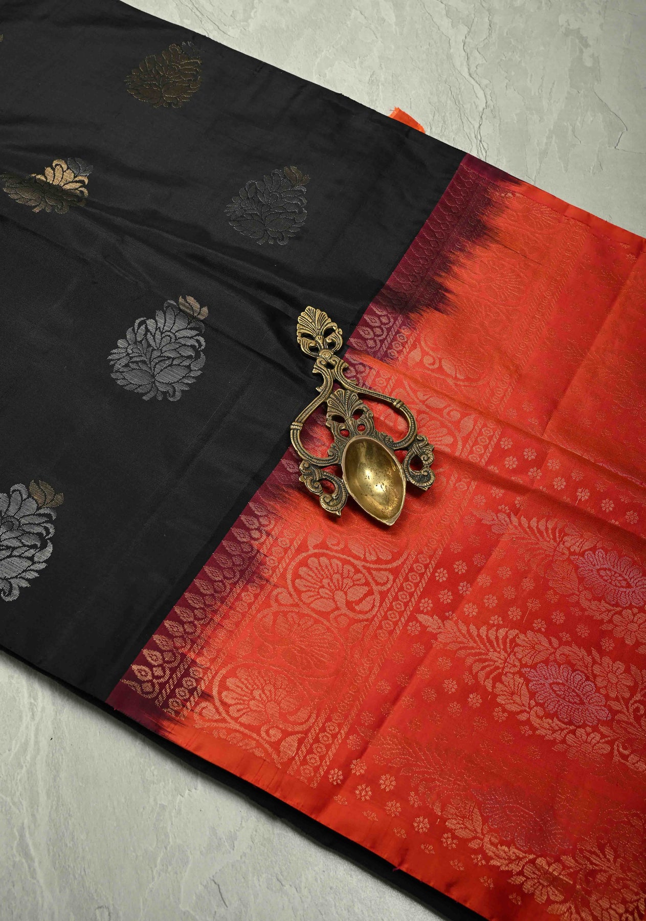 The Black Borderless Kanjivaram Soft Silk Saree exudes modern elegance with a touch of classic charm. Crafted from soft silk, the saree features black body adorned with delicate gold–silver buttas, adding a subtle yet luxurious shimmer. The absence of a border enhances its sleek, contemporary appeal, allowing the intricate motifs to stand out gracefully. Complementing the minimalistic body is a striking contrast pallu, intricately woven with traditional zari patterns that elevate the saree’s overall richness. Lightweight, graceful, and effortlessly stylish, this saree is perfect for festive events, evening functions, and elegant celebrations.