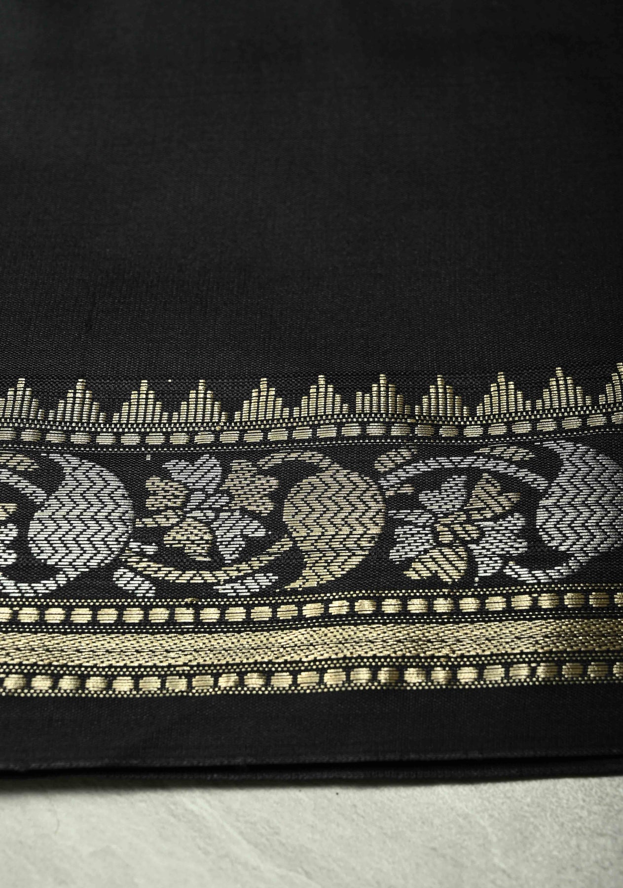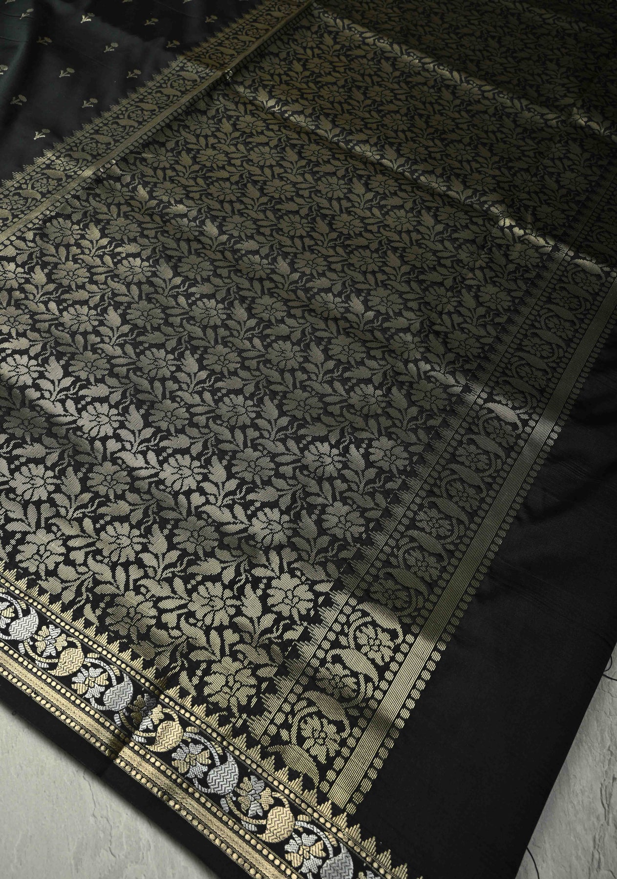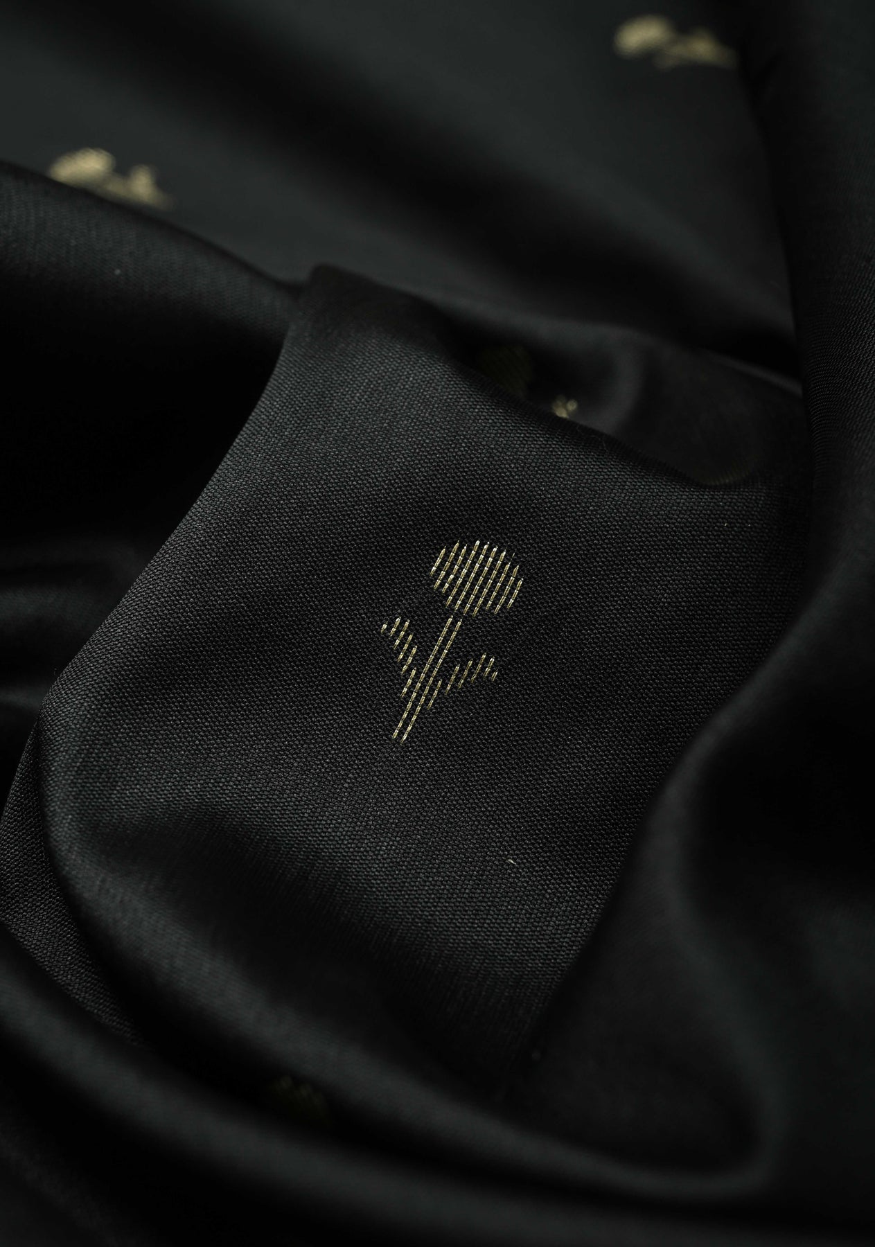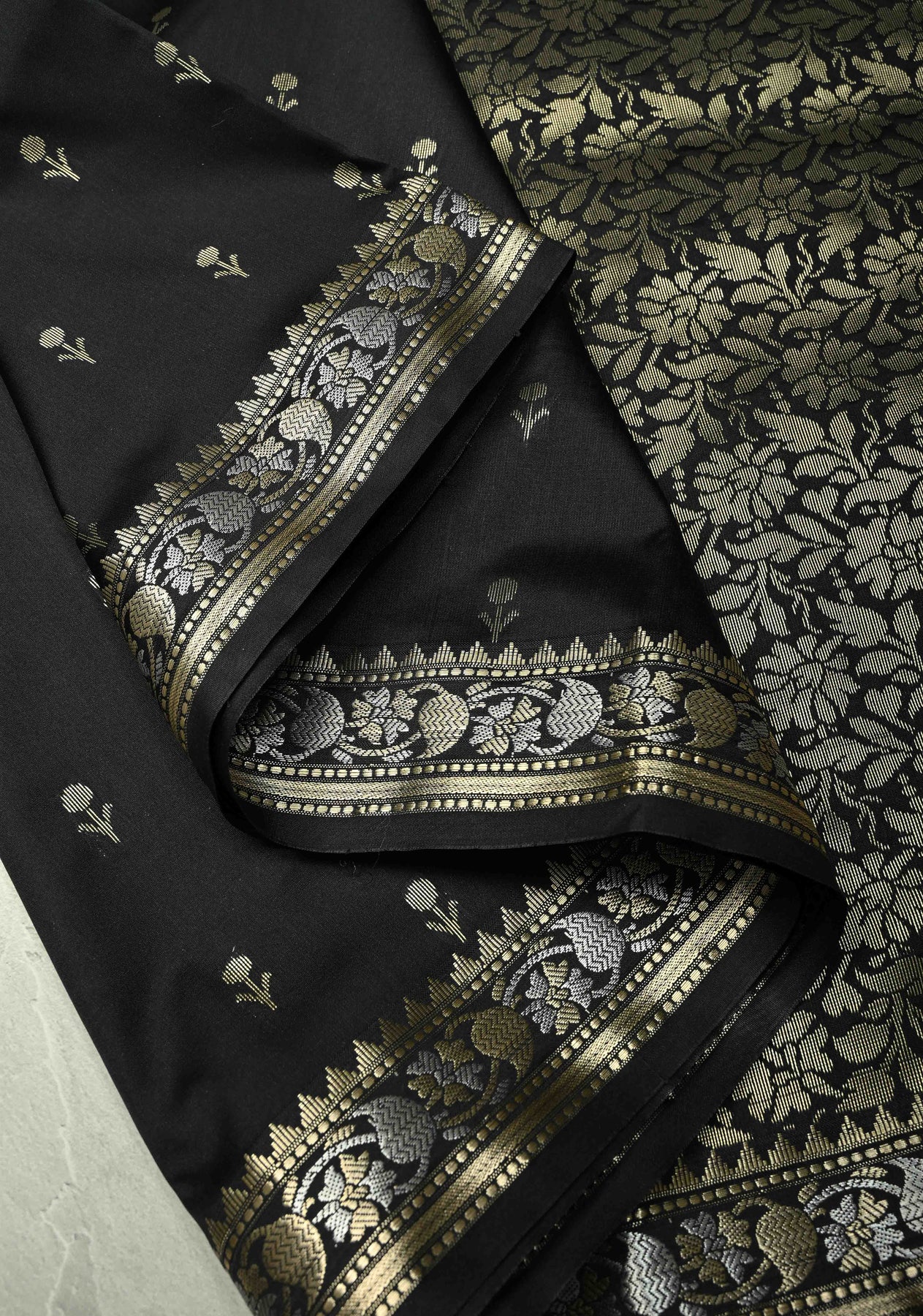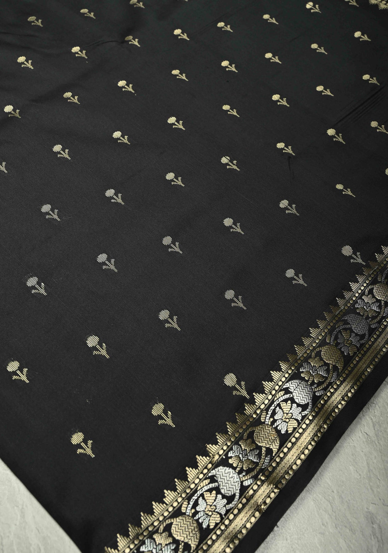 The Black Semi Silk Saree with Floral Buttis and Alfi Zari Border exudes sophistication and timeless charm. The black color serves as an elegant canvas for the delicate floral buttis, which are subtly embroidered across the saree to add an intricate touch of beauty. Crafted from a semi-silk fabric, this saree strikes the perfect balance between richness and comfort, offering a graceful drape. The Alfi zari border adds a hint of sparkle, giving the saree an elevated, traditional look with a modern edge. Ideal for receptions, or any special occasion, this saree is a versatile choice for those seeking understated elegance with a touch of glamour.