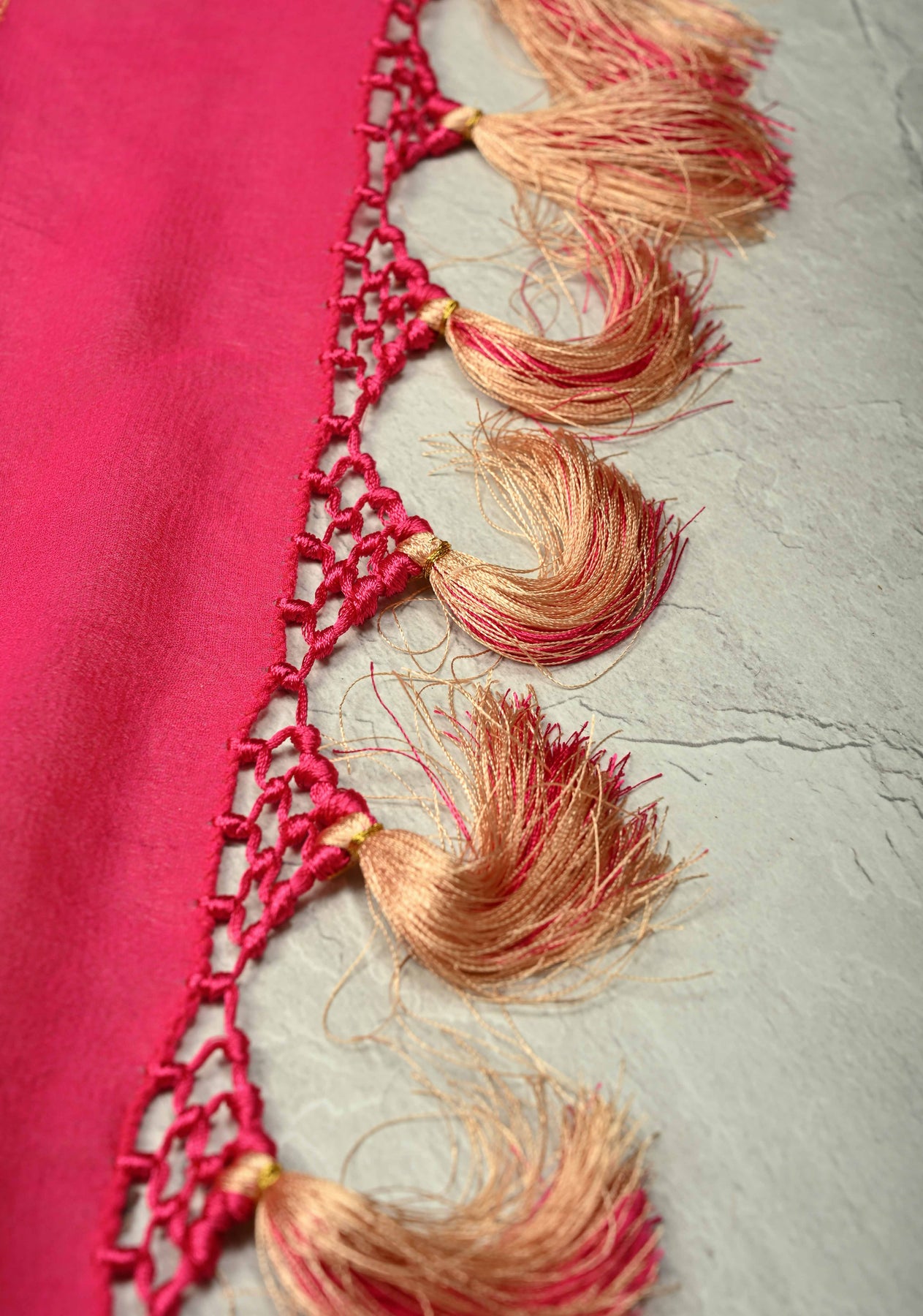 This saree is ready to wear with fall and pico done. Handmade silk tassels adorn the pallu and add more grace to it. An unstitched blouse fabric is included.