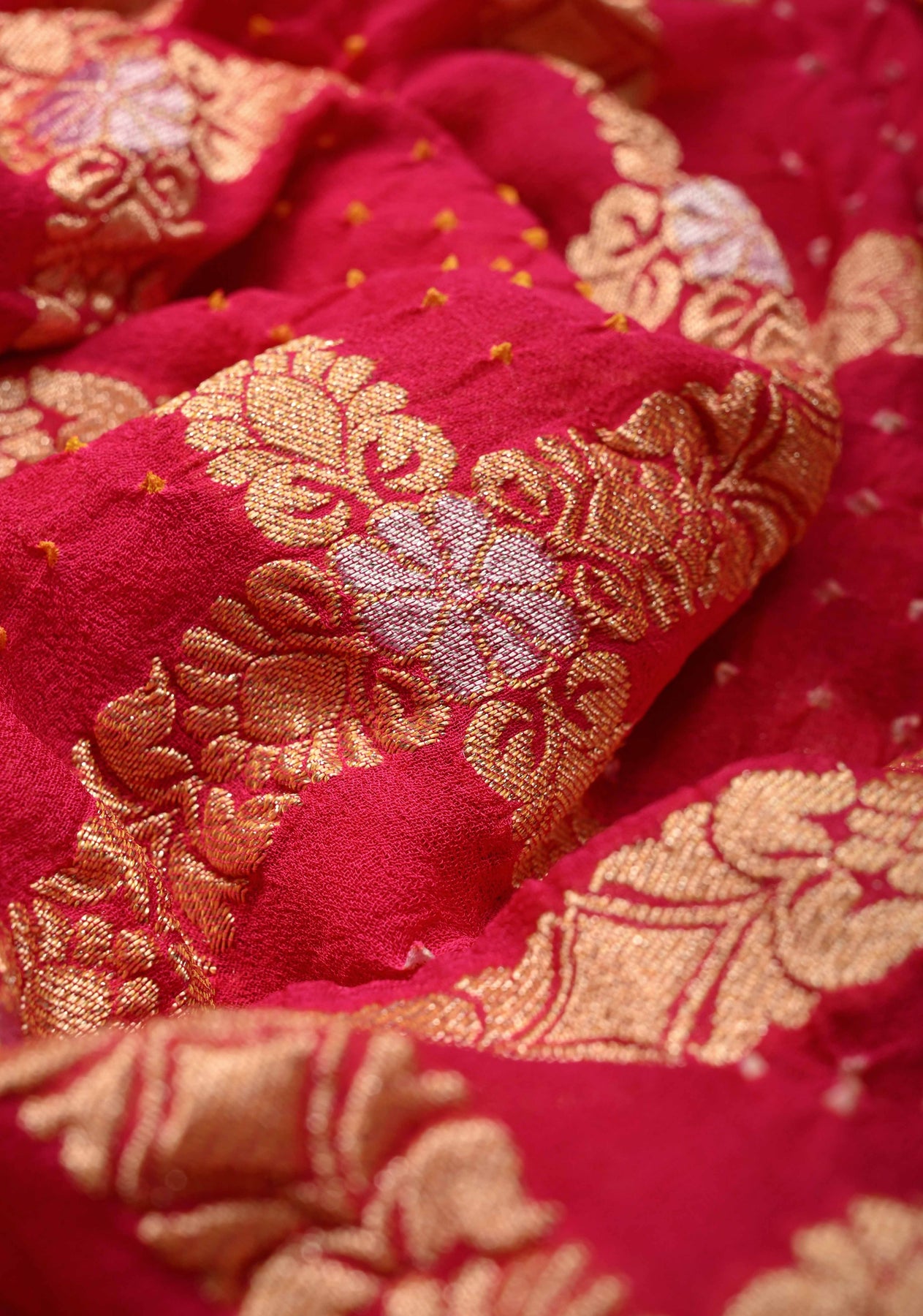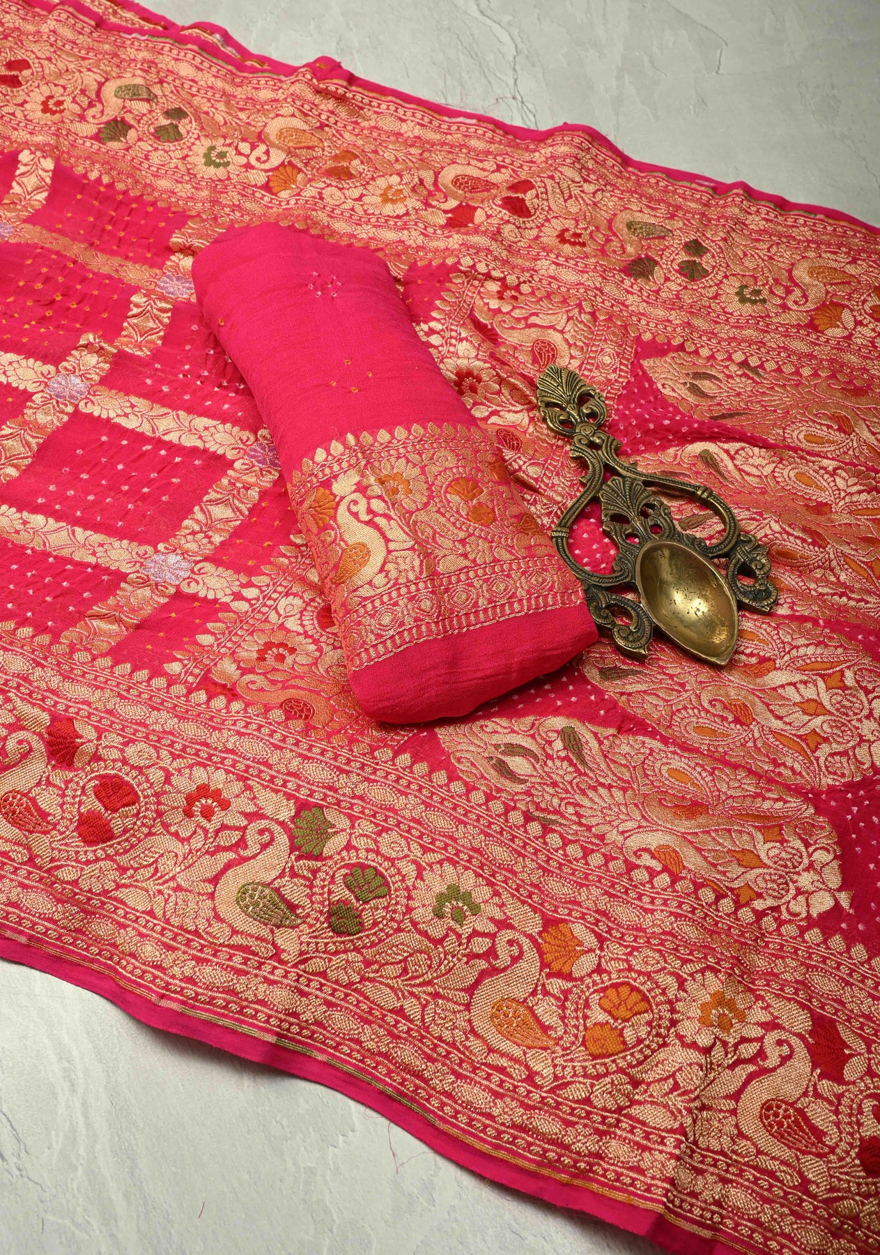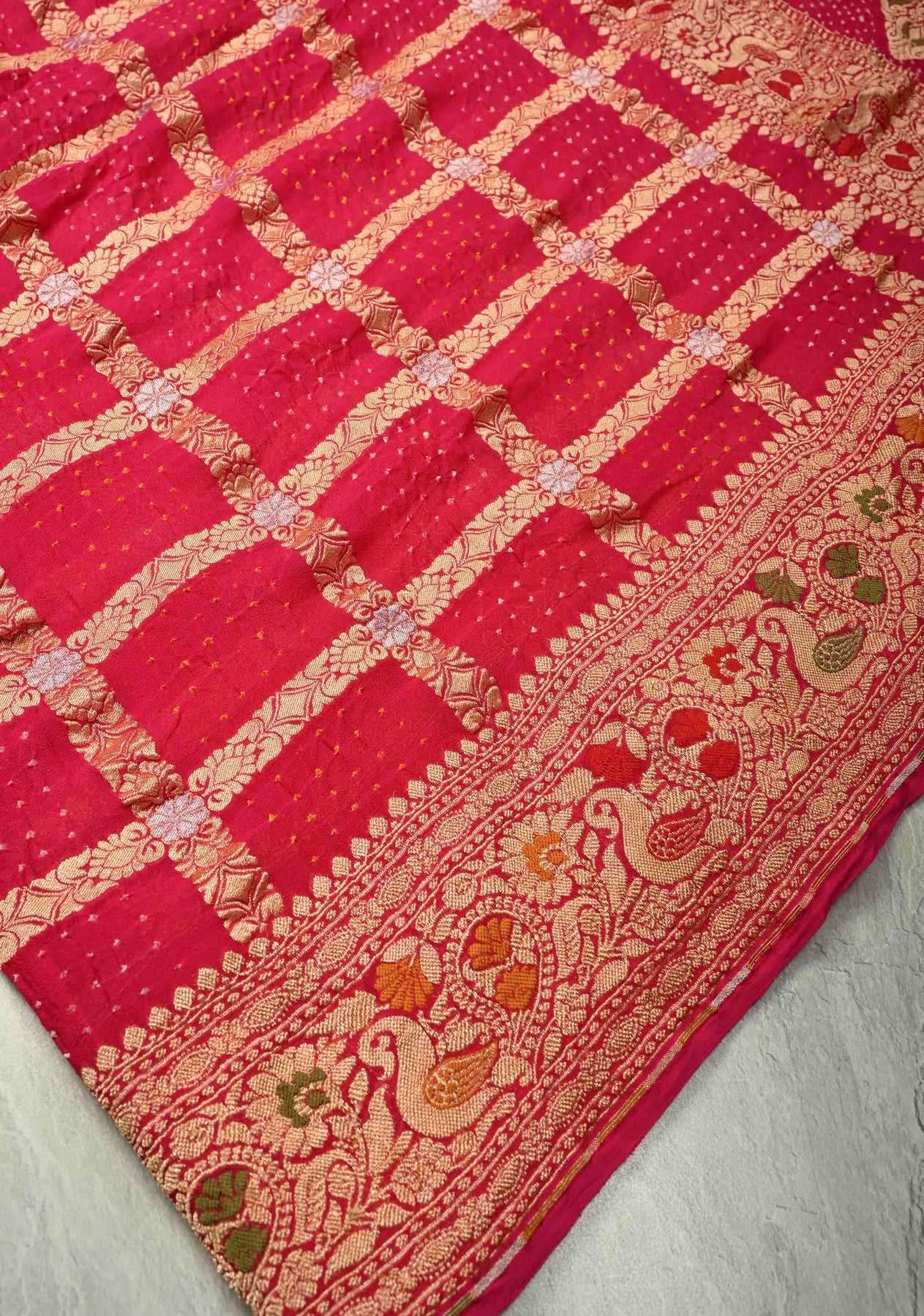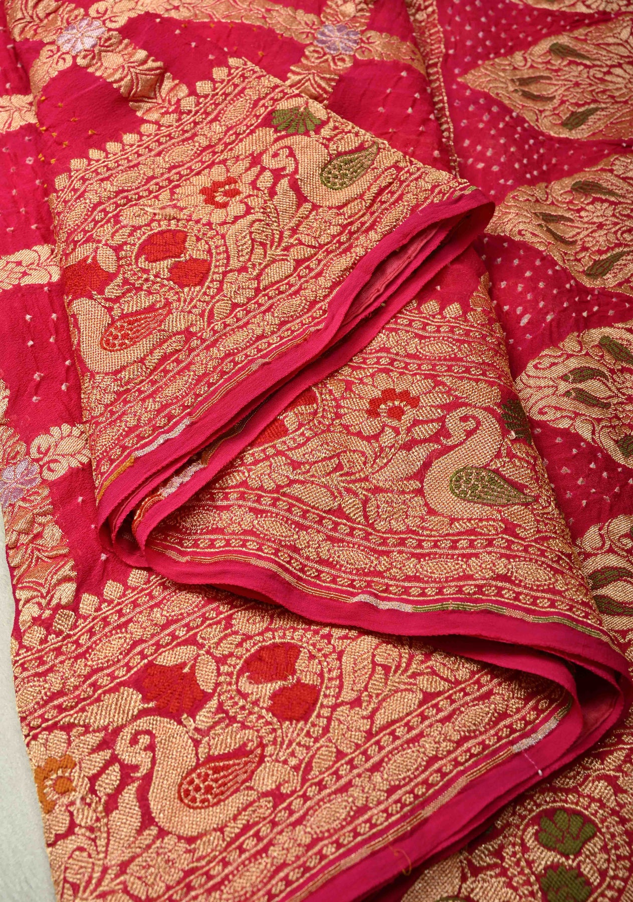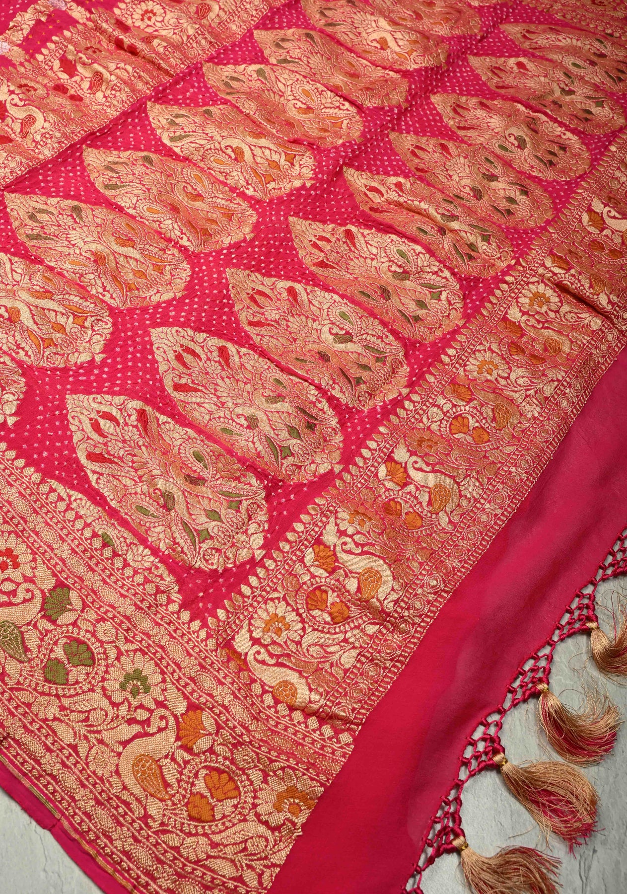 Bright Pink Sarkam Bandhej on Pure Banarasi Silk Georgette Saree with Gharchola Design and Meenakari Border | SILK MARK CERTIFIED