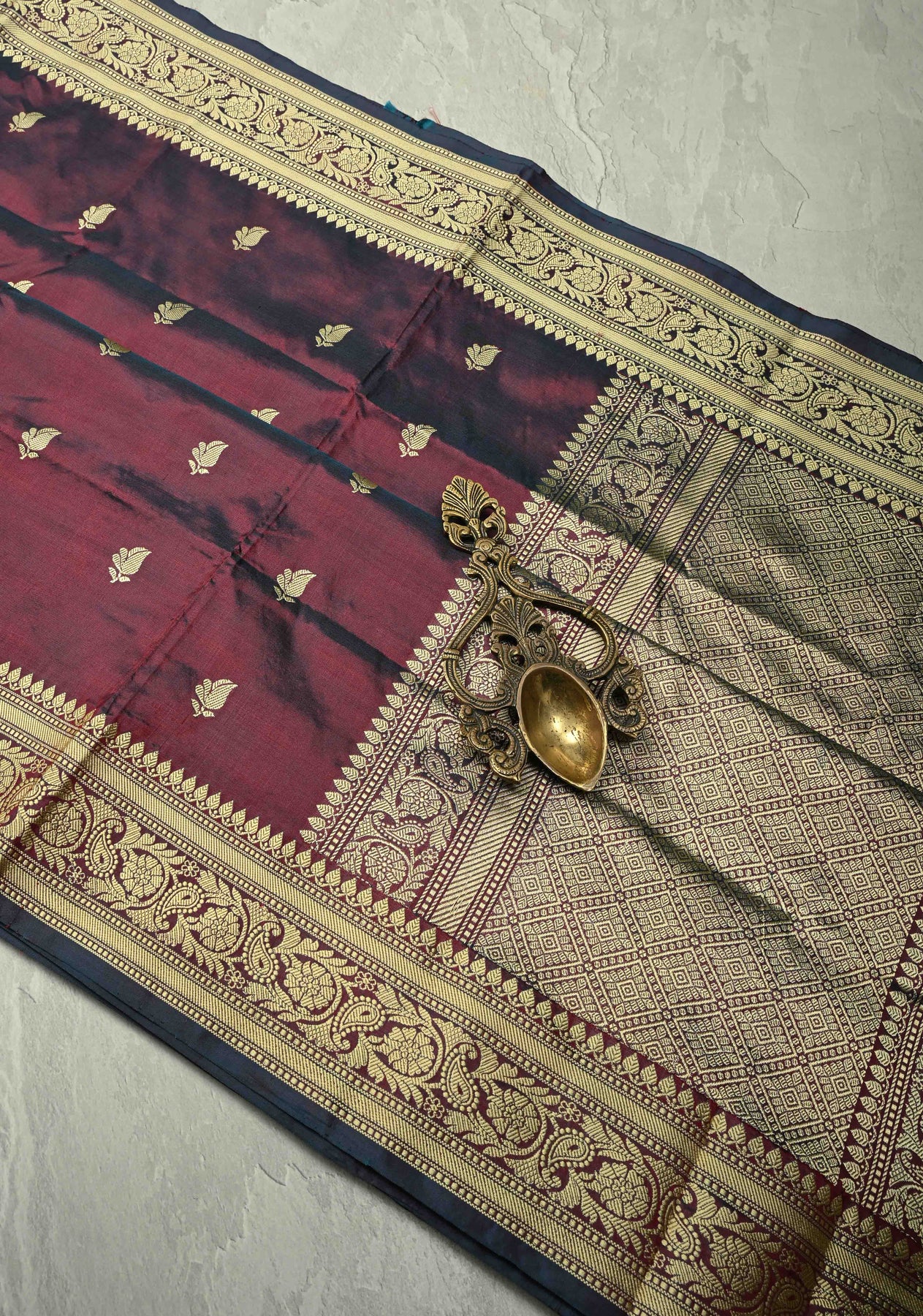 This Burgundy Dual Tone Lightweight Banarasi Katan Silk Saree is a stunning fusion of elegance and tradition. Crafted from Katan silk, it boasts a subtle sheen and smooth drape, making it comfortable yet luxurious. The saree is adorned with delicate Resham buttas intricately woven across its body, while the contrasting Banarasi border adds a regal touch with exquisite detailing. Its dual-tone design enhances depth and sophistication, making it perfect for weddings, festive celebrations, and special occasions. Lightweight and graceful, this saree is a timeless addition to any ethnic wardrobe.
