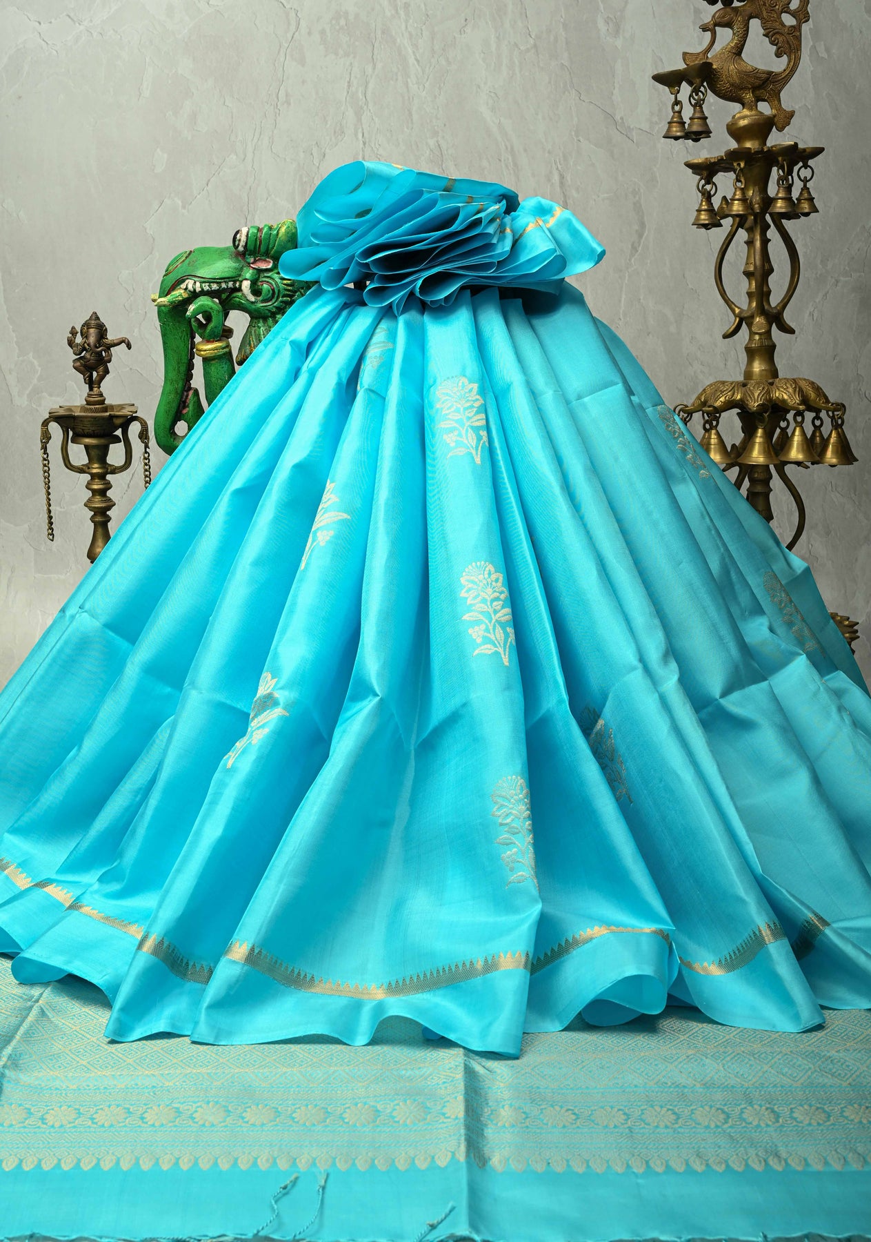 This stunning Cyan Kanjivaram soft silk saree exudes elegance and sophistication with its serene, vibrant hue. The body is adorned with delicate floral zari buttas, adding a subtle shimmer and traditional charm to the drape. A beautifully crafted zari pallu elevates the saree’s regal appeal, showcasing the exquisite artistry of Kanjivaram weaving. Lightweight, graceful, and luxurious, this saree is perfect for weddings, festive occasions, and special celebrations.