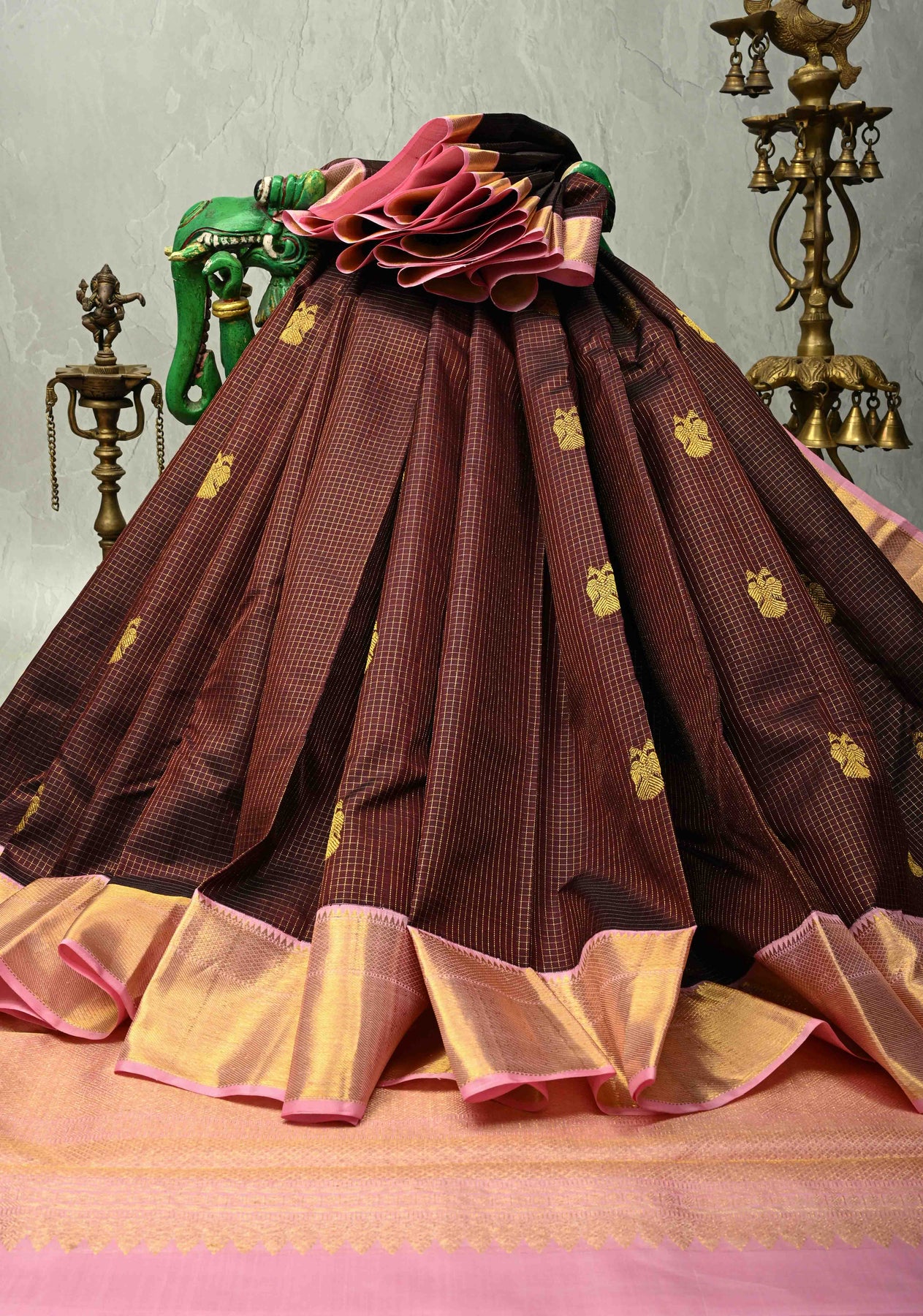 Embrace the grandeur of tradition with this magnificent Dark Brown Kanjivaram Pure Silk Saree, masterfully woven with intricate Podi Kattam (fine checkered) patterns in rich golden zari. The classic zari checks create a timeless texture, symbolizing the heritage craftsmanship of Kanchipuram weavers.