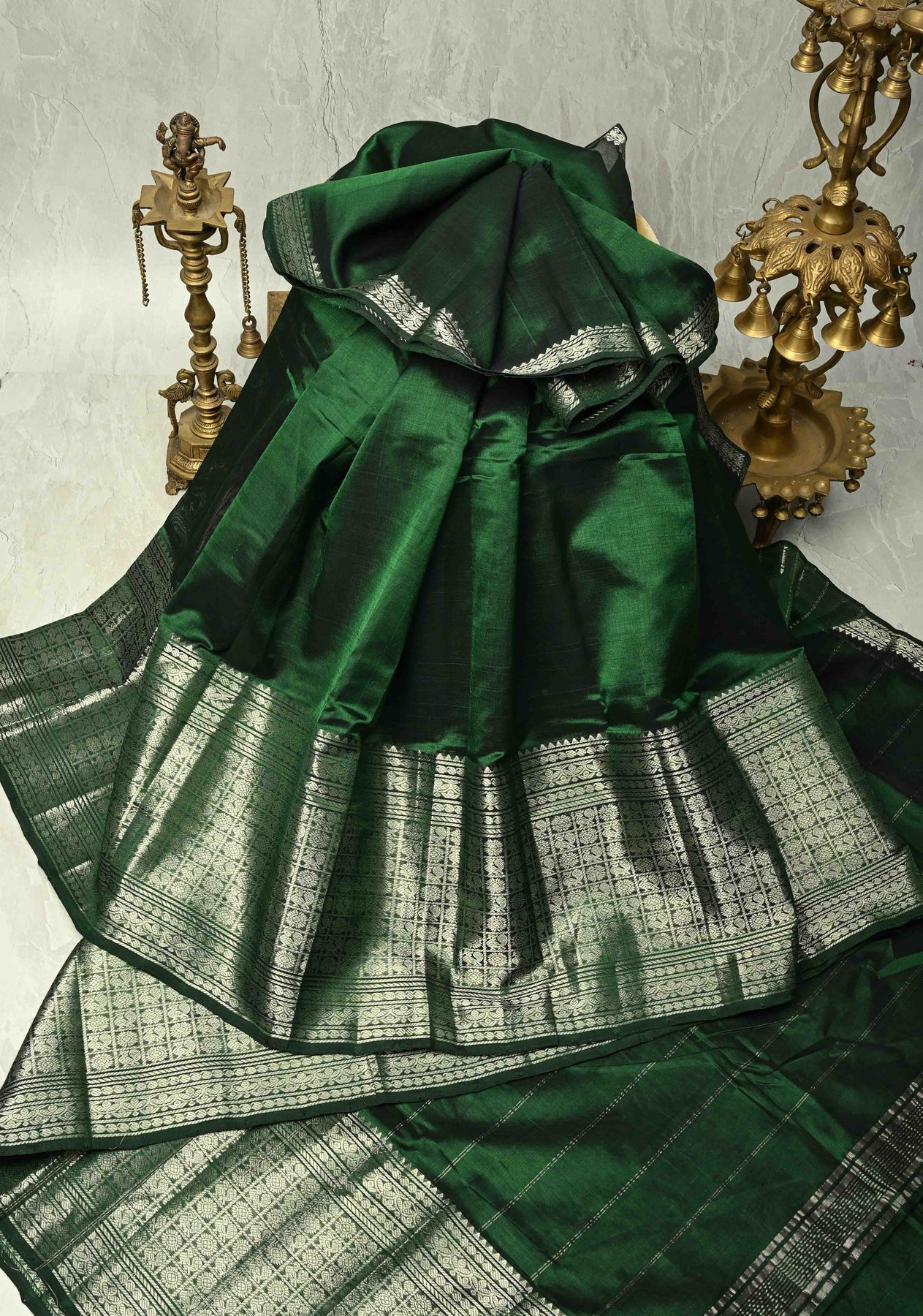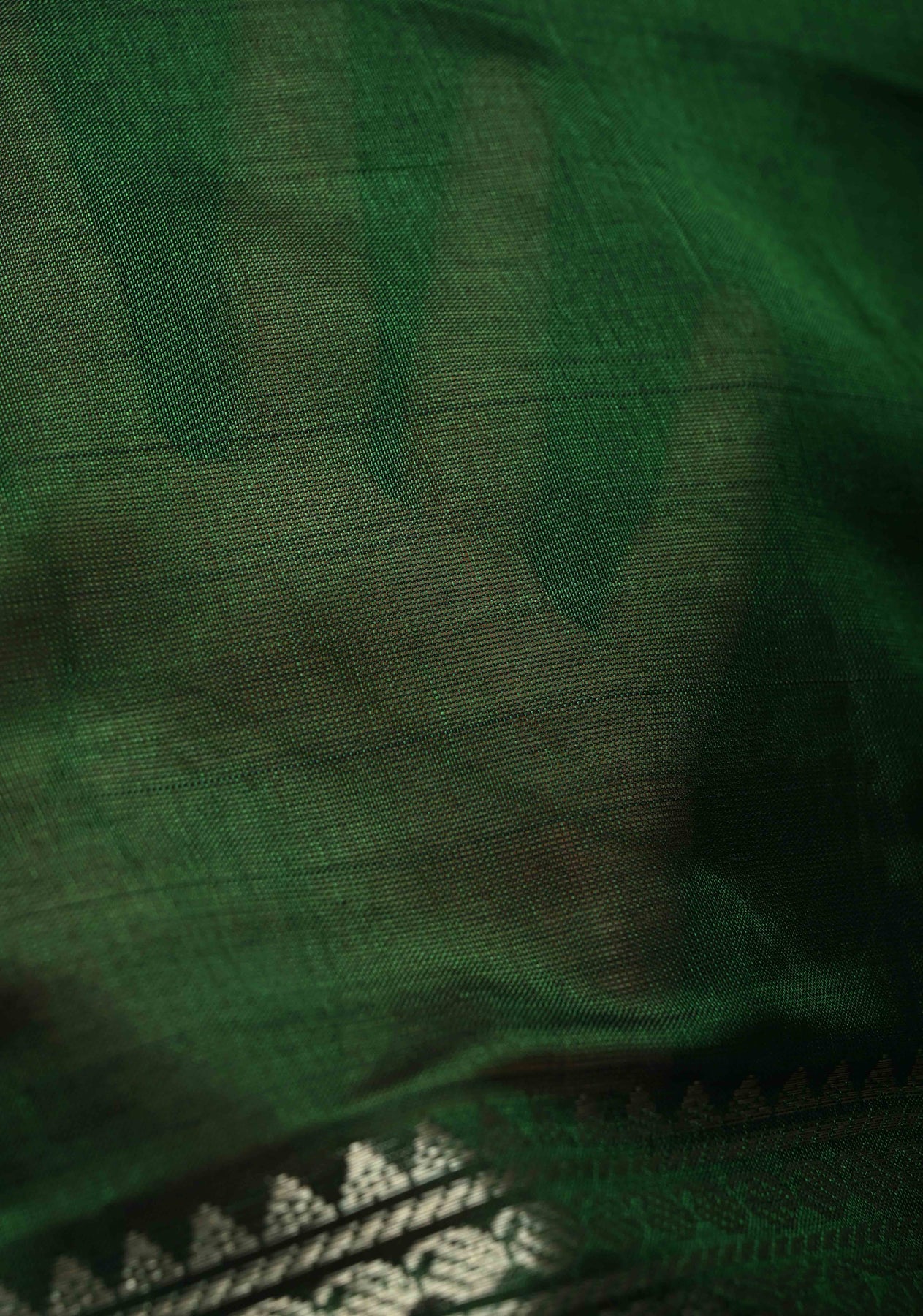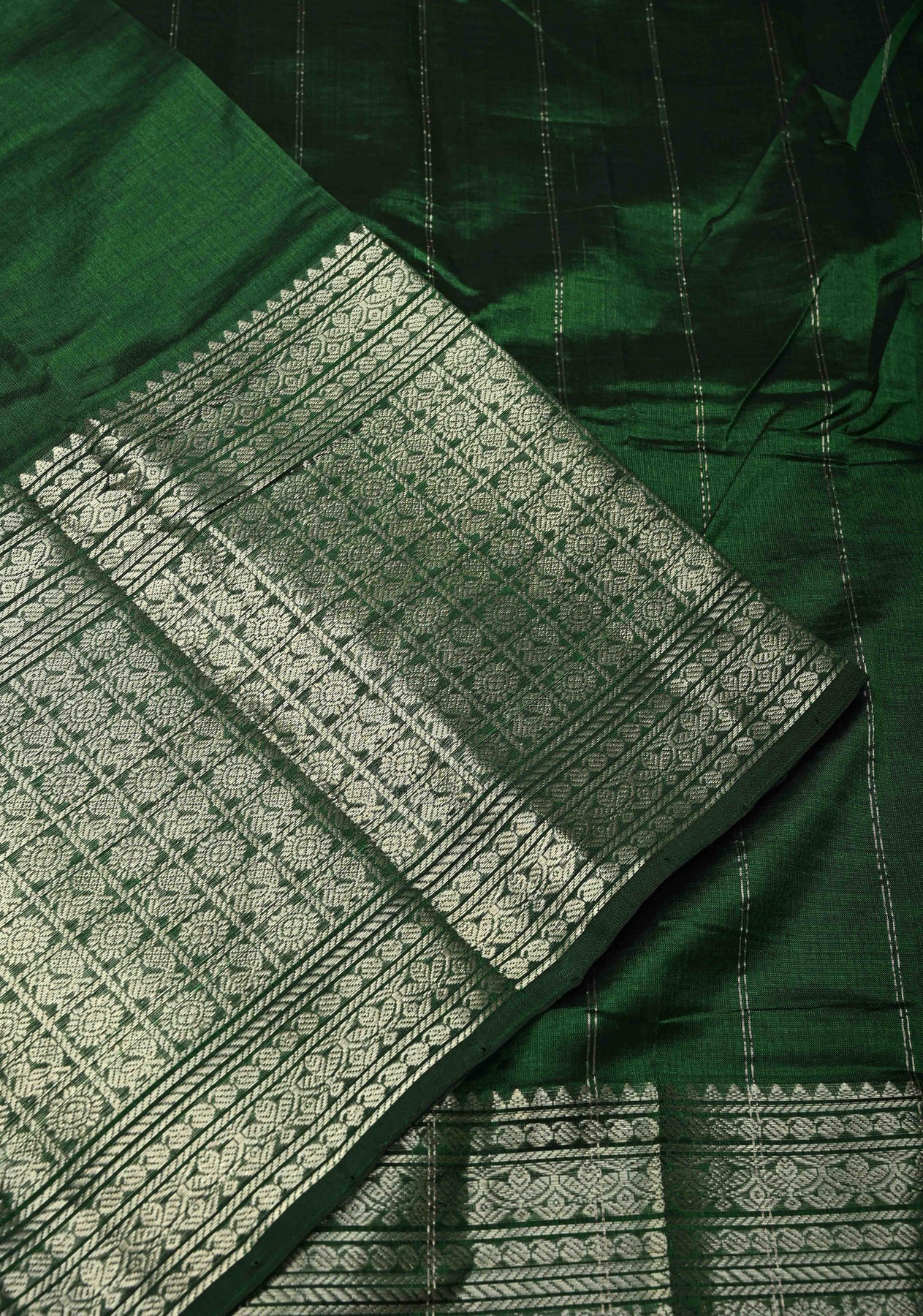 Elegant and grounded in tradition, this Dark Green Handwoven Mangalagiri Silk Cotton Saree showcases the beauty of fine South Indian craftsmanship. Woven from a premium silk-cotton blend, the saree offers a soft texture, lightweight feel, and graceful drape. The rich dark green hue is perfectly complemented by a wide silver zari border, lending a sophisticated and festive charm. Ideal for religious ceremonies, formal events, or elegant daywear, this saree is a timeless addition to any handloom collection—combining heritage with effortless style.