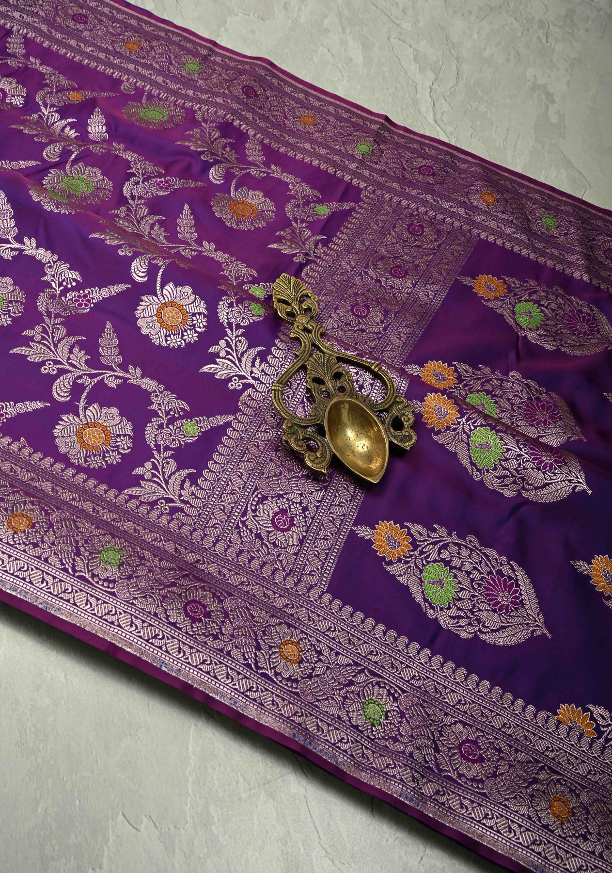 Eggplant Purple Meenakari Detailing on Banarasi Semi Mashru Silk Saree with Floral Jaal and Zari Border