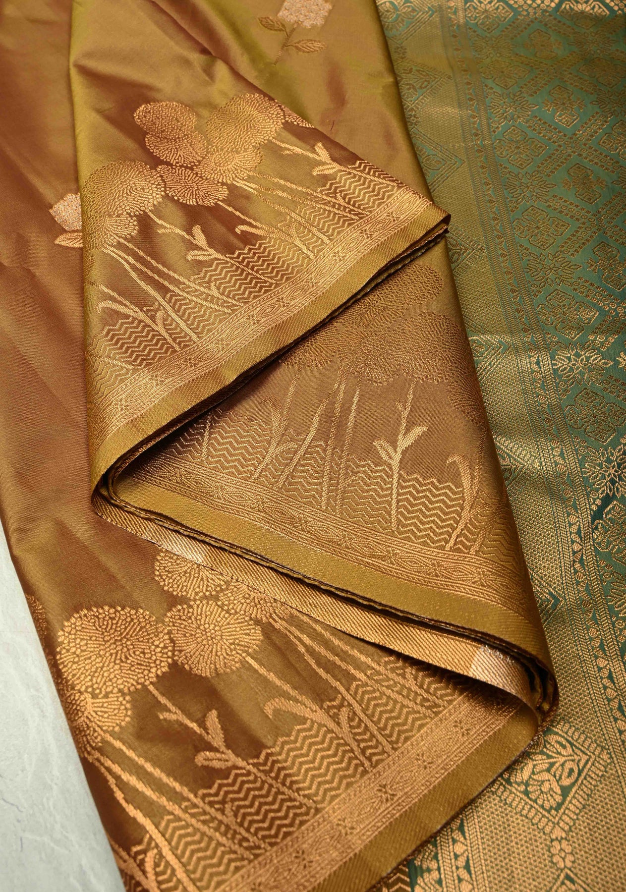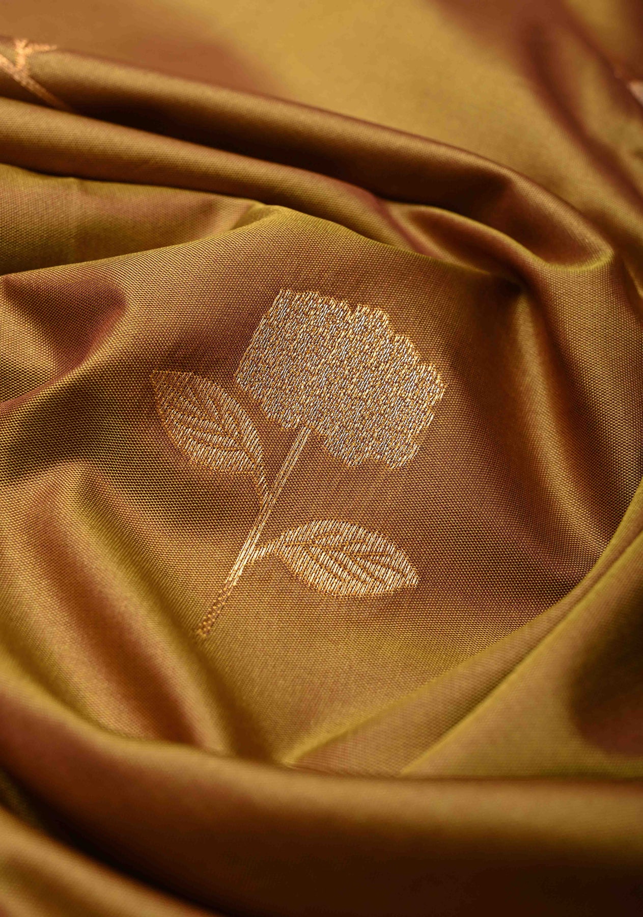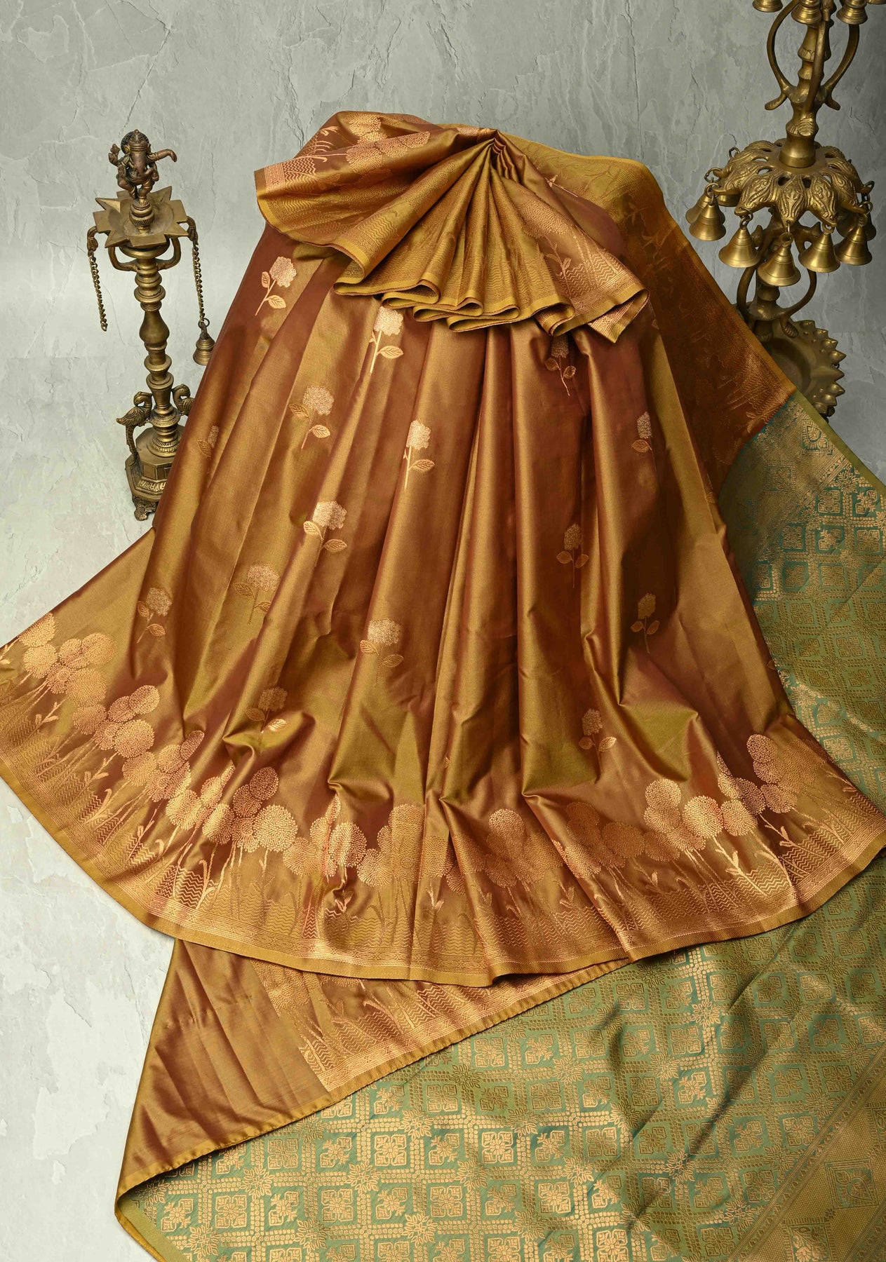 Exude timeless elegance with this Golden-Brown Dual Tone Kanchi Semi Silk Saree, a perfect blend of classic South Indian craftsmanship and contemporary charm. Woven from semi silk, the saree drapes gracefully while showcasing subtle dual-tone hues that enhance its appeal. Adorned with delicate floral Meenakari zari buttas across the body and a finely crafted zari border, this saree radiates sophistication and festive grandeur. Ideal for weddings, cultural celebrations, festive events, and special occasions, it effortlessly brings a regal touch to any ensemble.