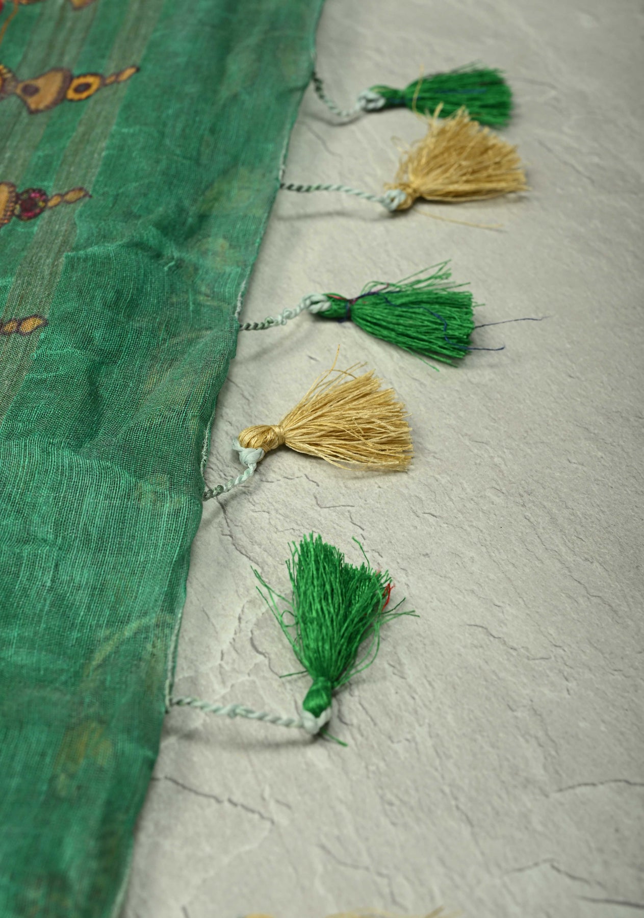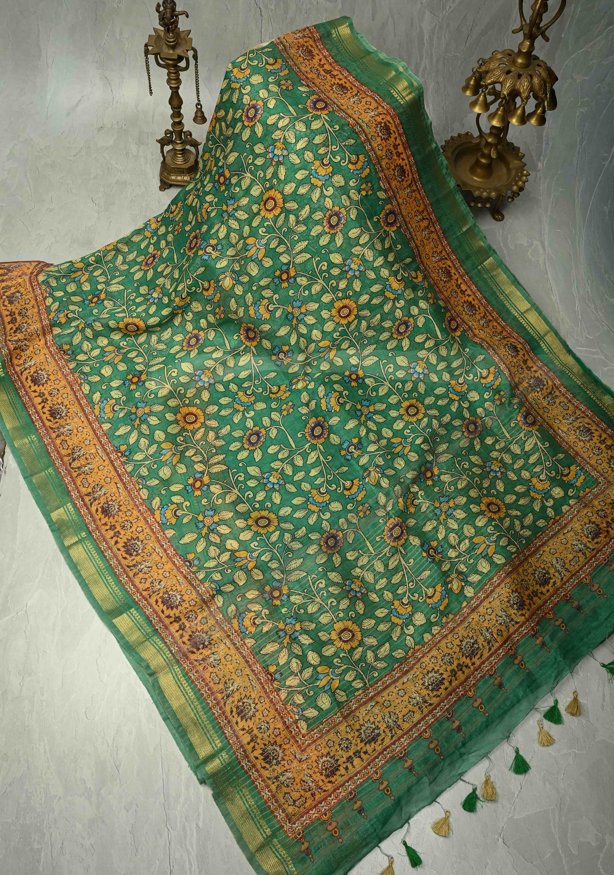 The classic Kalamkari Floral Digital Print infuses the saree with timeless, artistic charm, utilizing rich, earthy color tones that beautifully pop against the vibrant green base. A sleek, minimal Zari border adds a quiet touch of luxury, making this saree versatile enough to be dressed up with heavy jewelry for a festival or kept simple for a sophisticated professional look