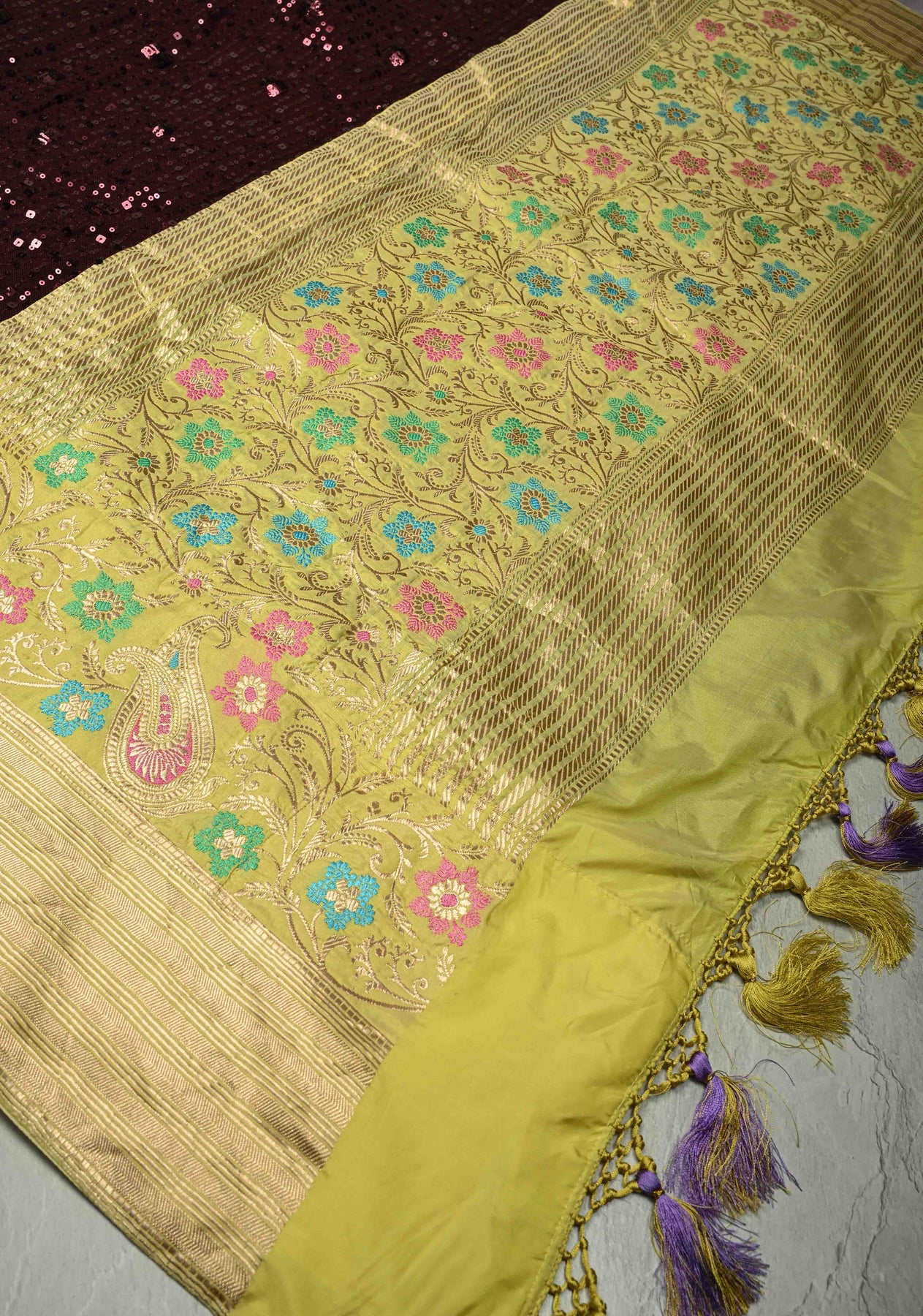 This Kanchana Tone-on-Tone Sequin Net Fusion Saree is a radiant blend of contemporary glamour and traditional luxury. The delicate net base is adorned with subtle tone-on-tone sequins that create a soft, shimmering effect, adding an ethereal elegance to the drape. Enhancing its richness is the exquisite two-side Banarasi pure silk border and pallu, woven with traditional motifs that infuse timeless grandeur into the modern silhouette. The fusion of sparkling net fabric with opulent Banarasi silk detailing makes this saree a perfect choice for weddings, receptions, and evening celebrations. Lightweight yet regal, it offers the ideal balance of sophistication, finesse, and festive charm.