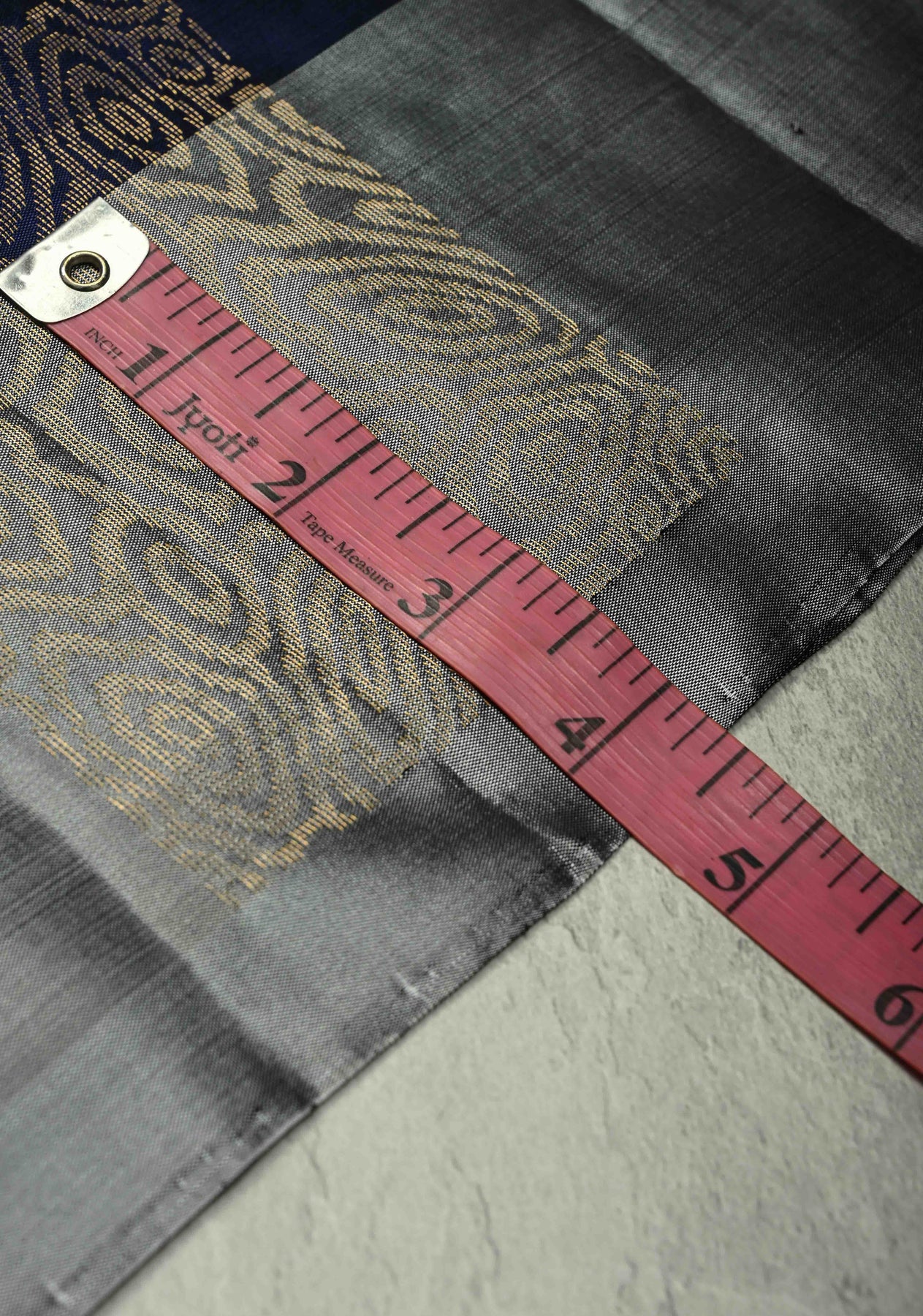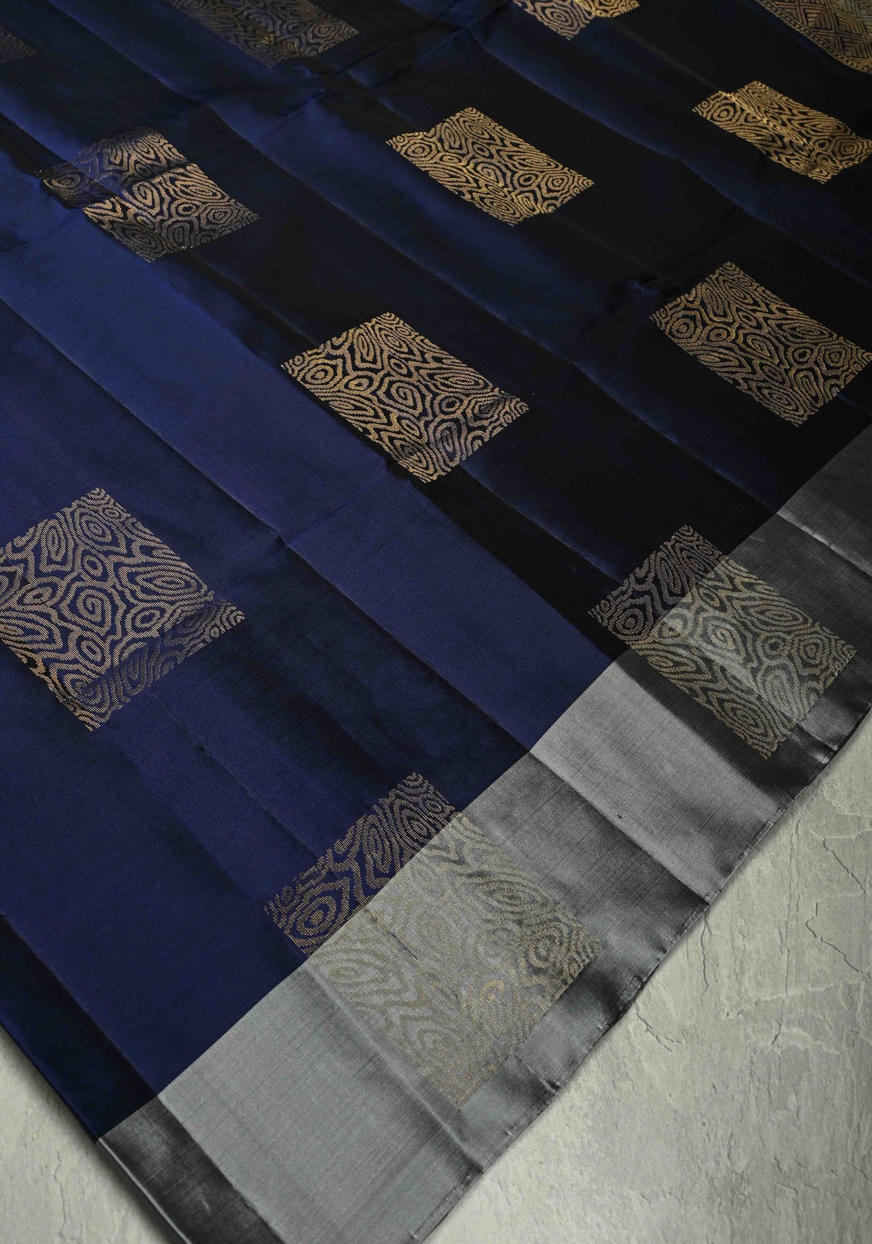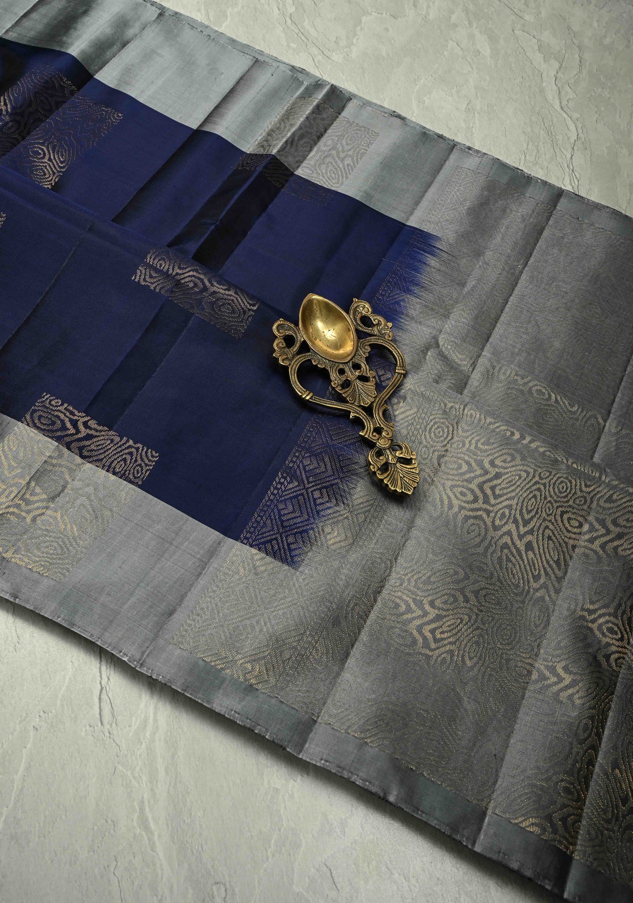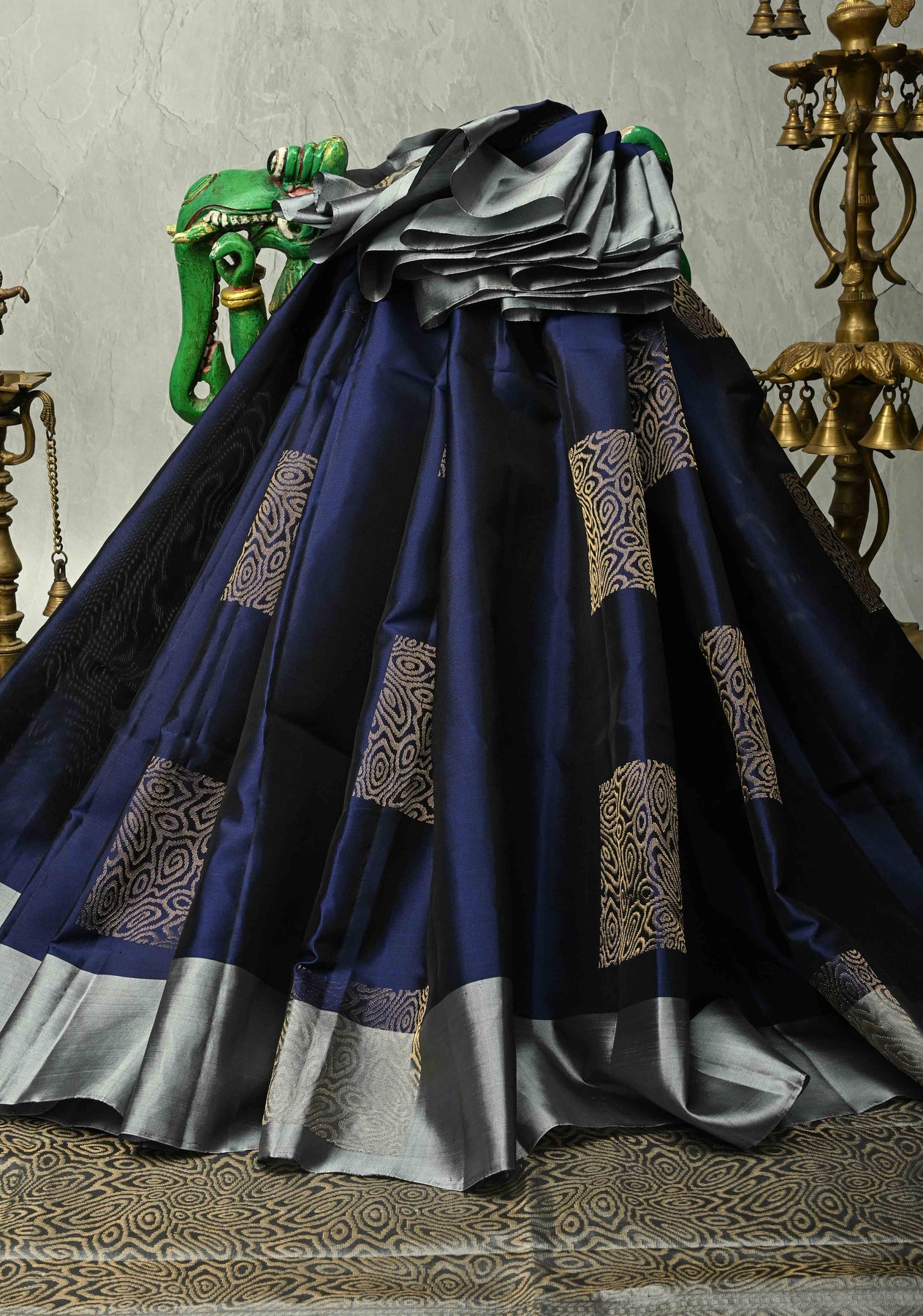 Navy Blue Zari Stripes on Kanjivaram Soft Silk Saree with Zari Buttas and Contrast Border | SILK MARK CERTIFIED